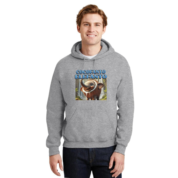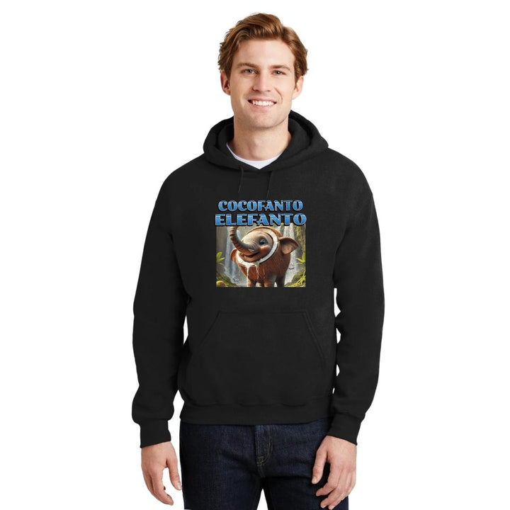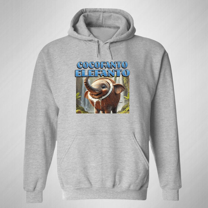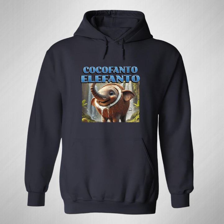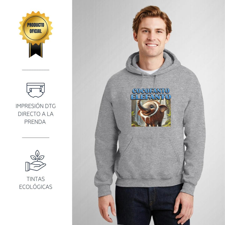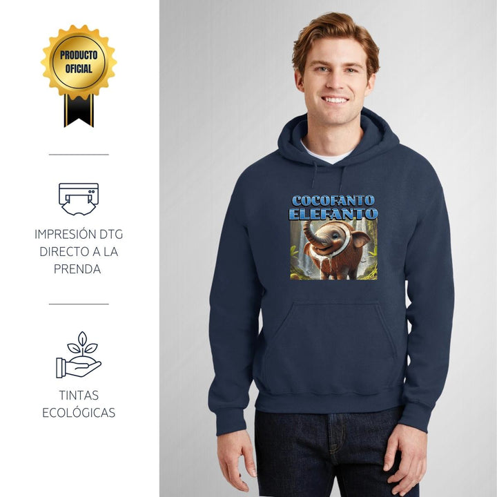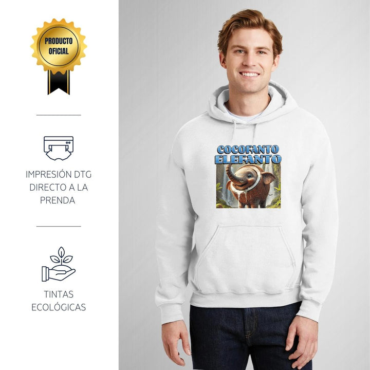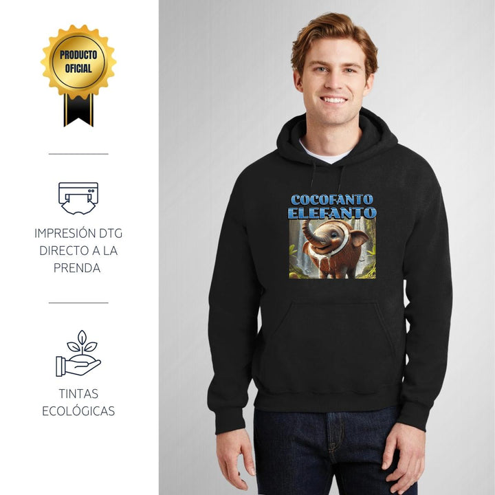 Sudadera hoodie de adulto con gorro o capucha y bolsillo frontal canguro, para hombre nueva, diseño Brainrot Cocofanto Elefanto original impreso con tecnología DTG (directo a la prenda) tacto cero, uso casual o deportiva, 50% algodón y 50% poliéster fleece pre encogido, estructura tubular con ajuste clásico. Colores de sudadera: Negro, Blanco, Azul Marino, Gris.