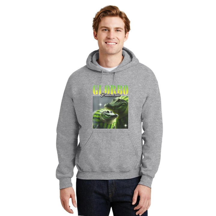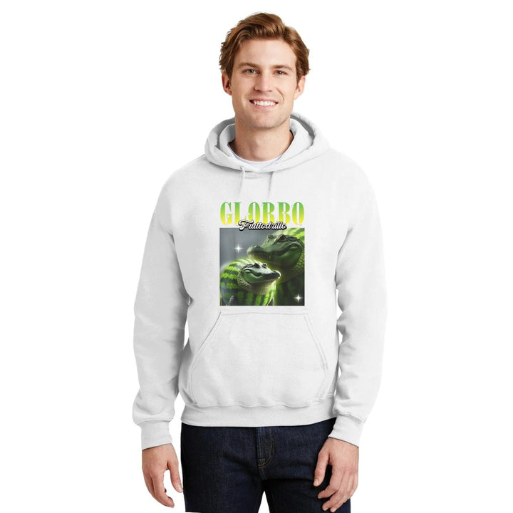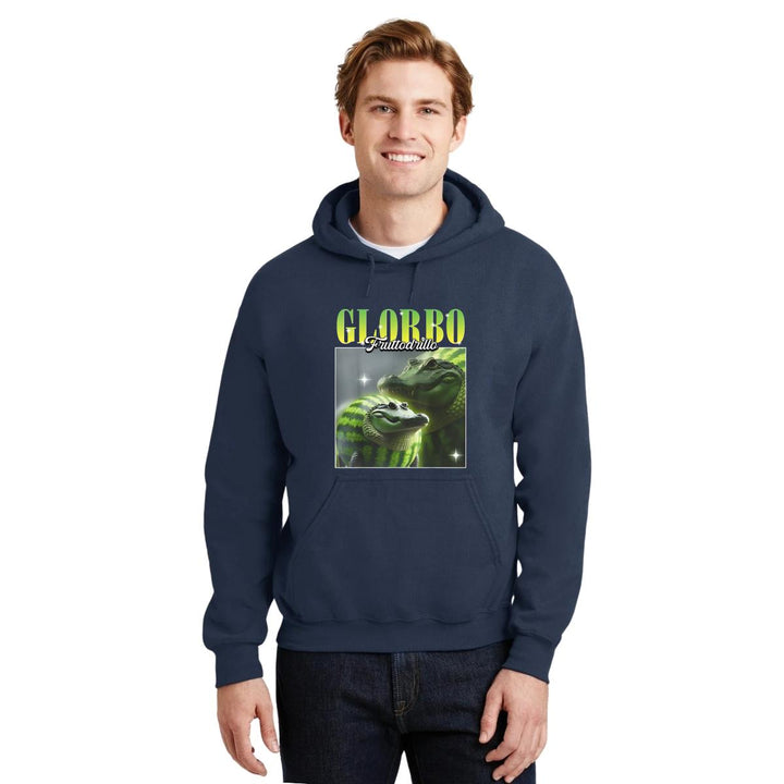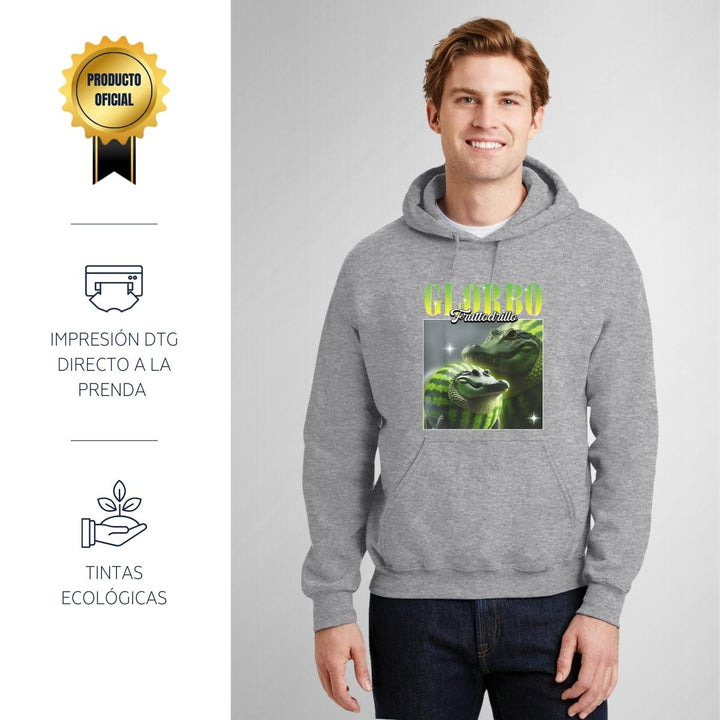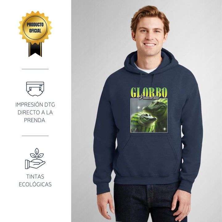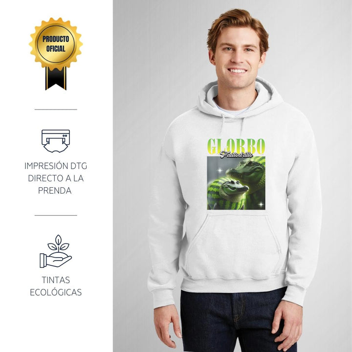 Sudadera hoodie de adulto con gorro o capucha y bolsillo frontal canguro, para hombre nueva, diseño Brainrot Glorbo Fruttodrillo original impreso con tecnología DTG (directo a la prenda) tacto cero, uso casual o deportiva, 50% algodón y 50% poliéster fleece pre encogido, estructura tubular con ajuste clásico. Colores de sudadera: Negro, Blanco, Azul Marino, Gris.