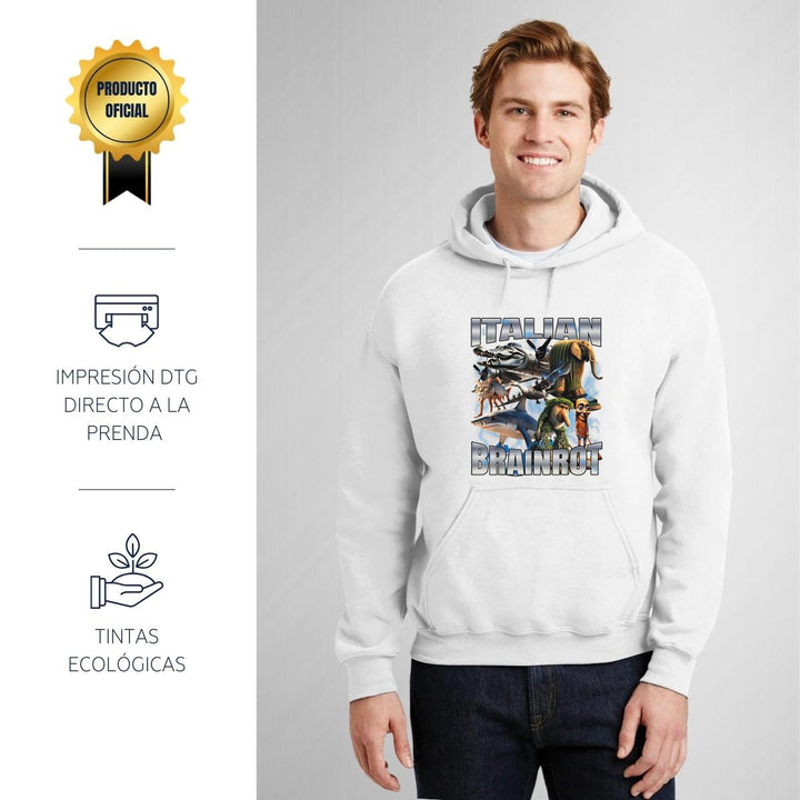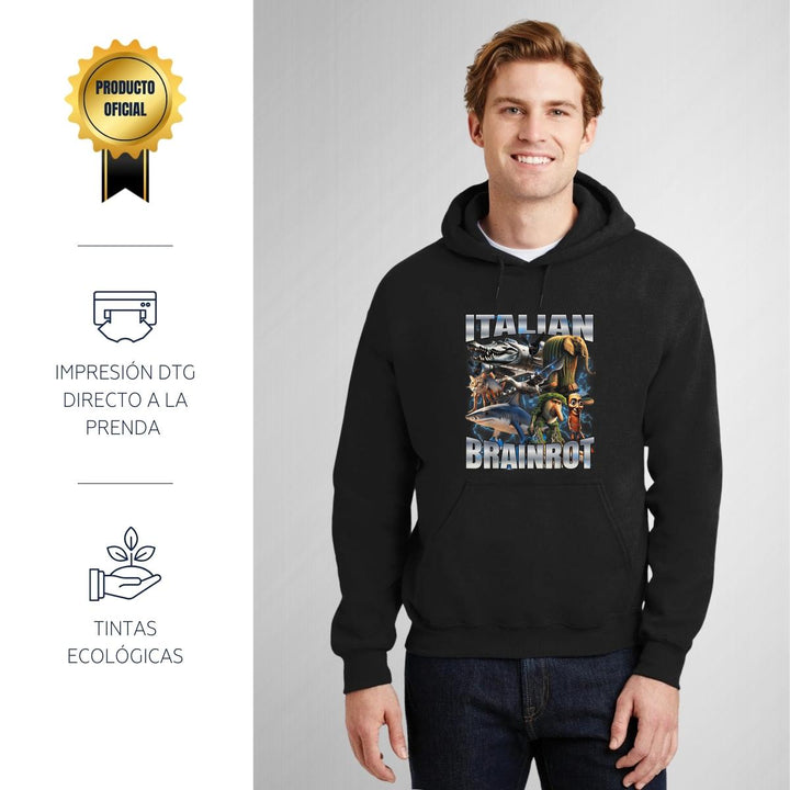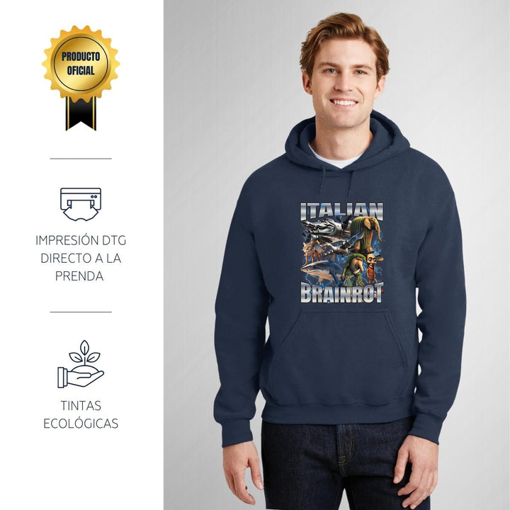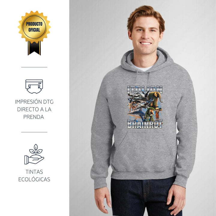 Sudadera hoodie de adulto con gorro o capucha y bolsillo frontal canguro, para hombre nueva, diseño Brainrot Italianos original impreso con tecnología DTG (directo a la prenda) tacto cero, uso casual o deportiva, 50% algodón y 50% poliéster fleece pre encogido, estructura tubular con ajuste clásico. Colores de sudadera: Negro, Blanco, Azul Marino, Gris.