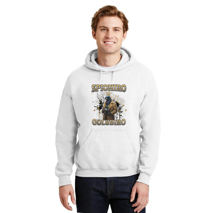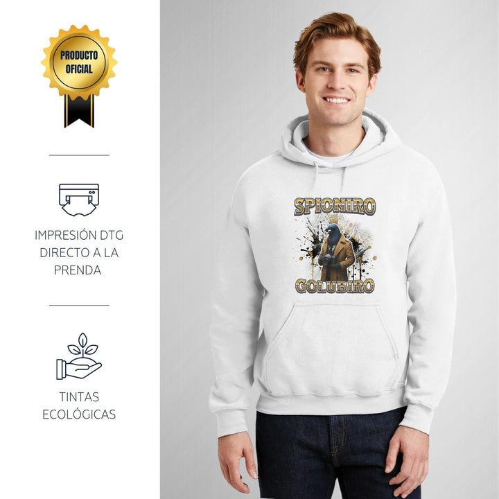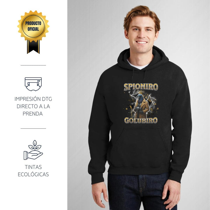 Sudadera hoodie de adulto con gorro o capucha y bolsillo frontal canguro, para hombre nueva, diseño Brainrot Spioniro Golubiro original impreso con tecnología DTG (directo a la prenda) tacto cero, uso casual o deportiva, 50% algodón y 50% poliéster fleece pre encogido, estructura tubular con ajuste clásico. Colores de sudadera: Negro, Blanco, Azul Marino, Gris.