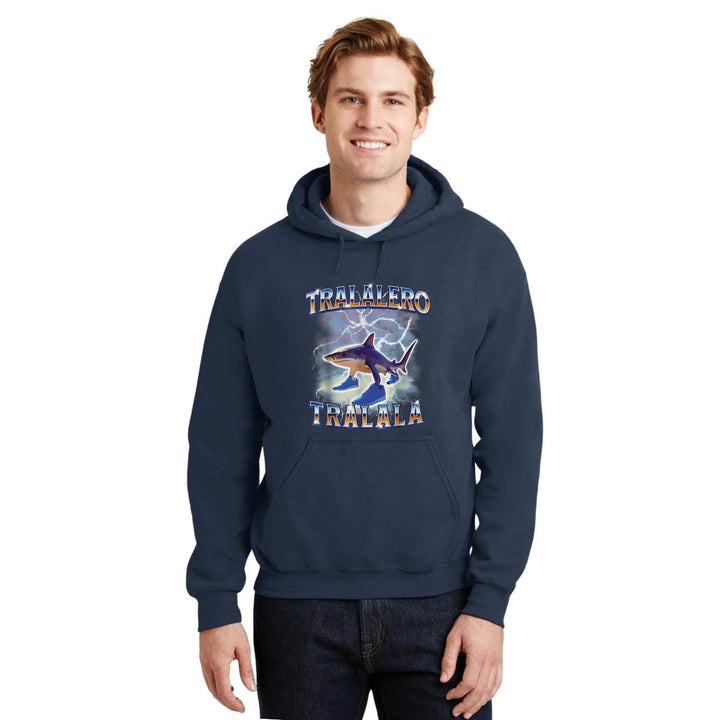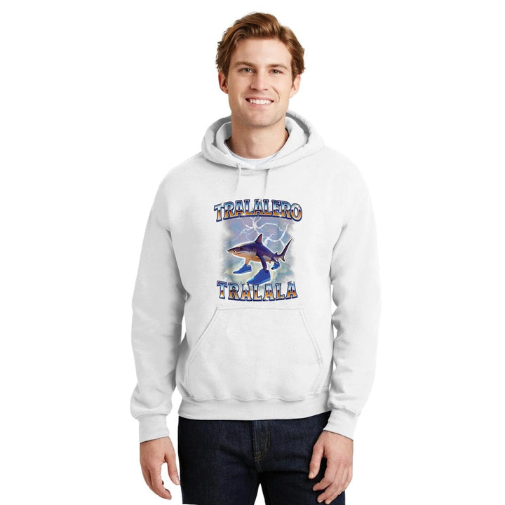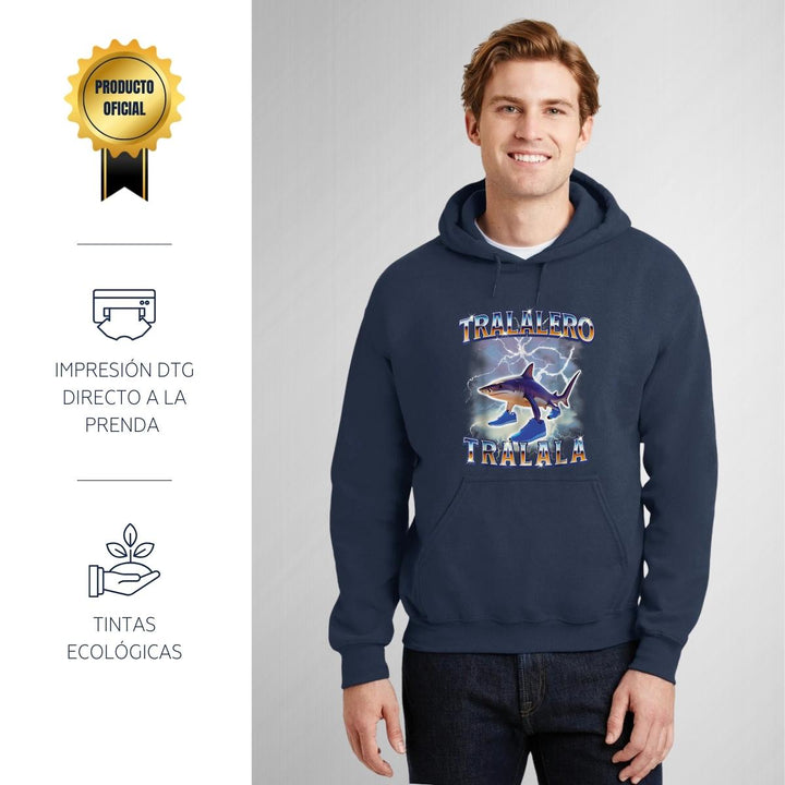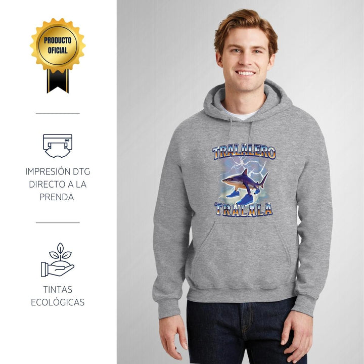 Sudadera hoodie de adulto con gorro o capucha y bolsillo frontal canguro, para hombre nueva, diseño Brainrot Tralalero Tralala original impreso con tecnología DTG (directo a la prenda) tacto cero, uso casual o deportiva, 50% algodón y 50% poliéster fleece pre encogido, estructura tubular con ajuste clásico. Colores de sudadera: Negro, Blanco, Azul Marino, Gris.