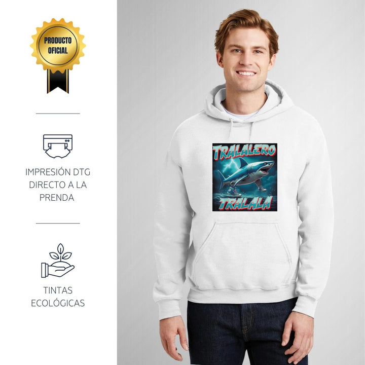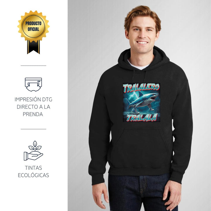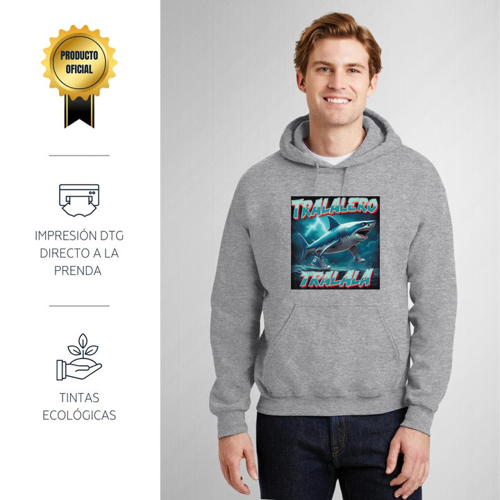 Sudadera hoodie de adulto con gorro o capucha y bolsillo frontal canguro, para hombre nueva, diseño Brainrot Tralalero Tralala original impreso con tecnología DTG (directo a la prenda) tacto cero, uso casual o deportiva, 50% algodón y 50% poliéster fleece pre encogido, estructura tubular con ajuste clásico. Colores de sudadera: Negro, Blanco, Azul Marino, Gris.