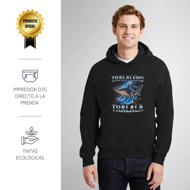Sudadera hoodie de adulto con gorro o capucha y bolsillo frontal canguro, para hombre nueva, diseño Brainrot Tralalero Tralala original impreso con tecnología DTG (directo a la prenda) tacto cero, uso casual o deportiva, 50% algodón y 50% poliéster fleece pre encogido, estructura tubular con ajuste clásico. Colores de sudadera: Negro, Blanco, Azul Marino, Gris.