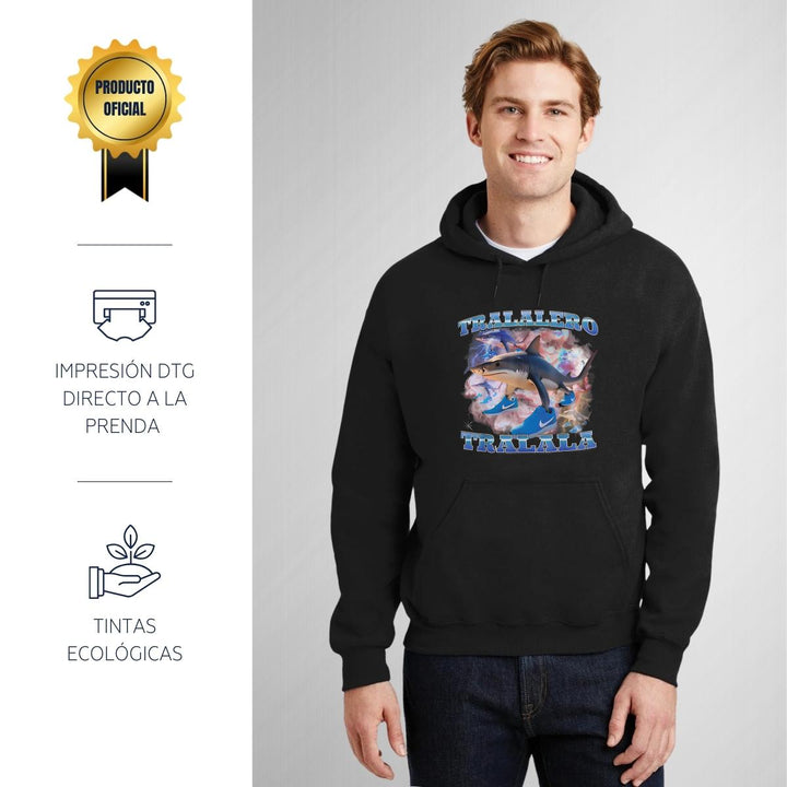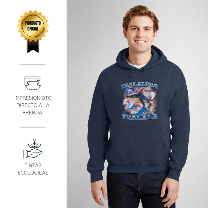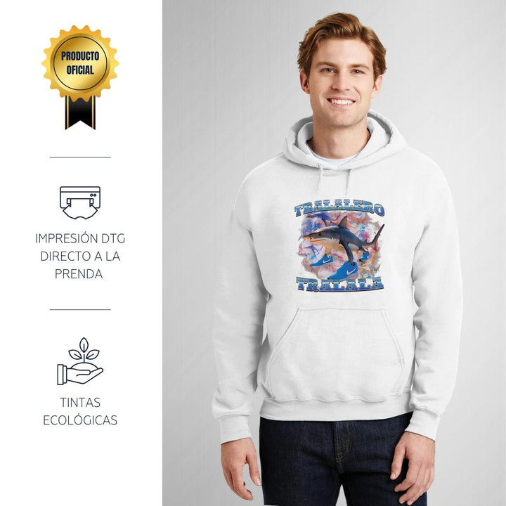 Sudadera hoodie de adulto con gorro o capucha y bolsillo frontal canguro, para hombre nueva, diseño Brainrot Tralalero Tralala original impreso con tecnología DTG (directo a la prenda) tacto cero, uso casual o deportiva, 50% algodón y 50% poliéster fleece pre encogido, estructura tubular con ajuste clásico. Colores de sudadera: Negro, Blanco, Azul Marino, Gris.