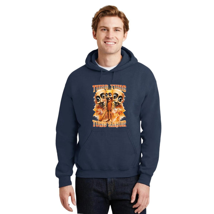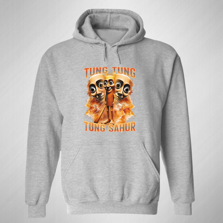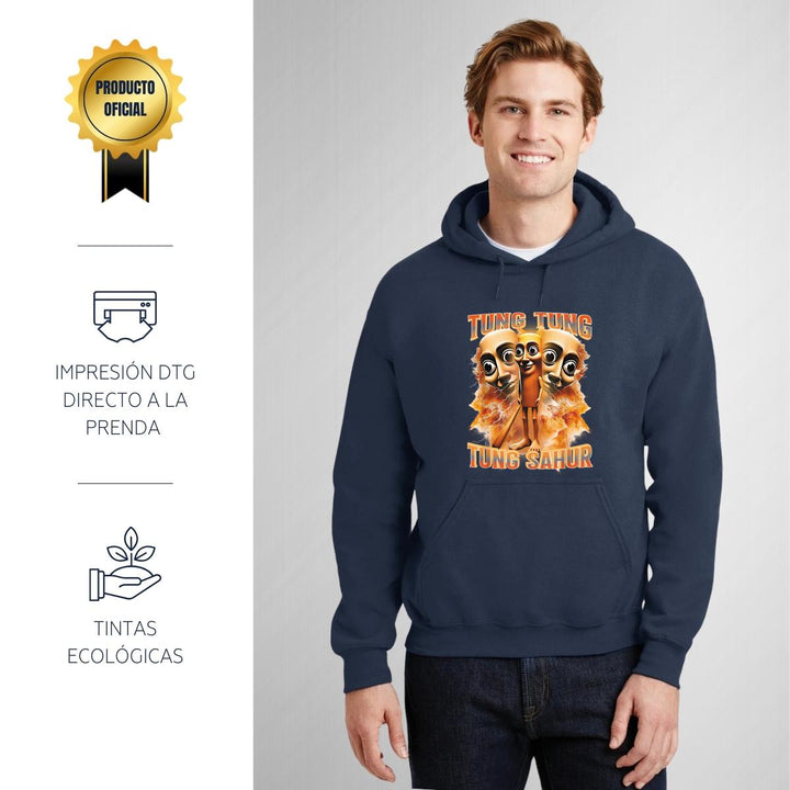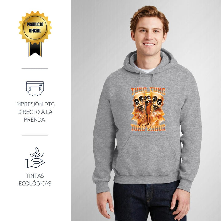 Sudadera hoodie de adulto con gorro o capucha y bolsillo frontal canguro, para hombre nueva, diseño Brainrot Tung Tung Tung Sahur original impreso con tecnología DTG (directo a la prenda) tacto cero, uso casual o deportiva, 50% algodón y 50% poliéster fleece pre encogido, estructura tubular con ajuste clásico. Colores de sudadera: Negro, Blanco, Azul Marino, Gris.