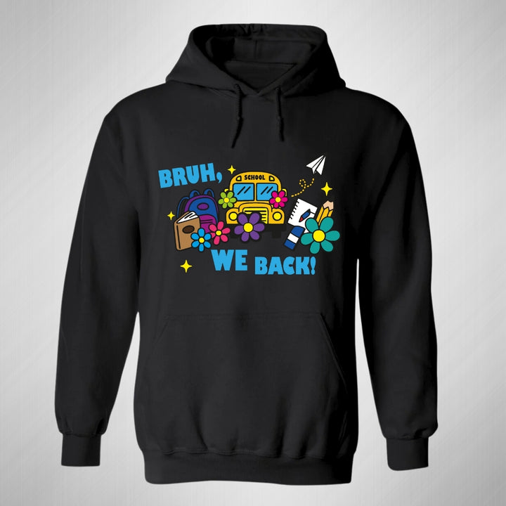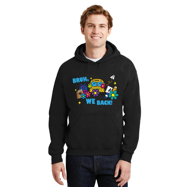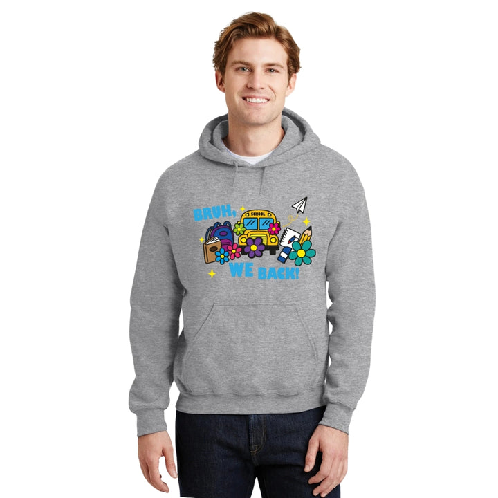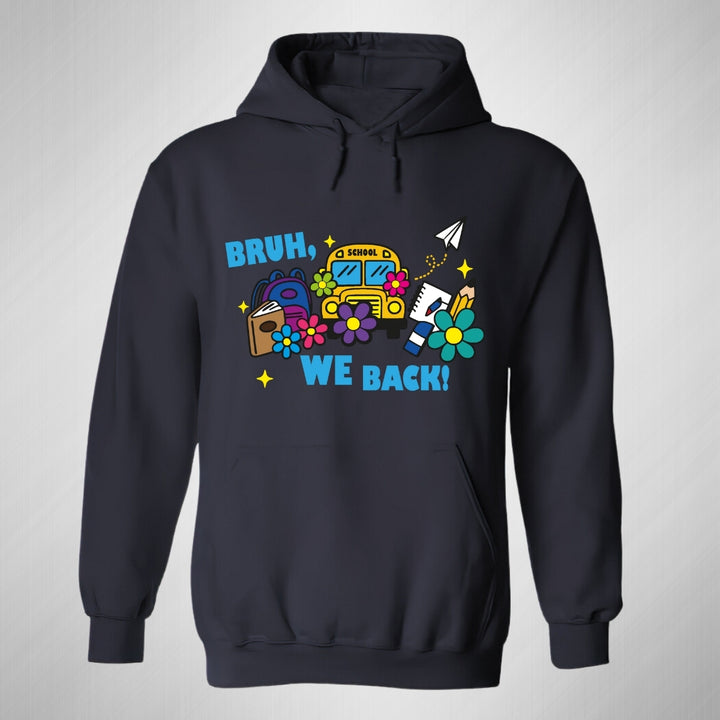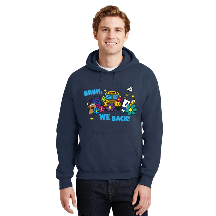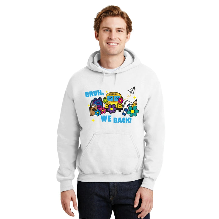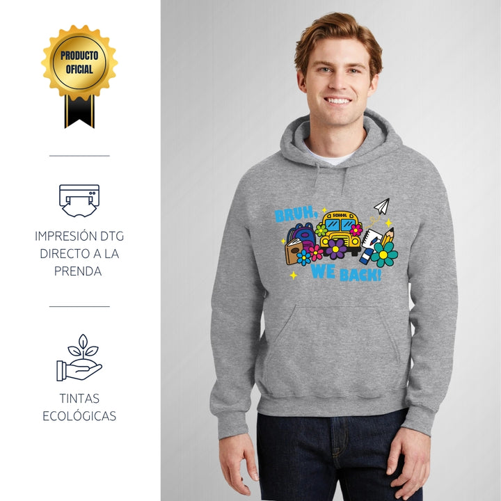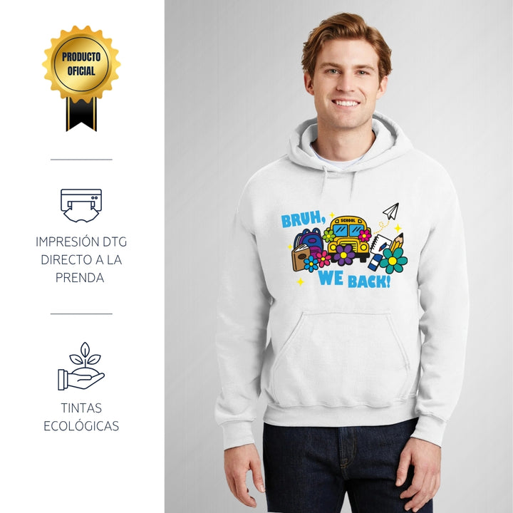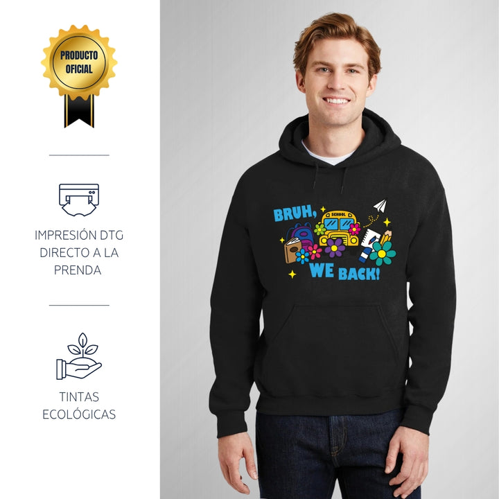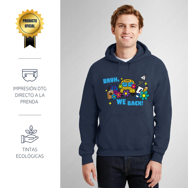 Sudadera hoodie de adulto con gorro o capucha y bolsillo frontal canguro, para hombre nueva, diseño Bruh We Back original impreso con tecnología DTG (directo a la prenda) tacto cero, uso casual o deportiva, 50% algodón y 50% poliéster fleece pre encogido, estructura tubular con ajuste clásico. Colores de sudadera: Negro, Blanco, Azul Marino, Gris.