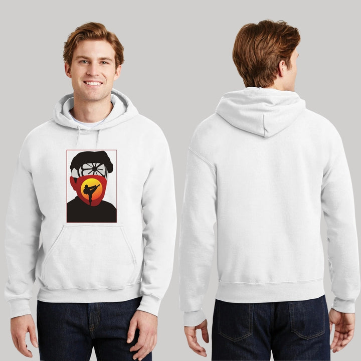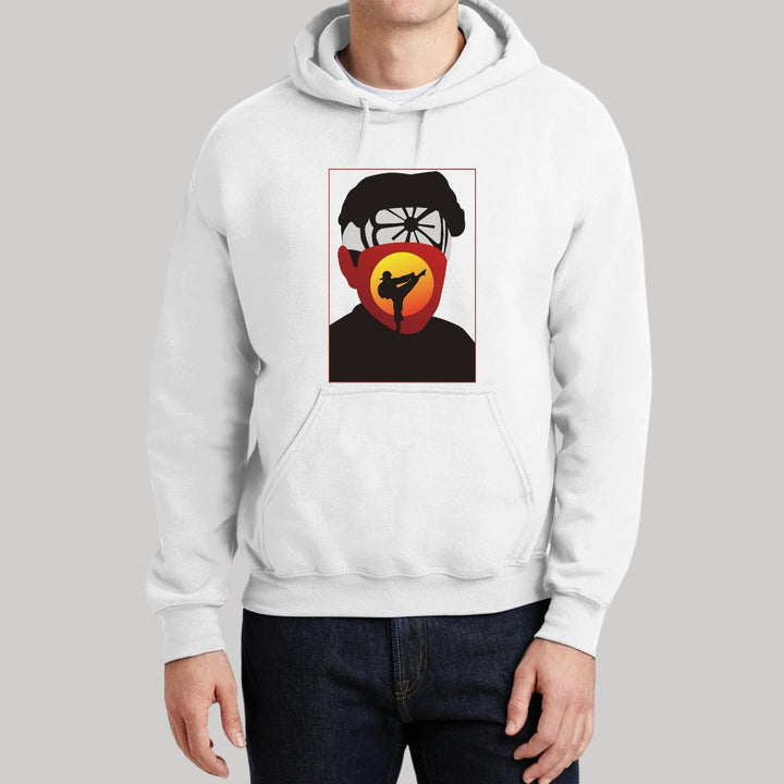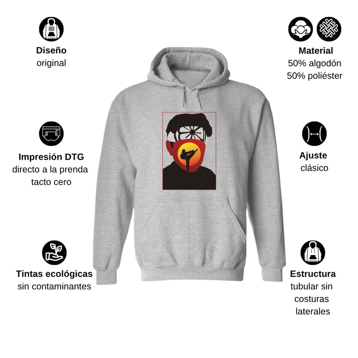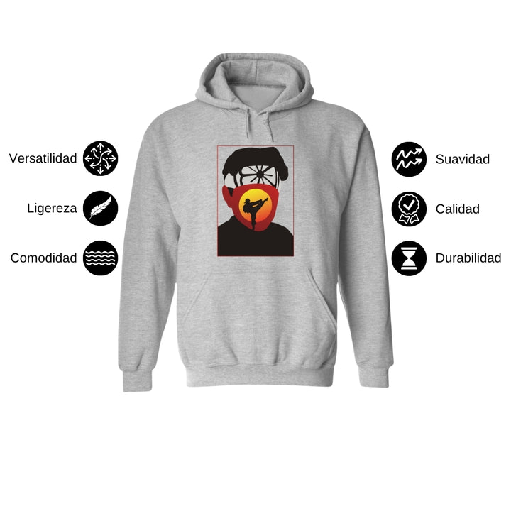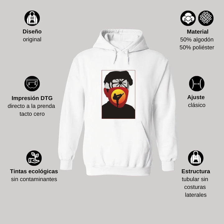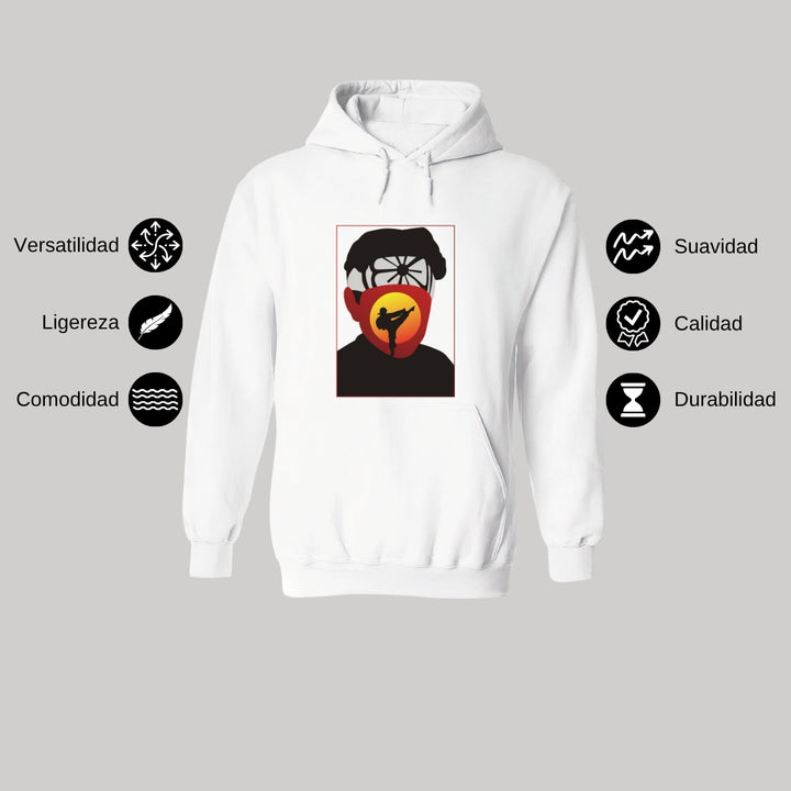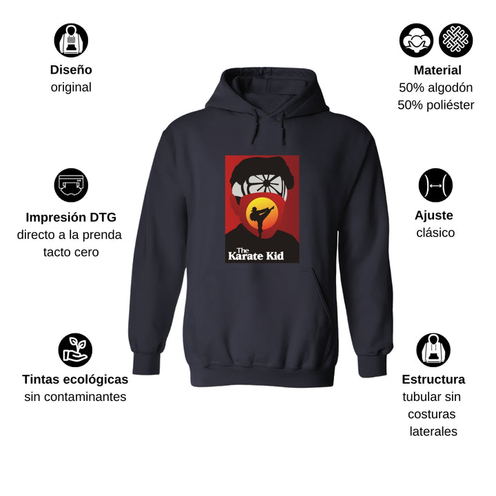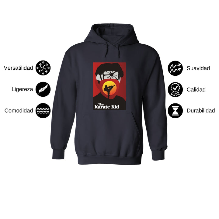 Sudadera hoodie de adulto con gorro o capucha y bolsillo frontal canguro, para hombre nueva, diseño Karate Kid original impreso con tecnología DTG (directo a la prenda) tacto cero, uso casual o deportiva, 50% algodón y 50% poliéster fleece pre encogido, estructura tubular con ajuste clásico. Colores de sudadera: Negro, Blanco, Azul Marino, Gris.