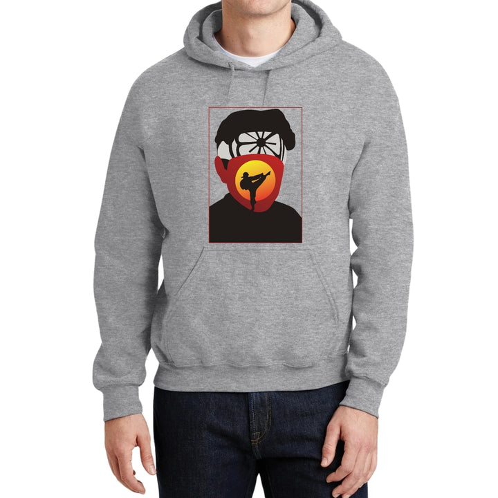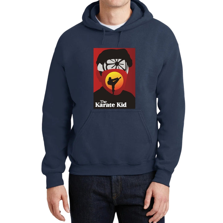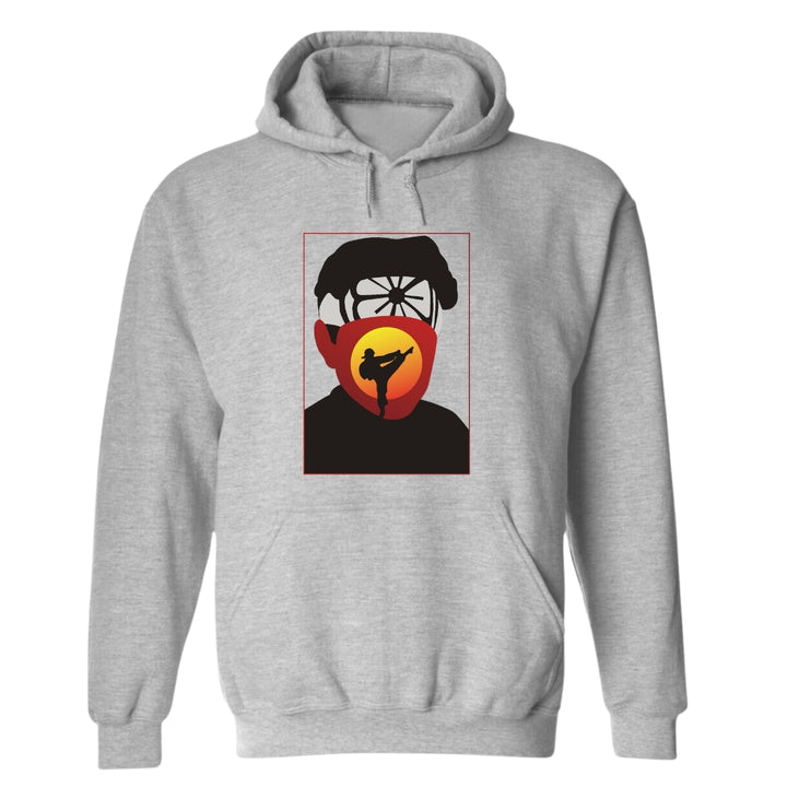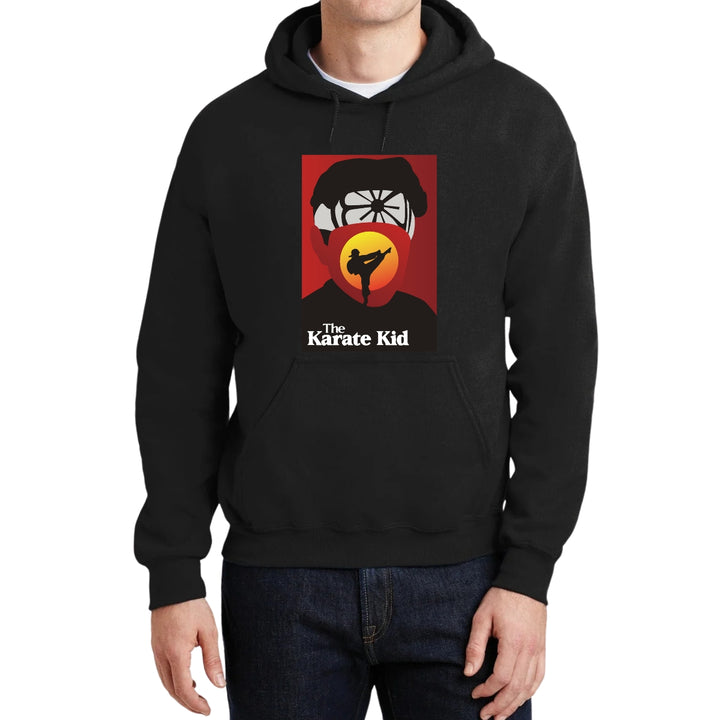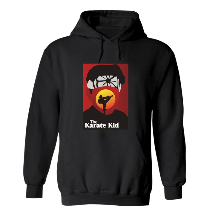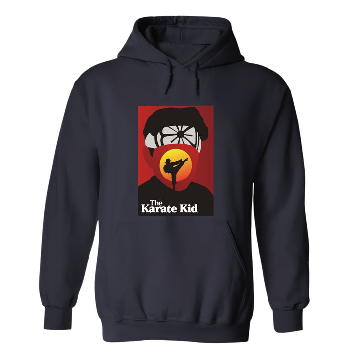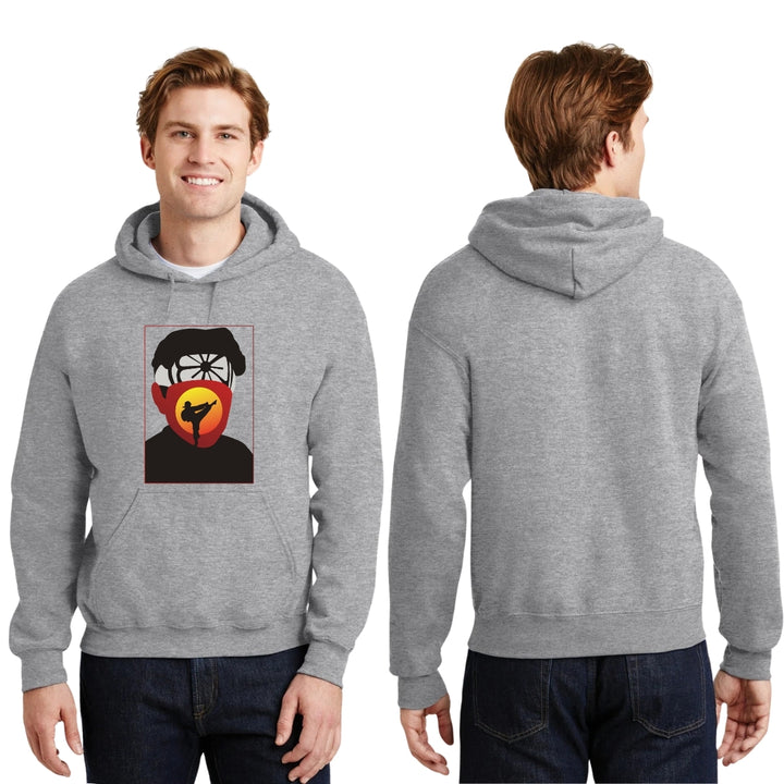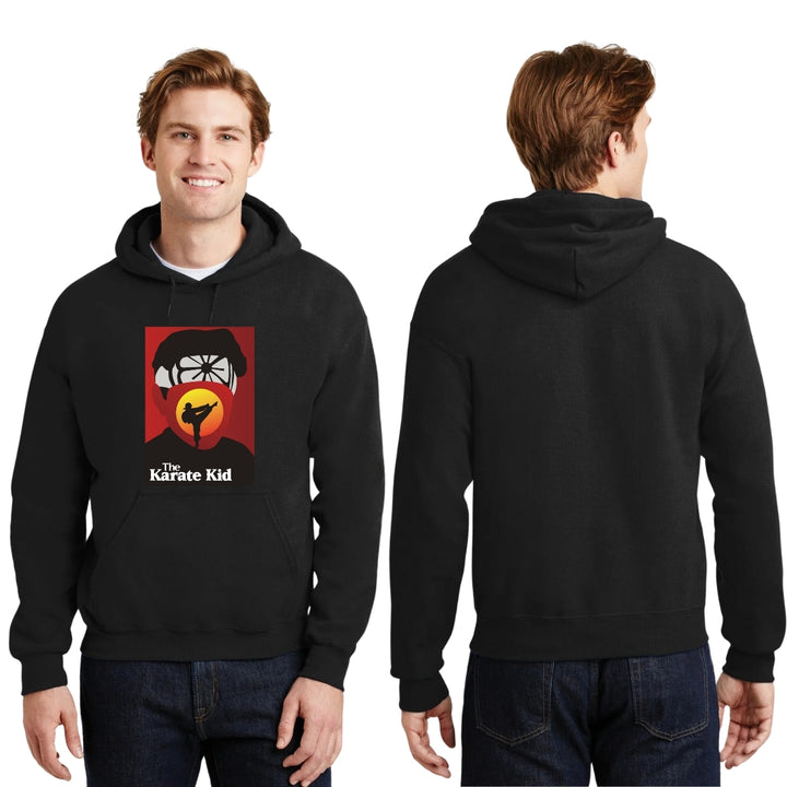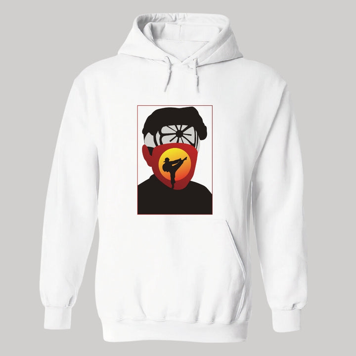 Sudadera hoodie de adulto con gorro o capucha y bolsillo frontal canguro, para hombre nueva, diseño Karate Kid original impreso con tecnología DTG (directo a la prenda) tacto cero, uso casual o deportiva, 50% algodón y 50% poliéster fleece pre encogido, estructura tubular con ajuste clásico. Colores de sudadera: Negro, Blanco, Azul Marino, Gris.
