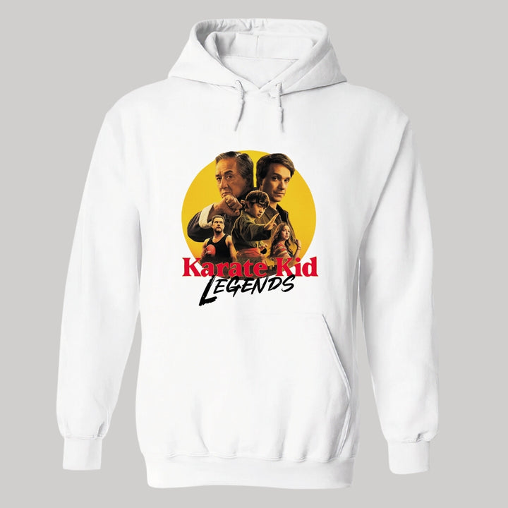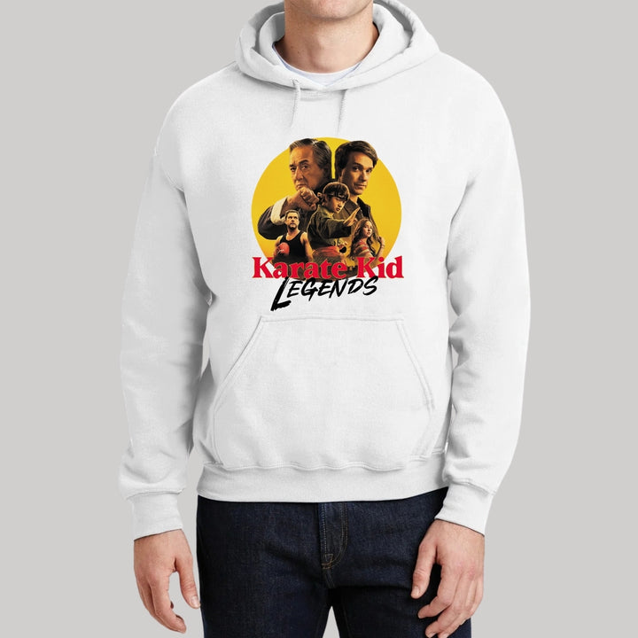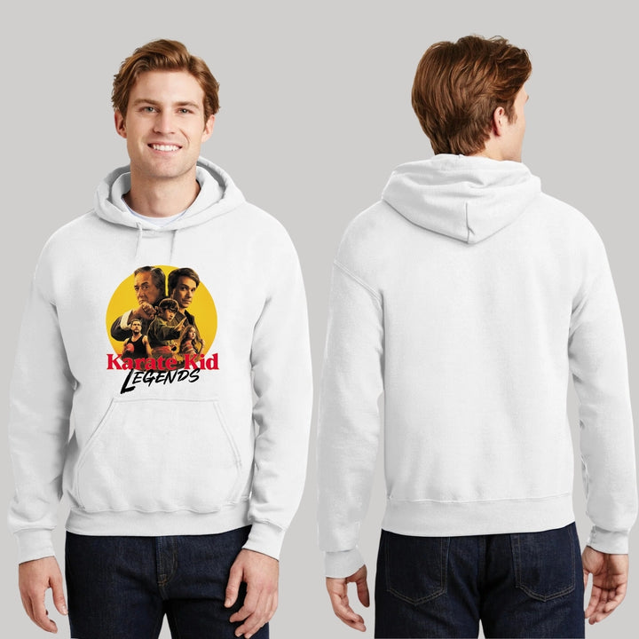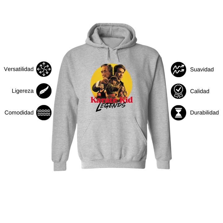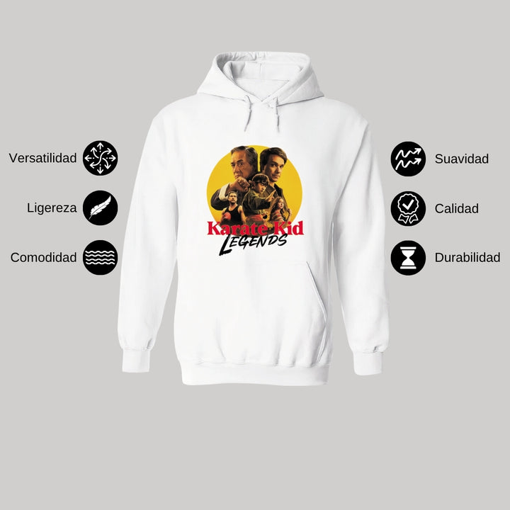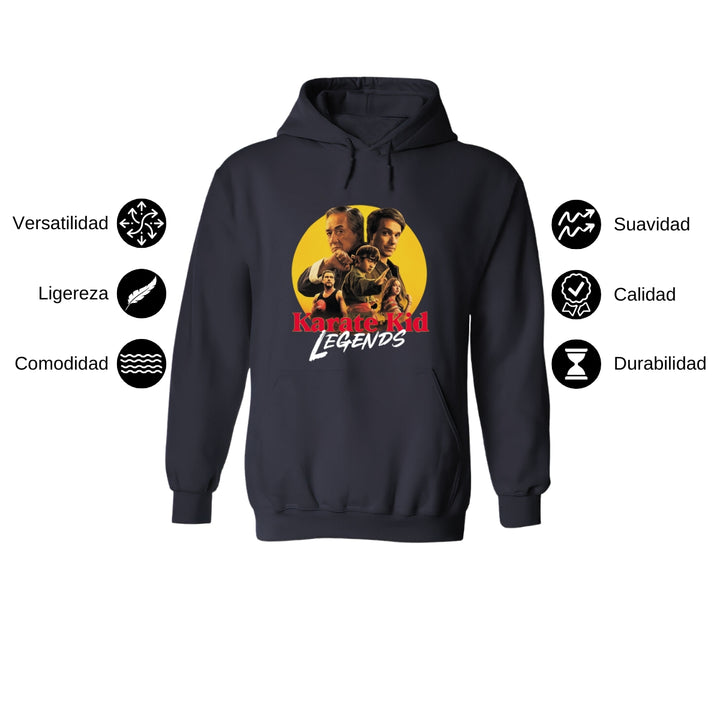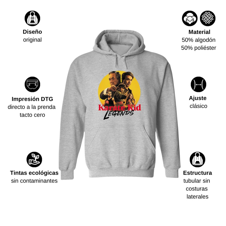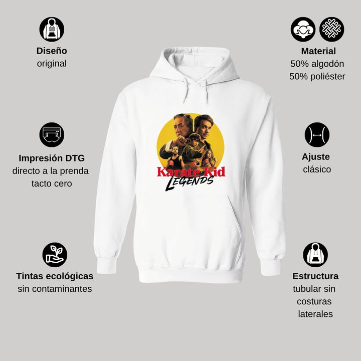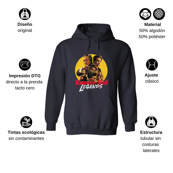Sudadera hoodie de adulto con gorro o capucha y bolsillo frontal canguro, para hombre nueva, diseño Karate Kid Leyendas original impreso con tecnología DTG (directo a la prenda) tacto cero, uso casual o deportiva, 50% algodón y 50% poliéster fleece pre encogido, estructura tubular con ajuste clásico. Colores de sudadera: Negro, Blanco, Azul Marino, Gris.