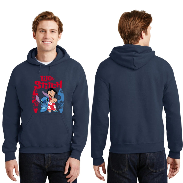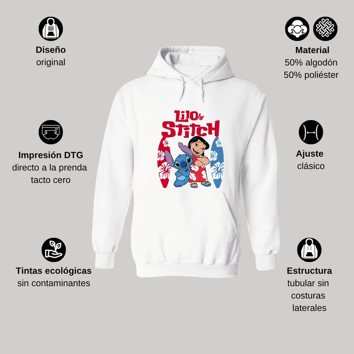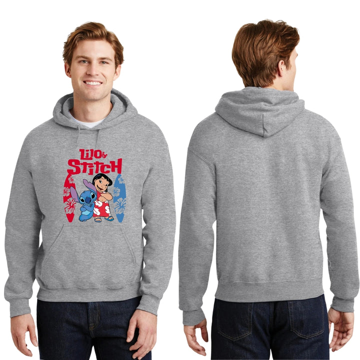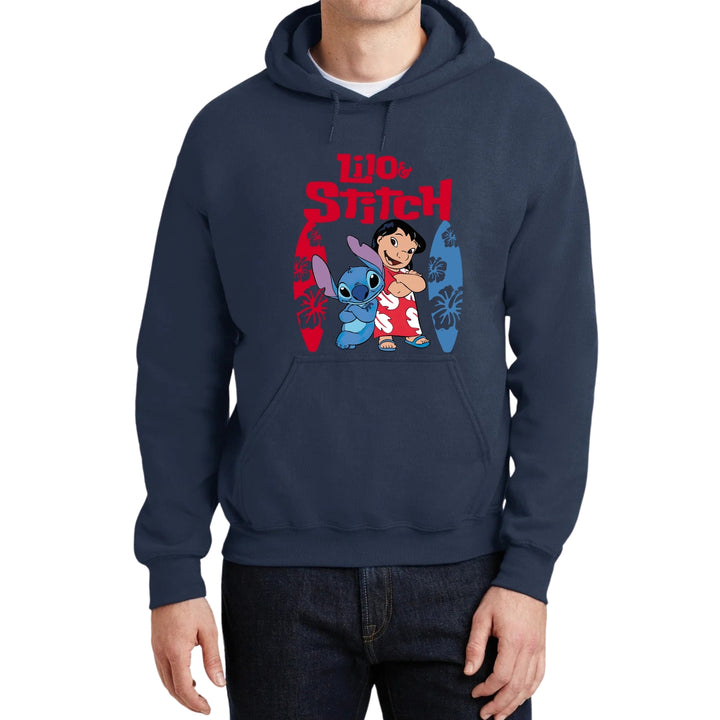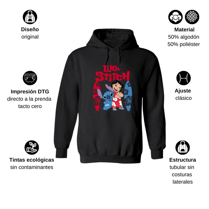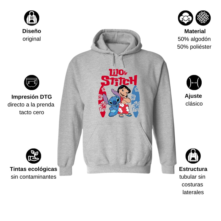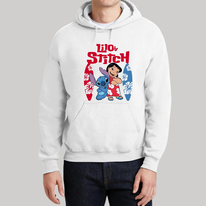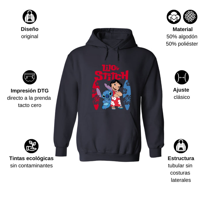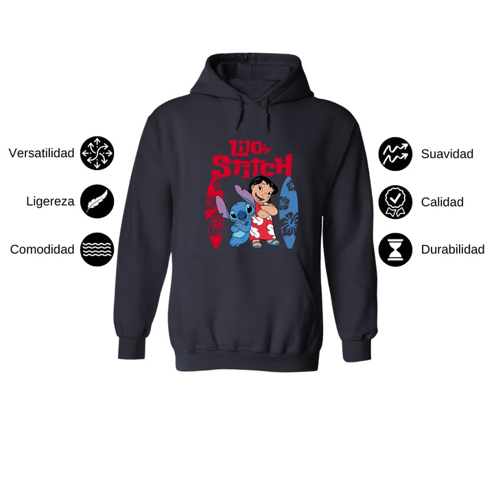 Sudadera hoodie de adulto con gorro o capucha y bolsillo frontal canguro, para hombre nueva, diseño Lilo y Stitch original impreso con tecnología DTG (directo a la prenda) tacto cero, uso casual o deportiva, 50% algodón y 50% poliéster fleece pre encogido, estructura tubular con ajuste clásico. Colores de sudadera: Azul Marino, Blanco, Negro, Gris.