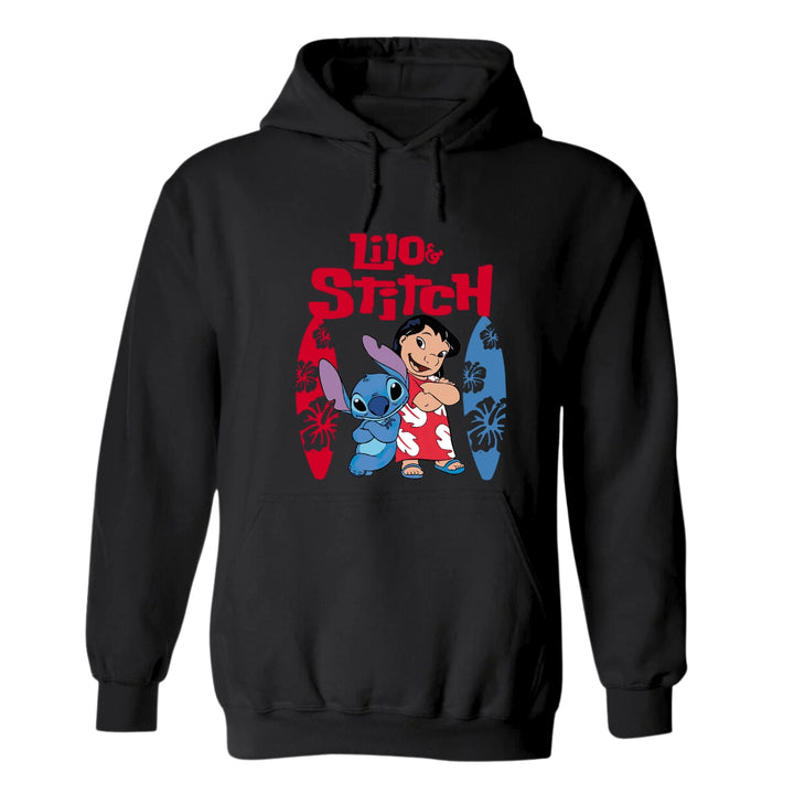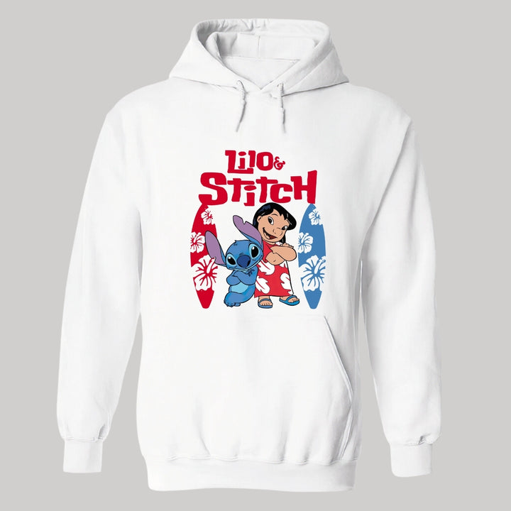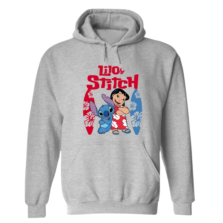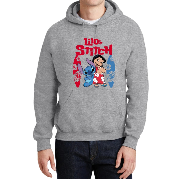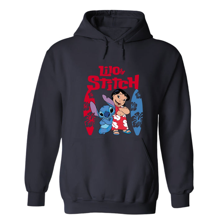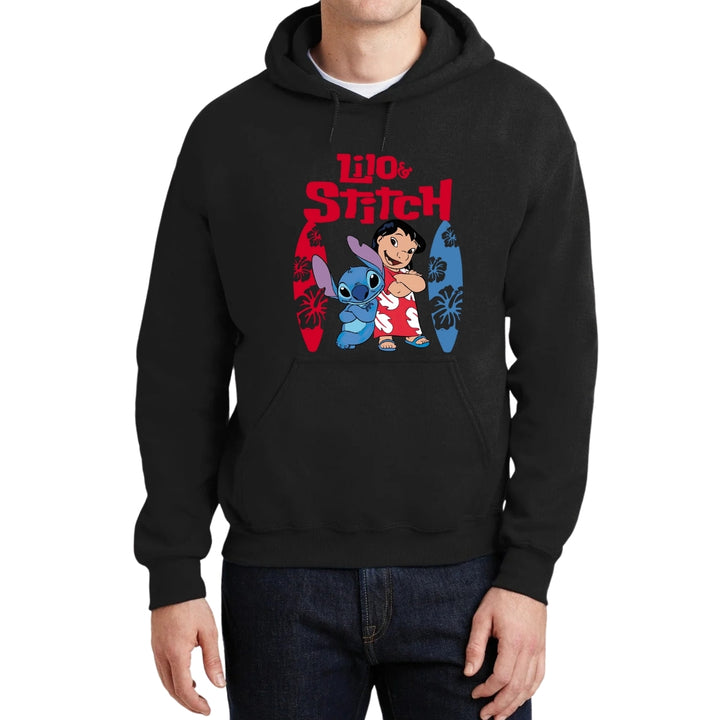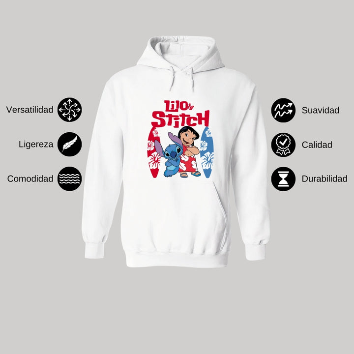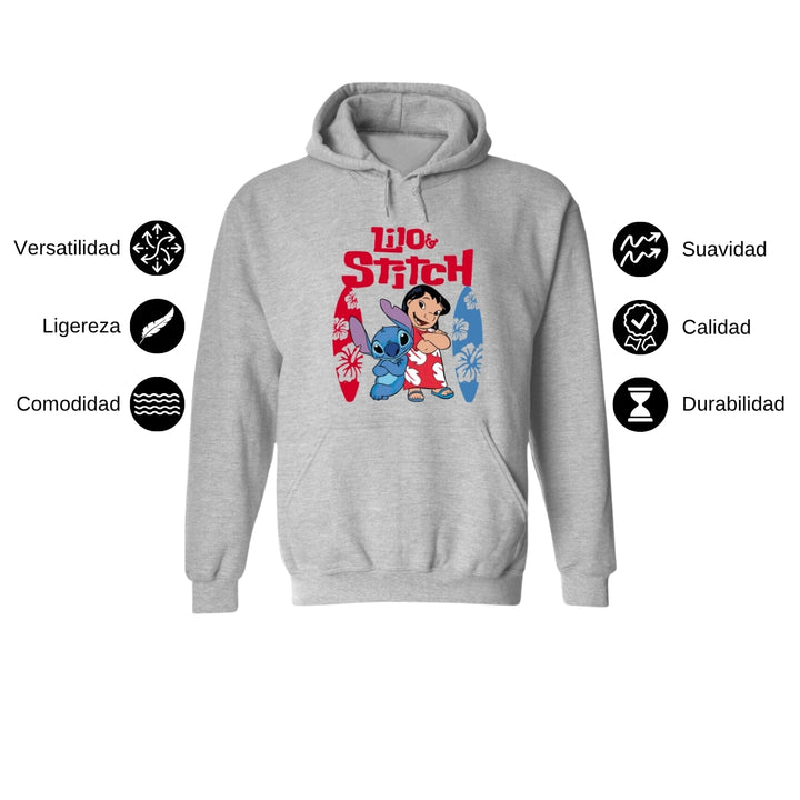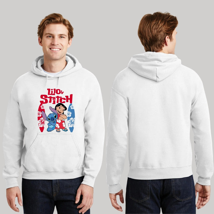 Sudadera hoodie de adulto con gorro o capucha y bolsillo frontal canguro, para hombre nueva, diseño Lilo y Stitch original impreso con tecnología DTG (directo a la prenda) tacto cero, uso casual o deportiva, 50% algodón y 50% poliéster fleece pre encogido, estructura tubular con ajuste clásico. Colores de sudadera: Azul Marino, Blanco, Negro, Gris.