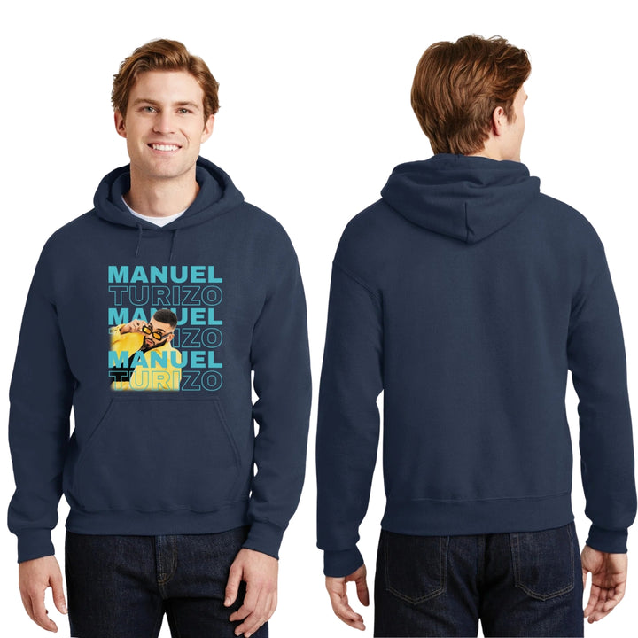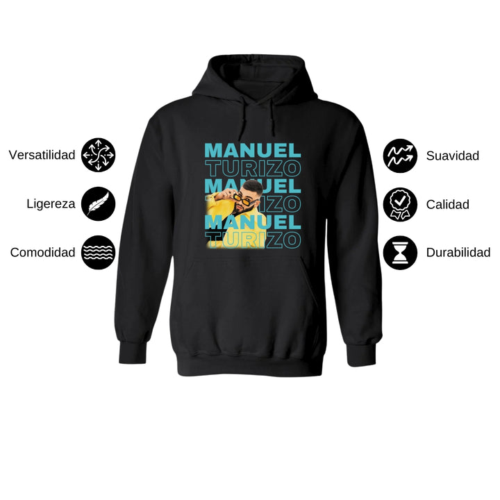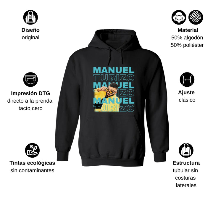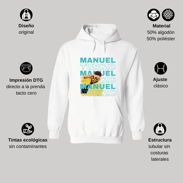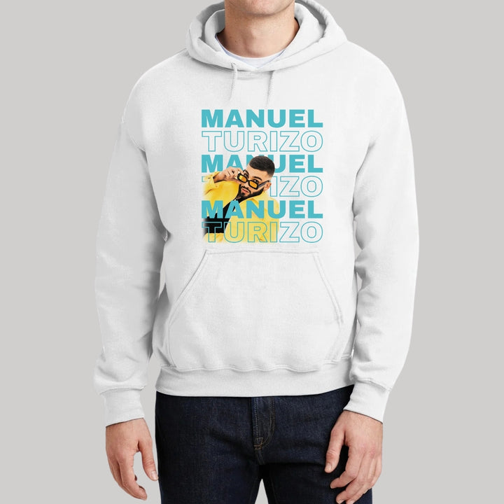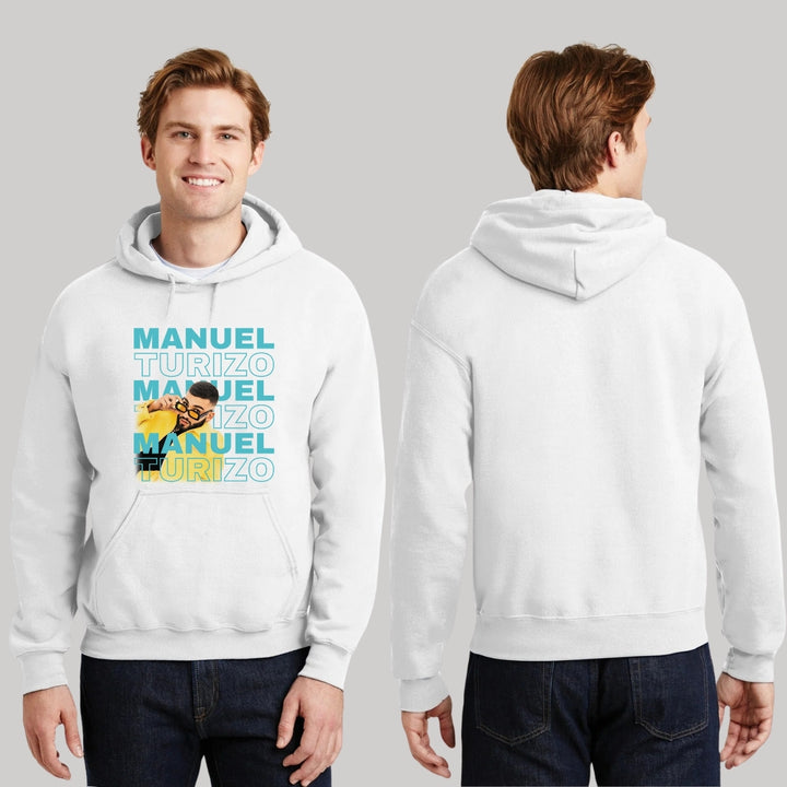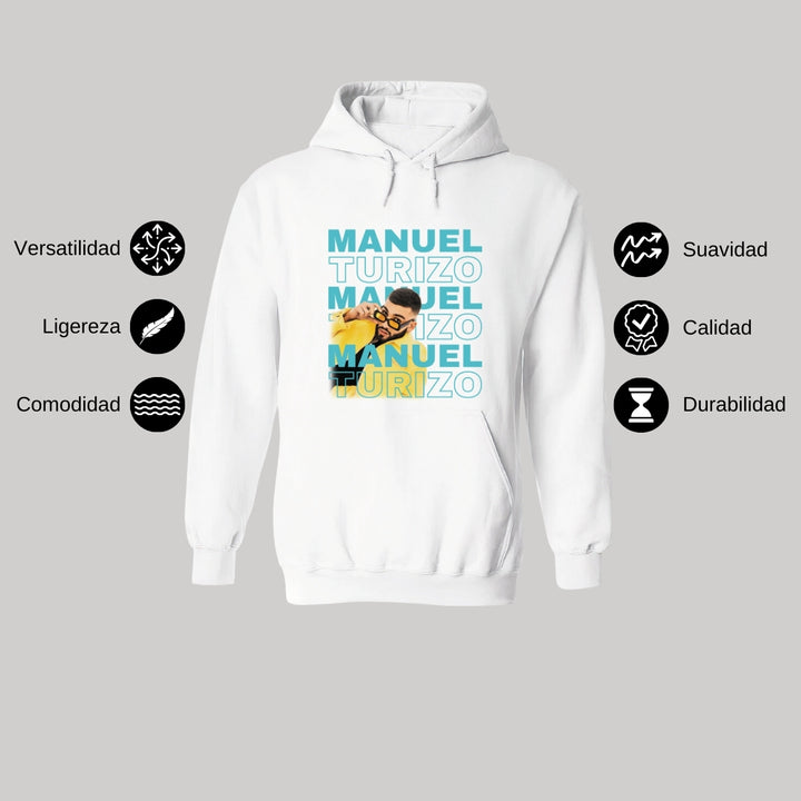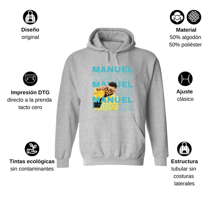 Sudadera hoodie de adulto con gorro o capucha y bolsillo frontal canguro, para hombre nueva, diseño Manuel Turizo Tour original impreso con tecnología DTG (directo a la prenda) tacto cero, uso casual o deportiva, 50% algodón y 50% poliéster fleece pre encogido, estructura tubular con ajuste clásico. Colores de sudadera: Negro, Blanco, Azul Marino, Gris.