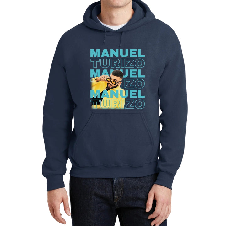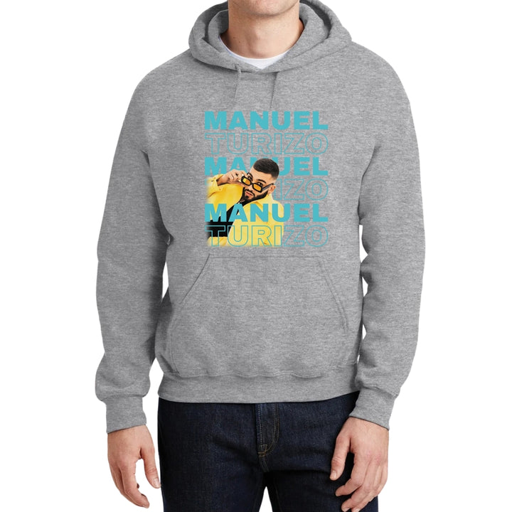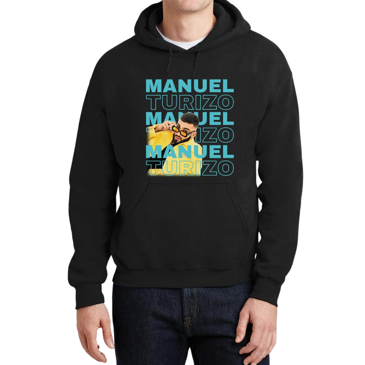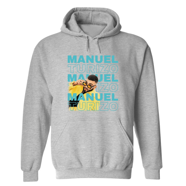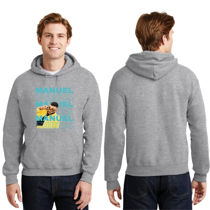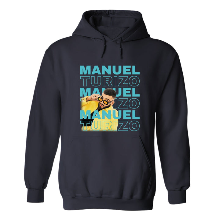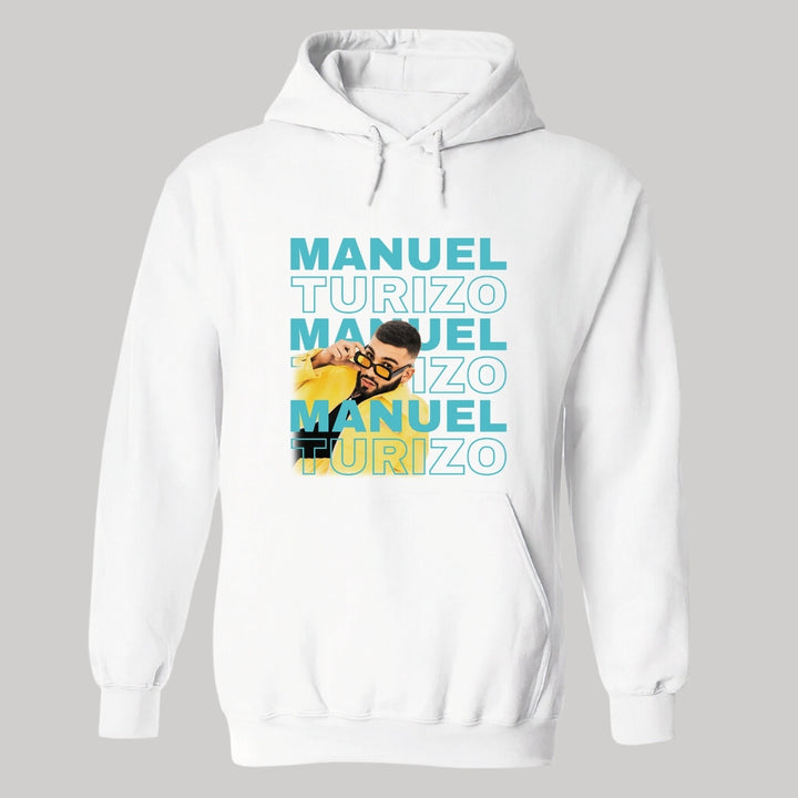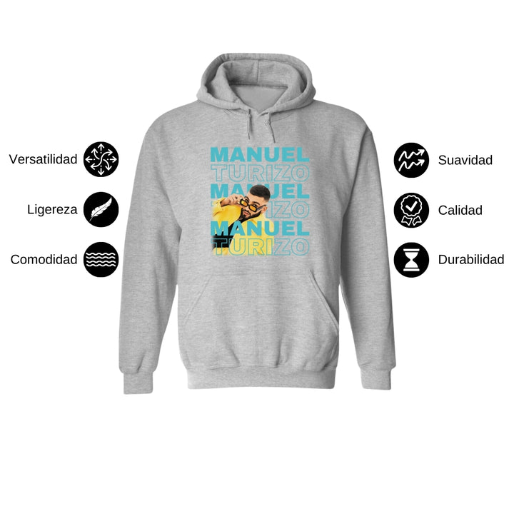 Sudadera hoodie de adulto con gorro o capucha y bolsillo frontal canguro, para hombre nueva, diseño Manuel Turizo Tour original impreso con tecnología DTG (directo a la prenda) tacto cero, uso casual o deportiva, 50% algodón y 50% poliéster fleece pre encogido, estructura tubular con ajuste clásico. Colores de sudadera: Negro, Blanco, Azul Marino, Gris.