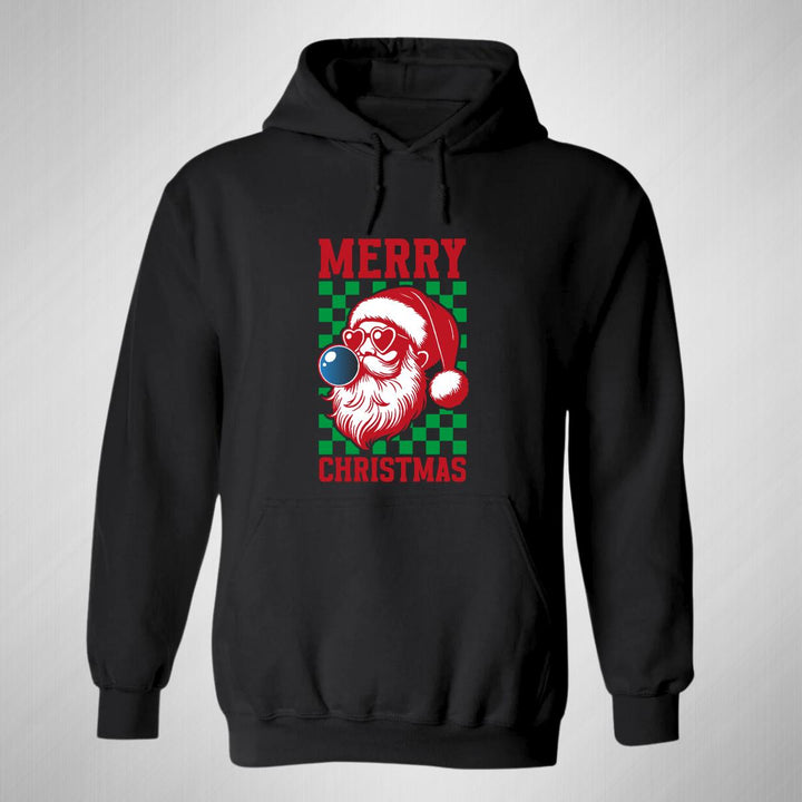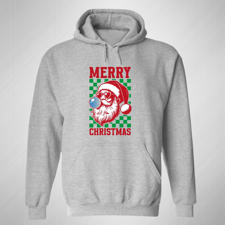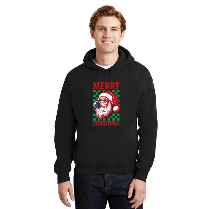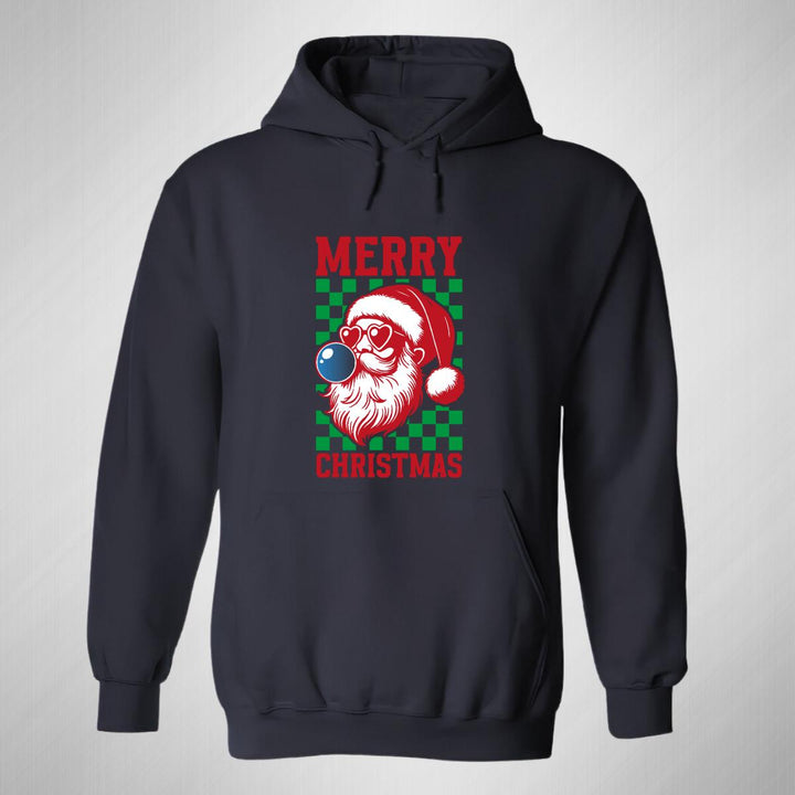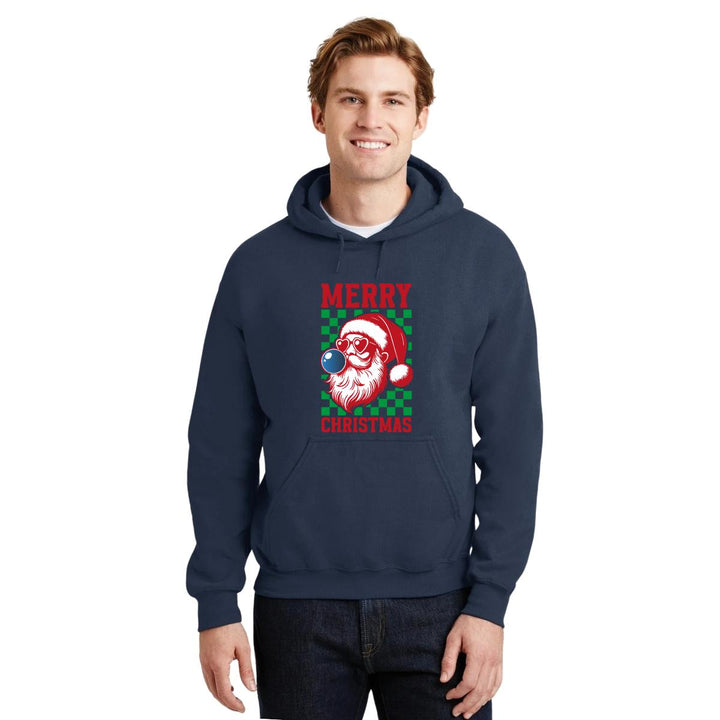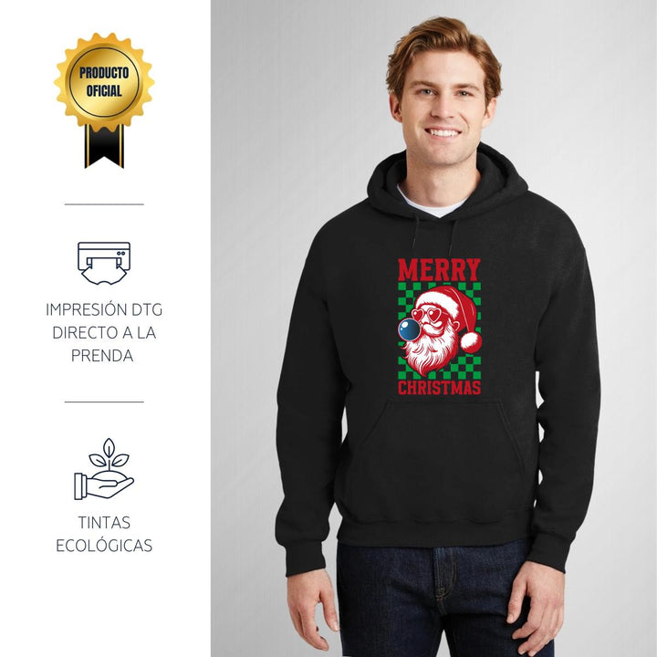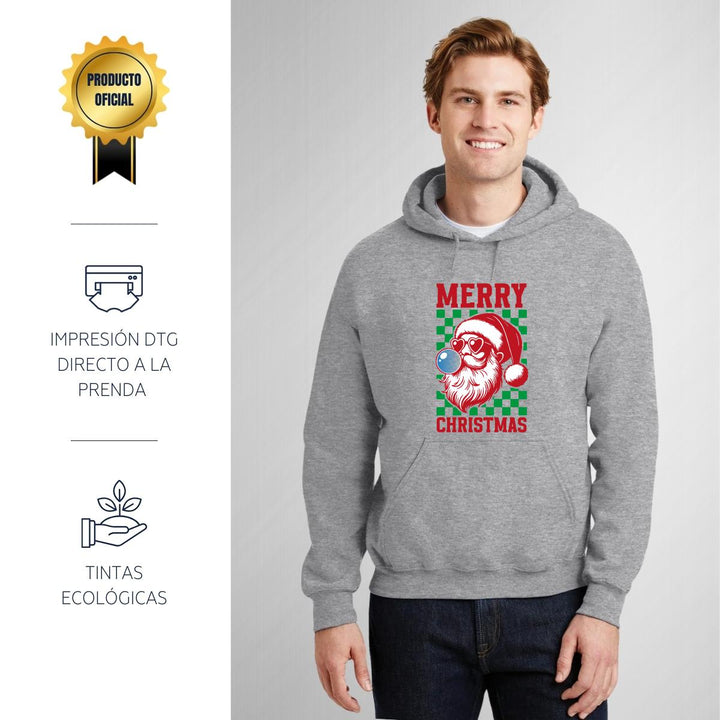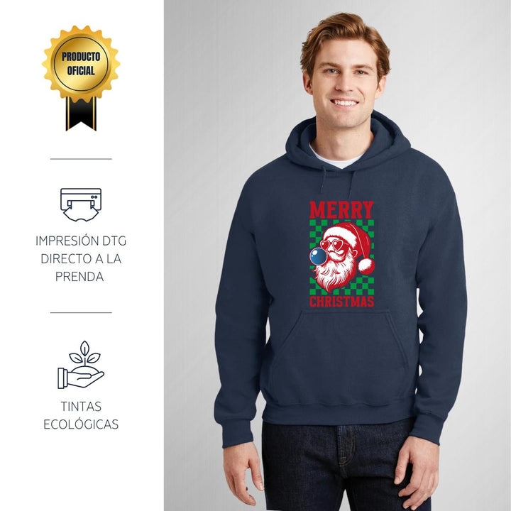 Sudadera hoodie de adulto con gorro o capucha y bolsillo frontal canguro, para hombre nueva, diseño Merry Christmas original impreso con tecnología DTG (directo a la prenda) tacto cero, uso casual o deportiva, 50% algodón y 50% poliéster fleece pre encogido, estructura tubular con ajuste clásico. Colores de sudadera: Negro, Blanco, Azul Marino, Gris.