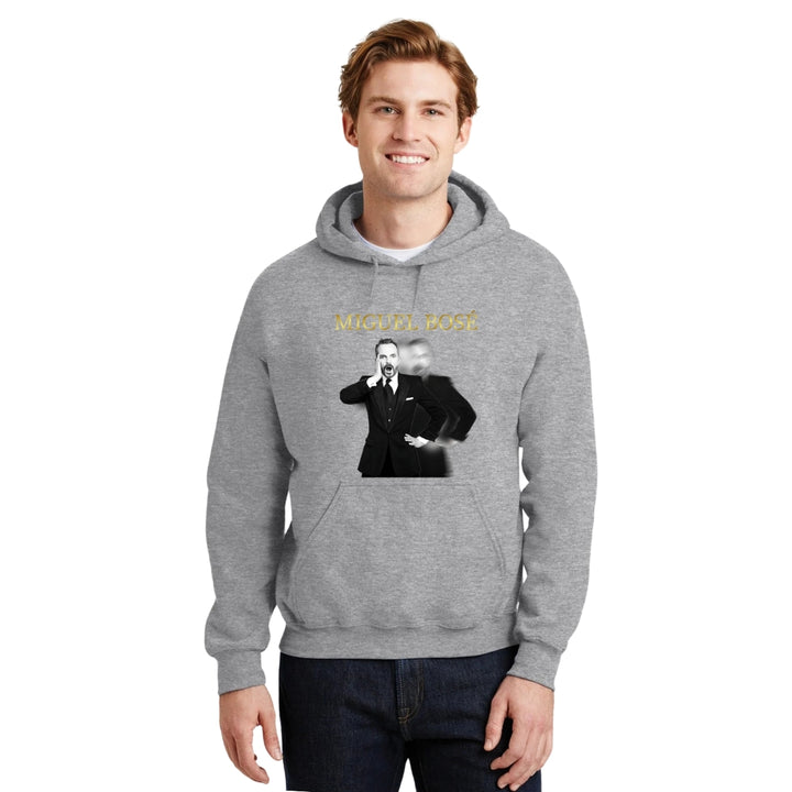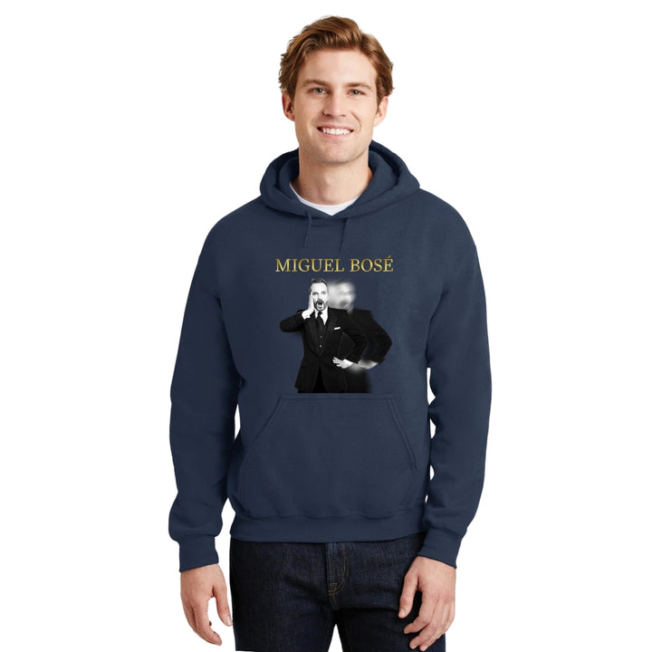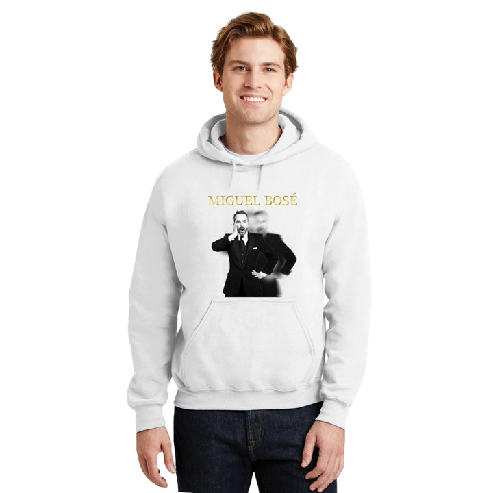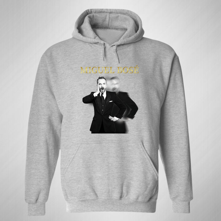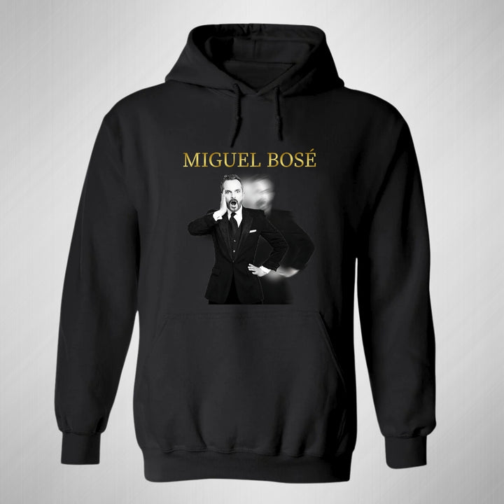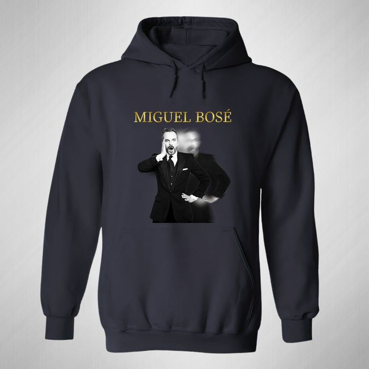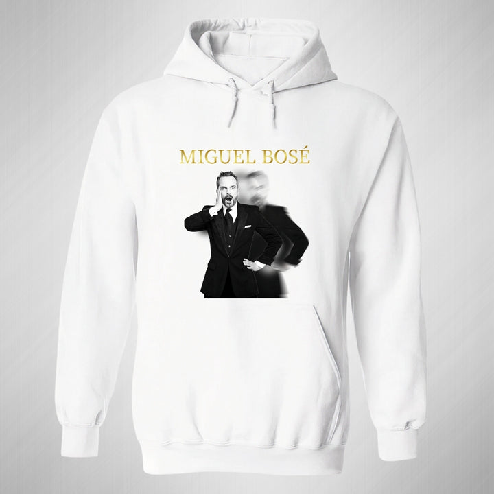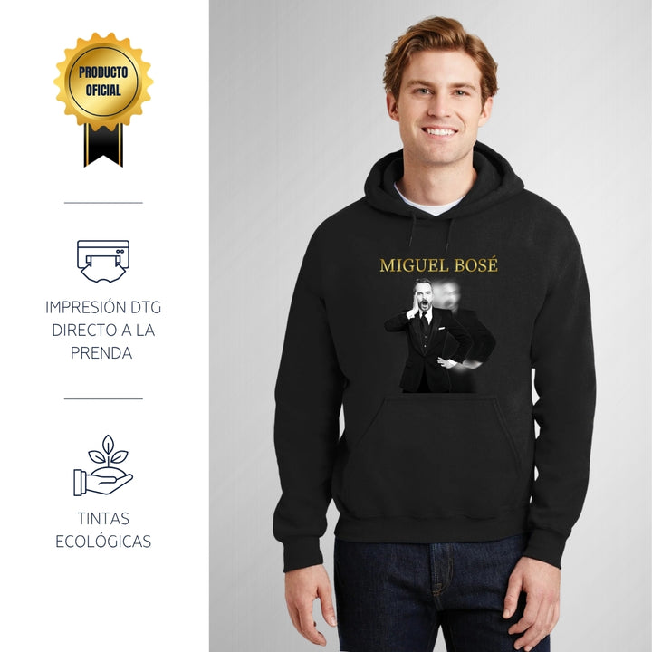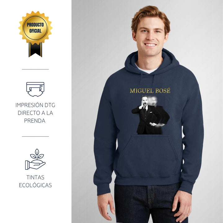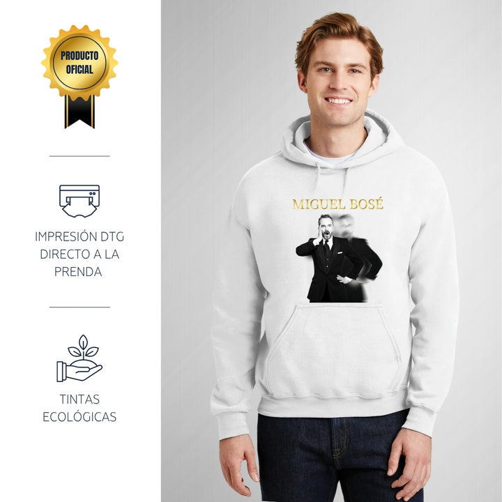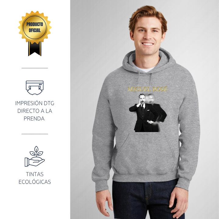 Sudadera hoodie de adulto con gorro o capucha y bolsillo frontal canguro, para hombre nueva, diseño Miguel Bosé Concierto original impreso con tecnología DTG (directo a la prenda) tacto cero, uso casual o deportiva, 50% algodón y 50% poliéster fleece pre encogido, estructura tubular con ajuste clásico. Colores de sudadera: Negro, Blanco, Azul Marino, Gris.
