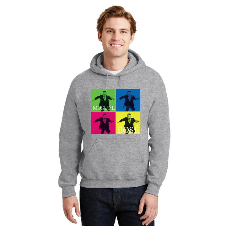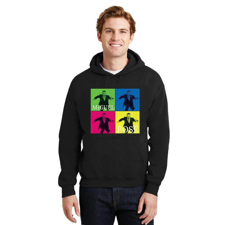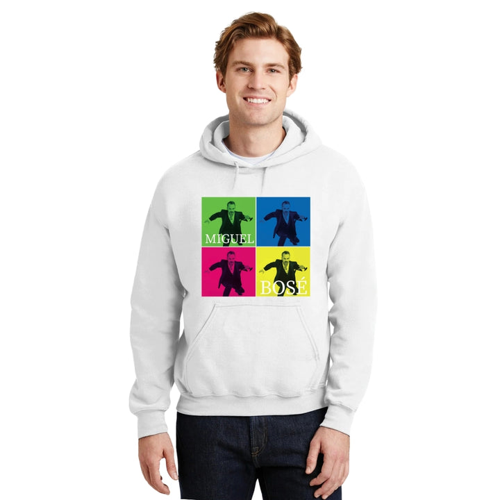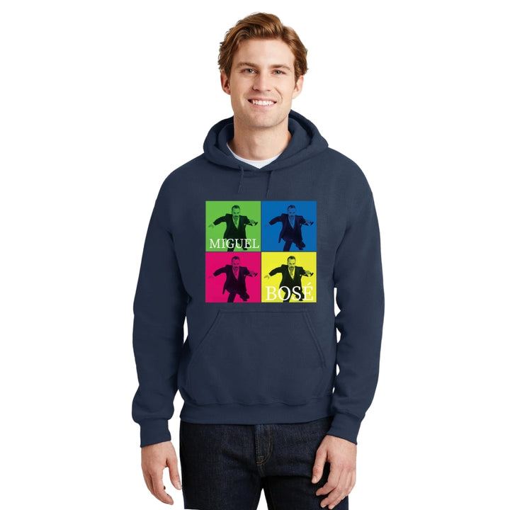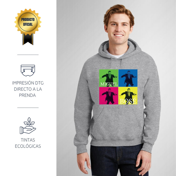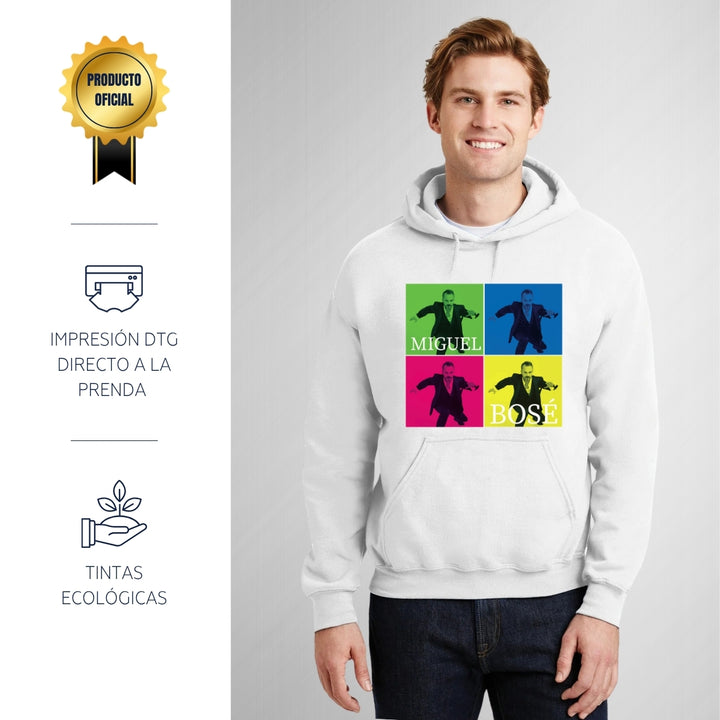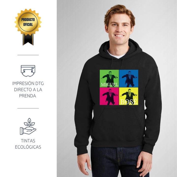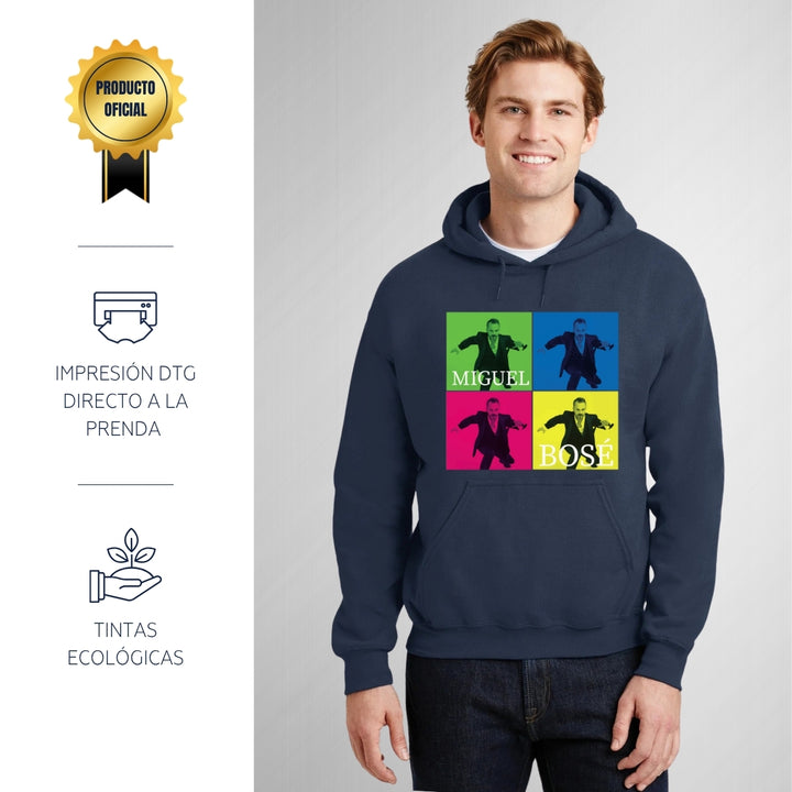 Sudadera hoodie de adulto con gorro o capucha y bolsillo frontal canguro, para hombre nueva, diseño Miguel Bosé Tour original impreso con tecnología DTG (directo a la prenda) tacto cero, uso casual o deportiva, 50% algodón y 50% poliéster fleece pre encogido, estructura tubular con ajuste clásico. Colores de sudadera: Negro, Blanco, Azul Marino, Gris.