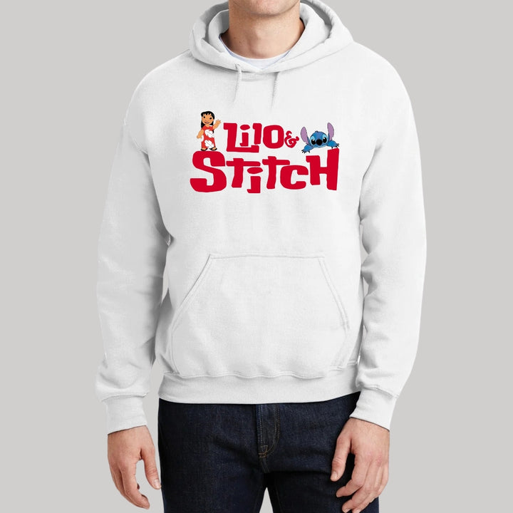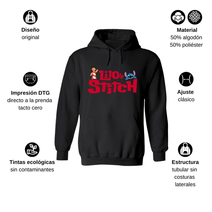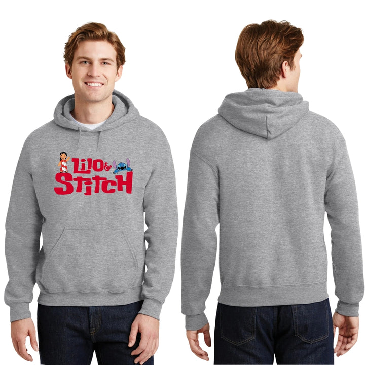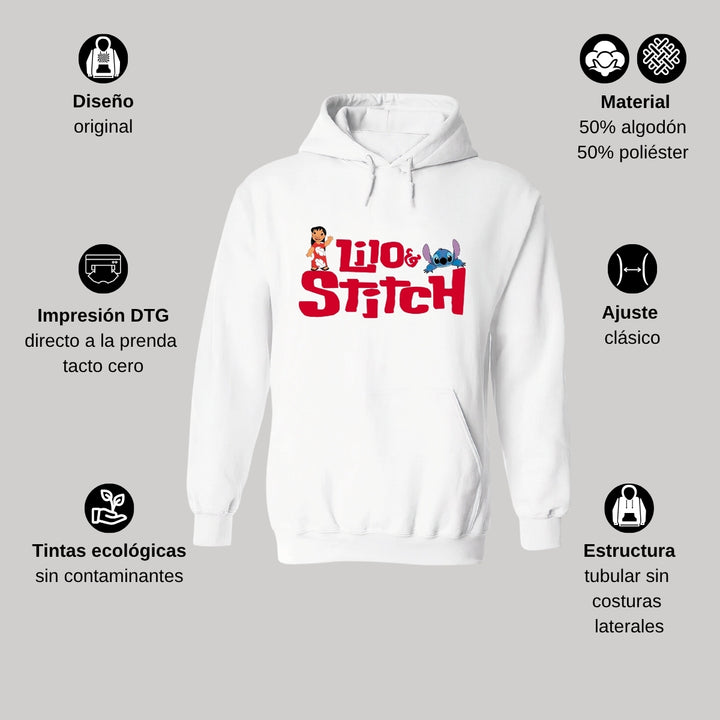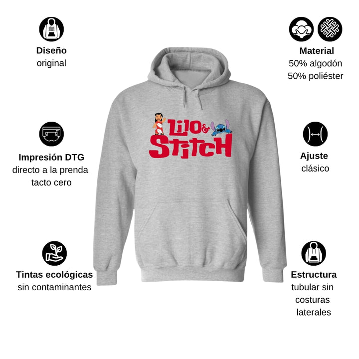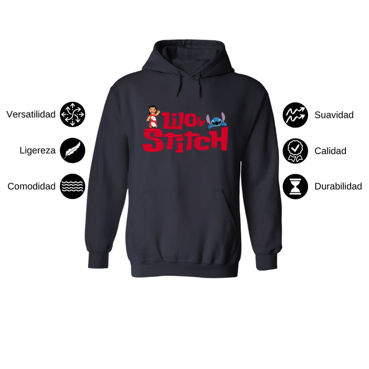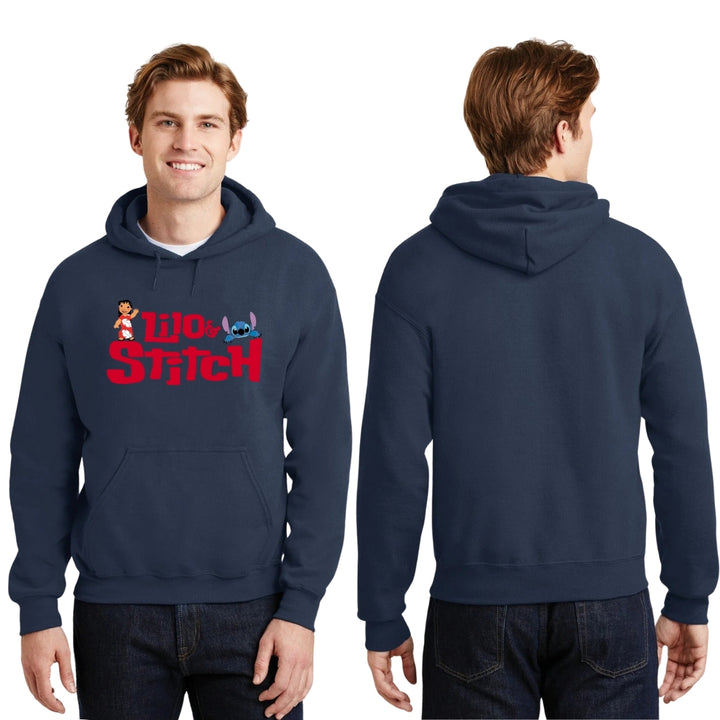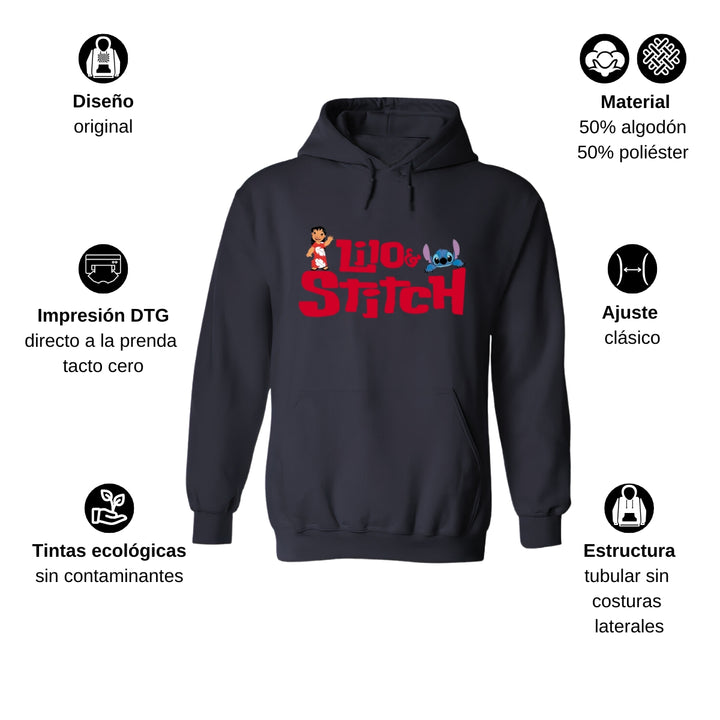 Sudadera hoodie de adulto con gorro o capucha y bolsillo frontal canguro, para hombre nueva, diseño Película Lilo y Stitch original impreso con tecnología DTG (directo a la prenda) tacto cero, uso casual o deportiva, 50% algodón y 50% poliéster fleece pre encogido, estructura tubular con ajuste clásico. Colores de sudadera: Azul Marino, Blanco, Negro, Gris.