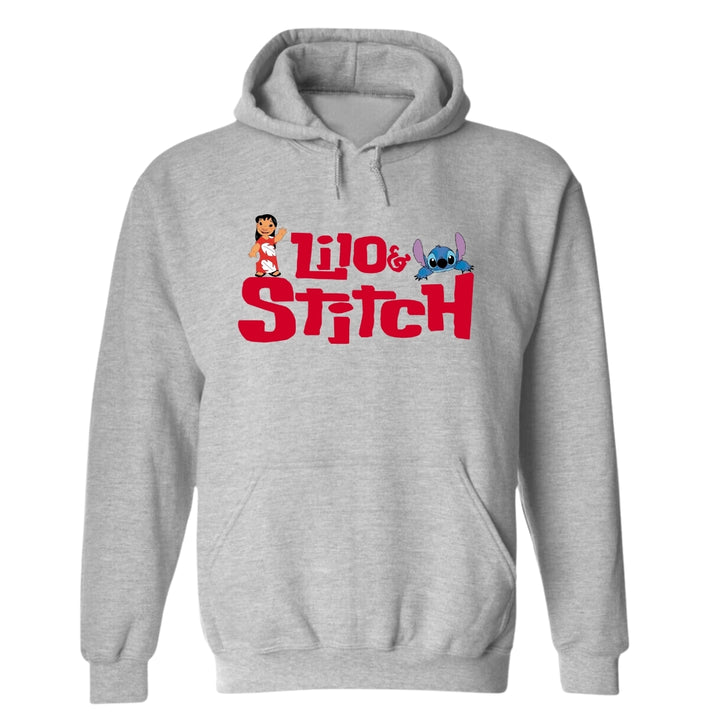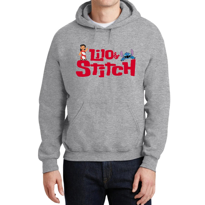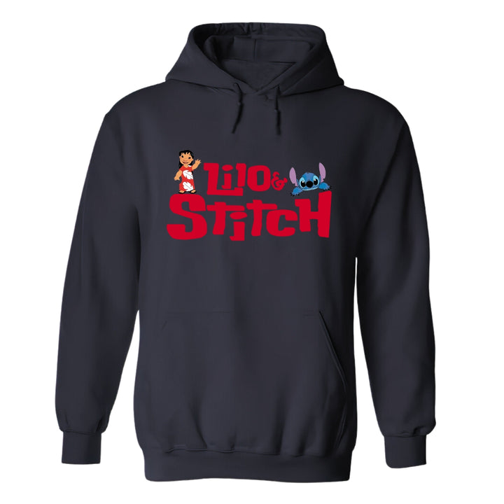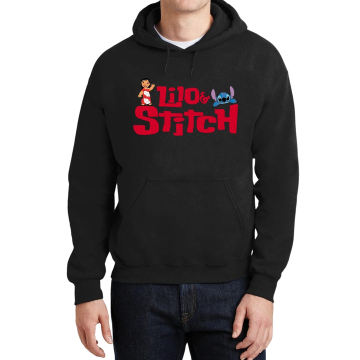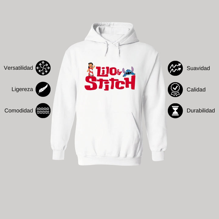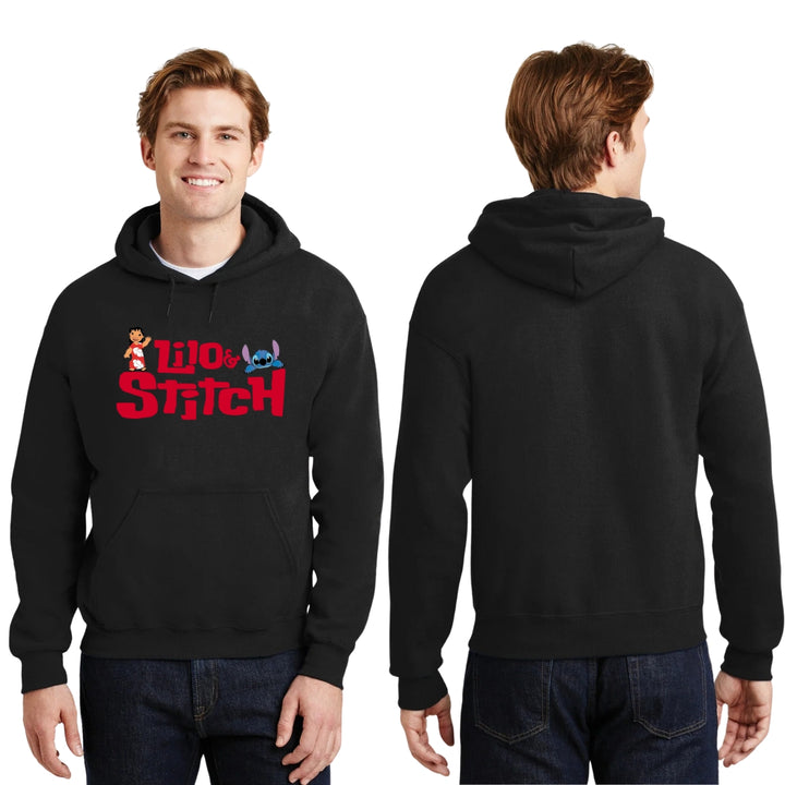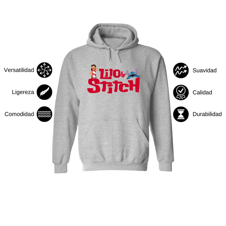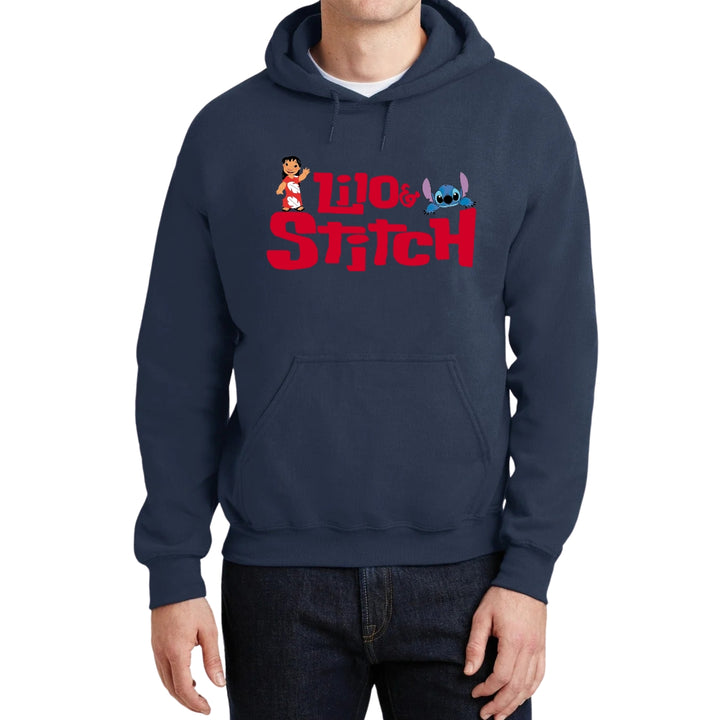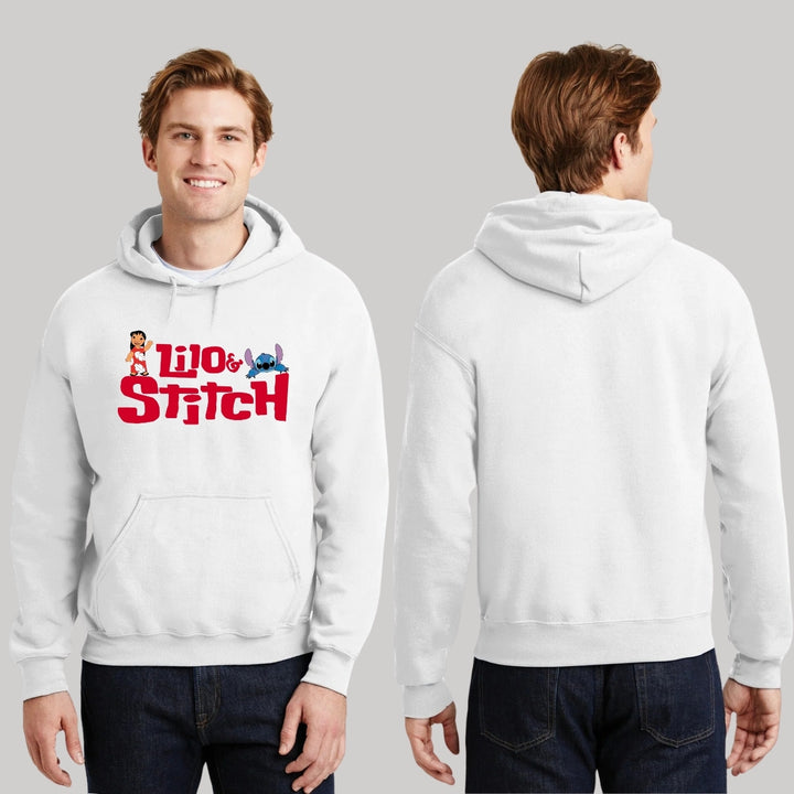 Sudadera hoodie de adulto con gorro o capucha y bolsillo frontal canguro, para hombre nueva, diseño Película Lilo y Stitch original impreso con tecnología DTG (directo a la prenda) tacto cero, uso casual o deportiva, 50% algodón y 50% poliéster fleece pre encogido, estructura tubular con ajuste clásico. Colores de sudadera: Azul Marino, Blanco, Negro, Gris.