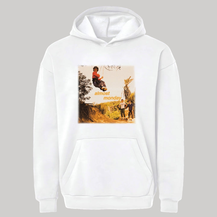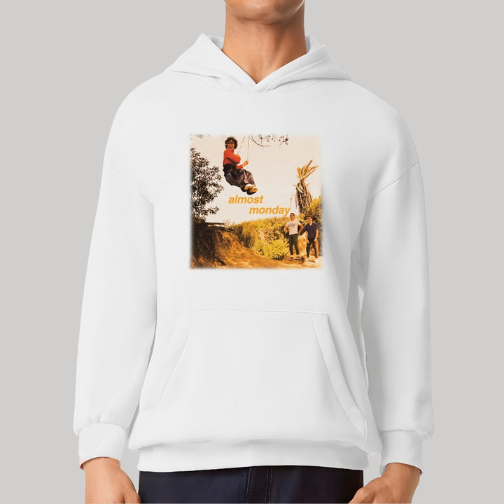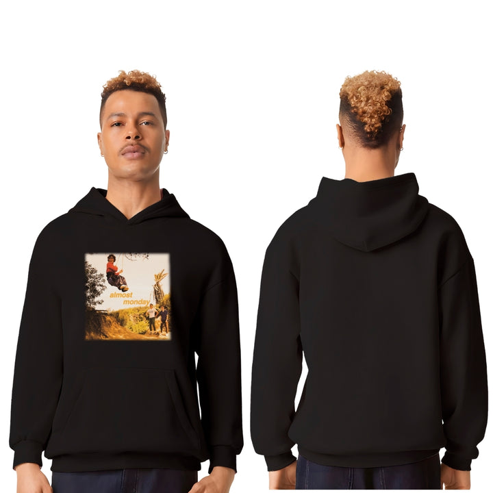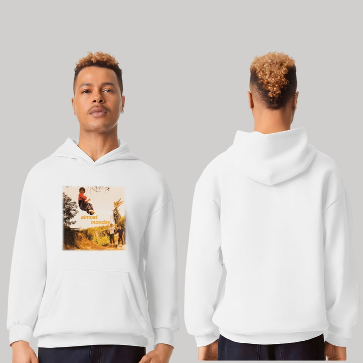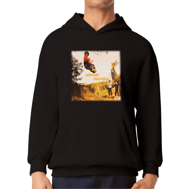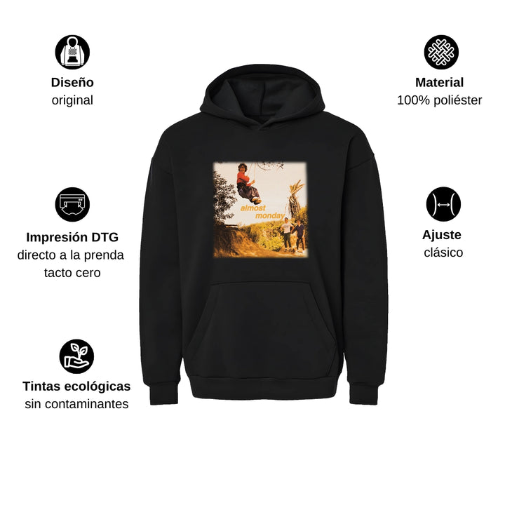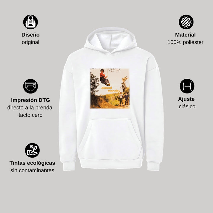 Sudadera hoodie transpirable pro dry de adulto con gorro o capucha y bolsillo frontal canguro, para hombre nueva, diseño Almost Monday Concierto impreso con tecnología DTG (directo a la prenda) tacto cero, uso casual o deportiva, 100% poliéster, ajuste clásico. Colores de sudadera: Negro, Blanco.