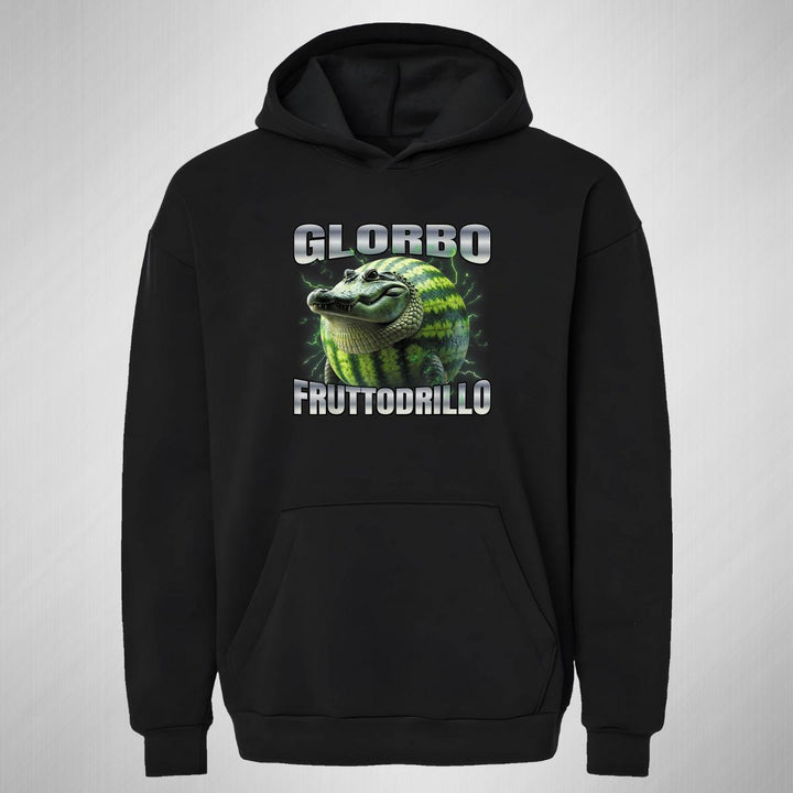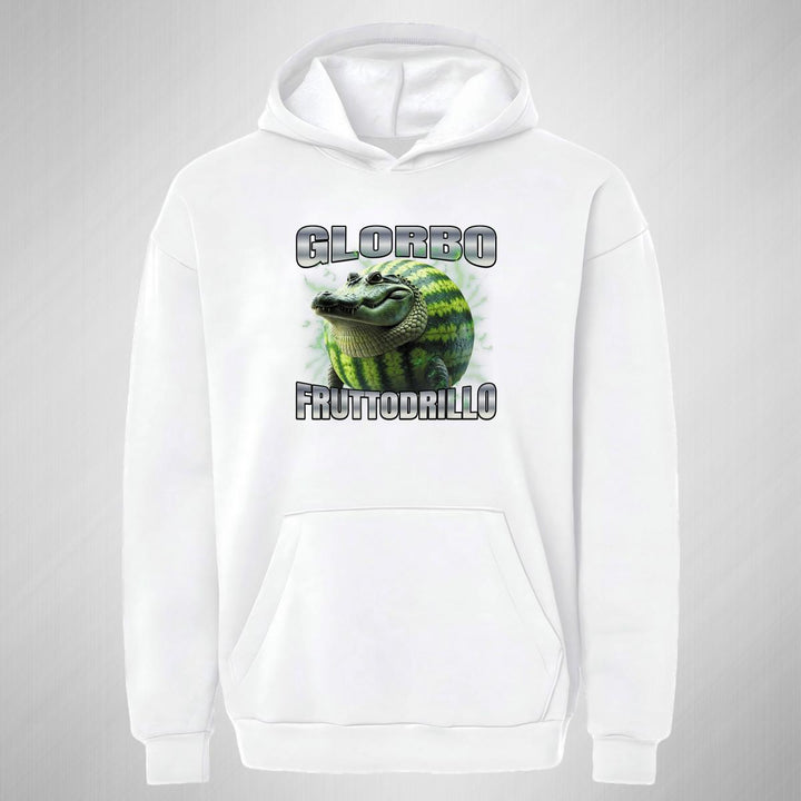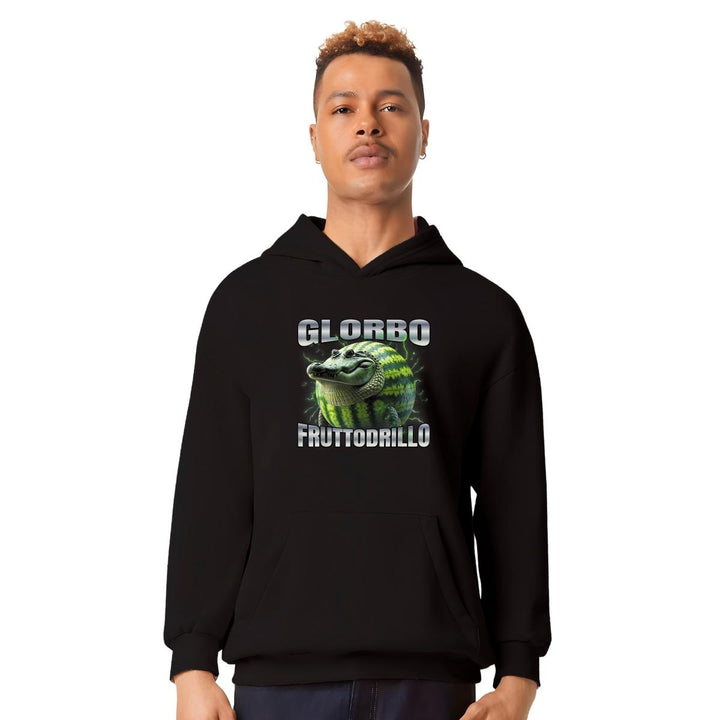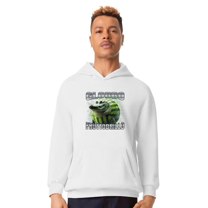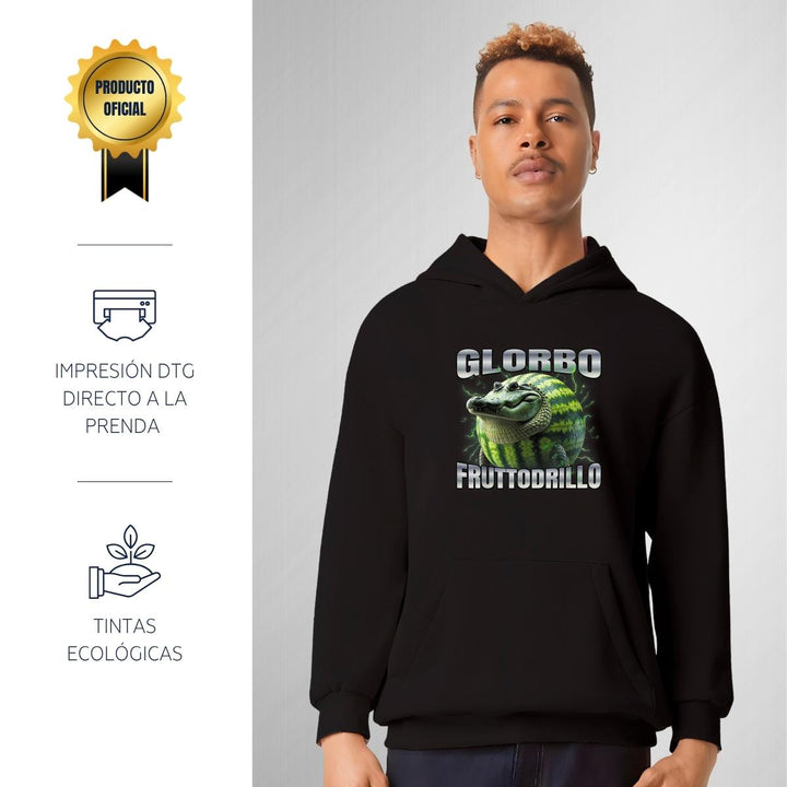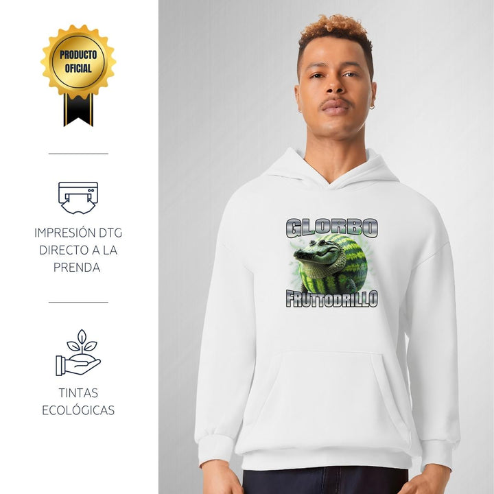 Sudadera hoodie transpirable pro dry de adulto con gorro o capucha y bolsillo frontal canguro, para hombre nueva, diseño Brainrot Glorbo Fruttodrillo impreso con tecnología DTG (directo a la prenda) tacto cero, uso casual o deportiva, 100% poliéster, ajuste clásico. Colores de sudadera: Negro, Blanco.