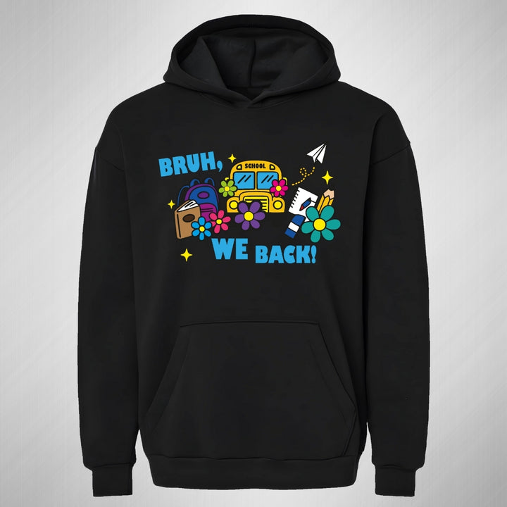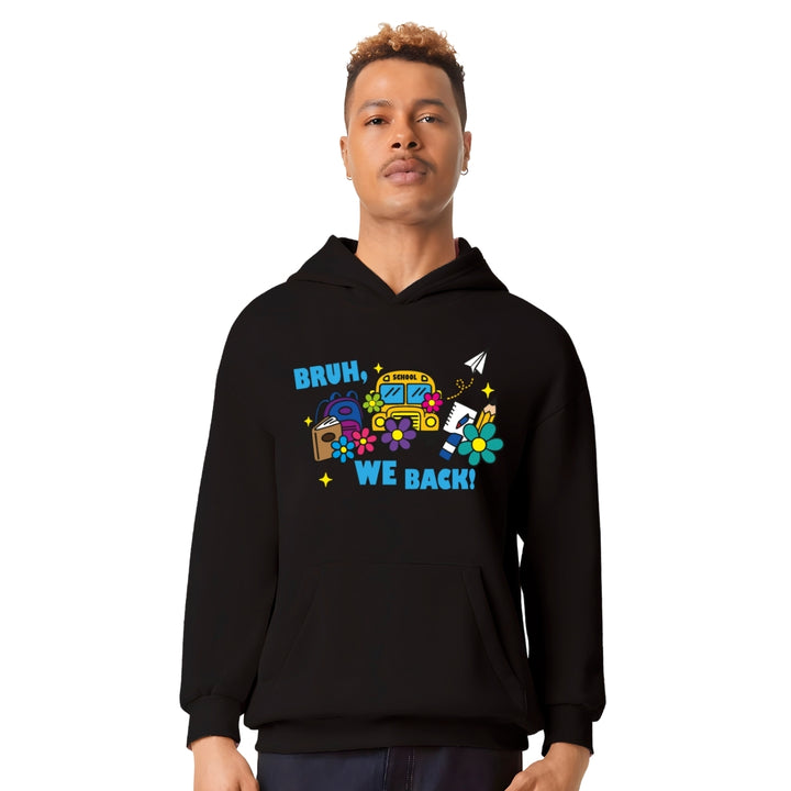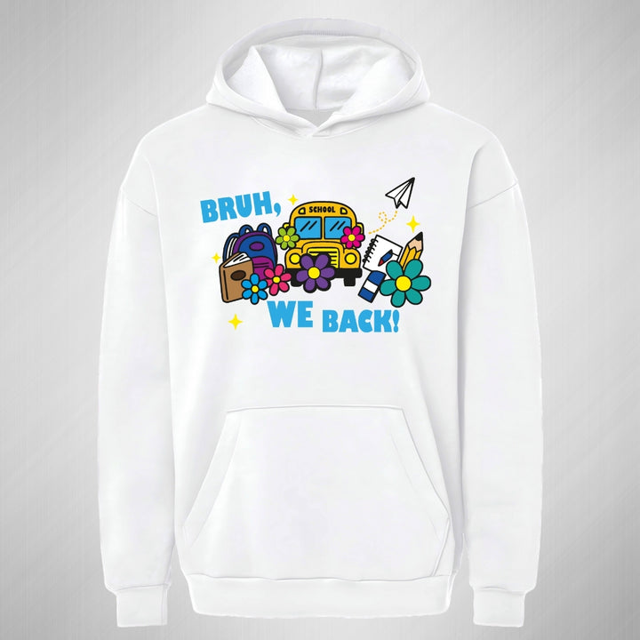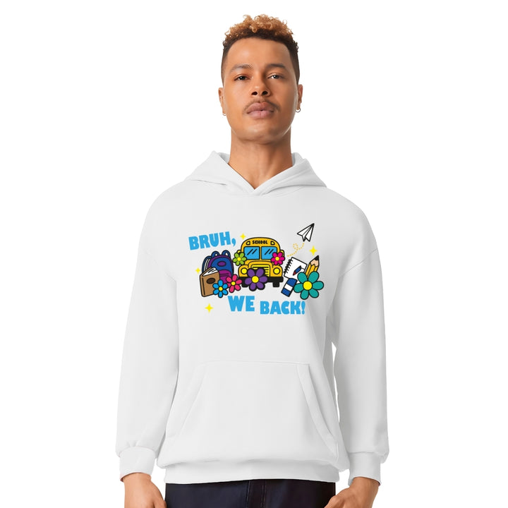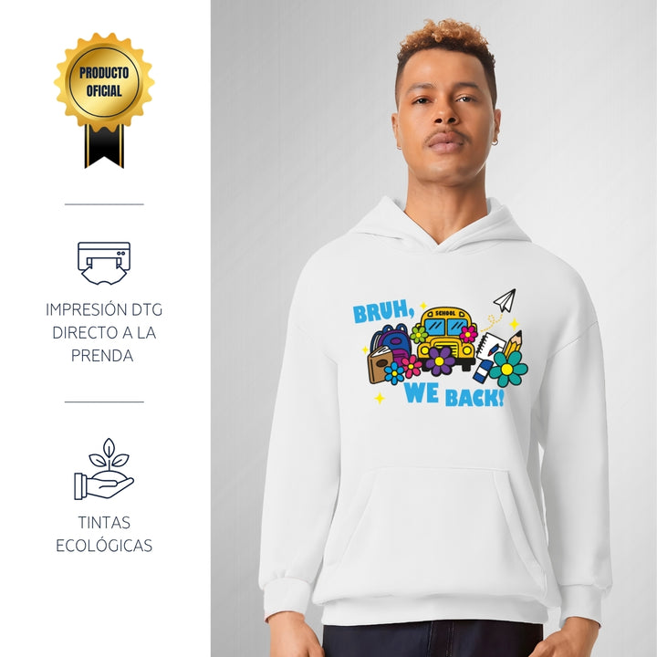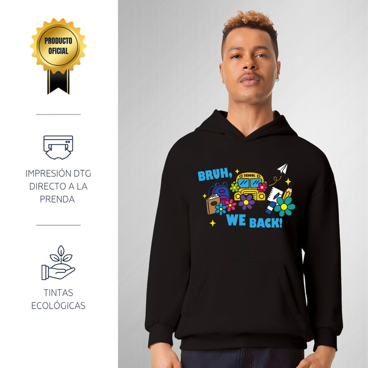 Sudadera hoodie transpirable pro dry de adulto con gorro o capucha y bolsillo frontal canguro, para hombre nueva, diseño Bruh We Back impreso con tecnología DTG (directo a la prenda) tacto cero, uso casual o deportiva, 100% poliéster, ajuste clásico. Colores de sudadera: Negro, Blanco.