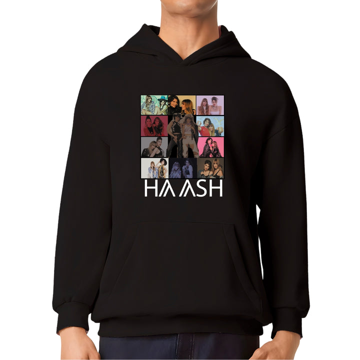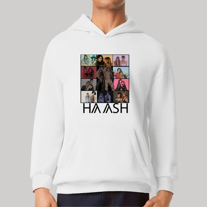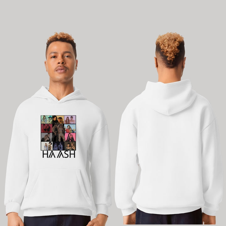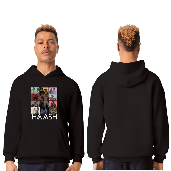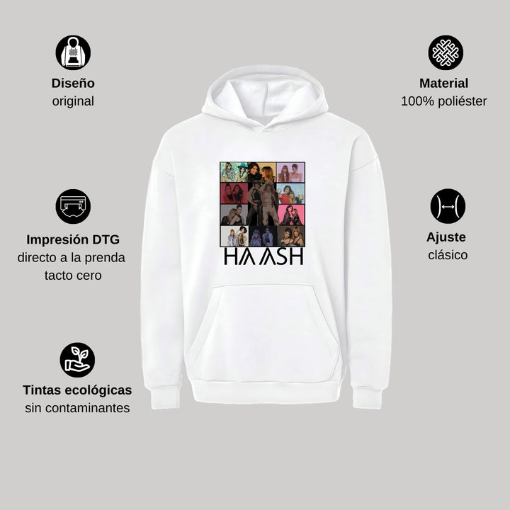 Sudadera hoodie transpirable pro dry de adulto con gorro o capucha y bolsillo frontal canguro, para hombre nueva, diseño HA-ASH Concierto Tour impreso con tecnología DTG (directo a la prenda) tacto cero, uso casual o deportiva, 100% poliéster, ajuste clásico. Colores de sudadera: Negro, Blanco.