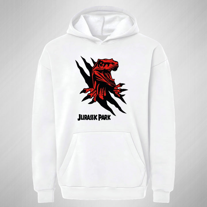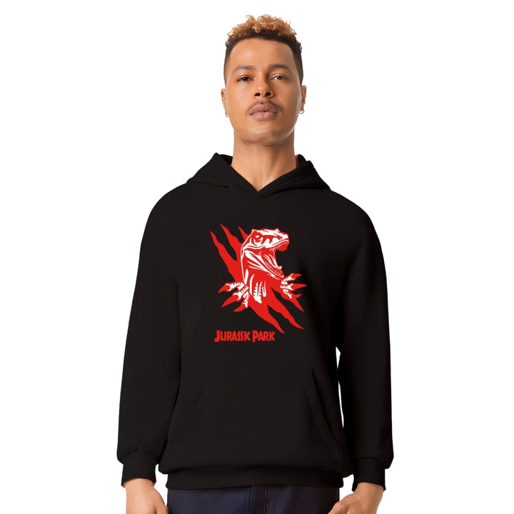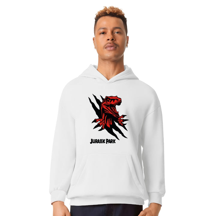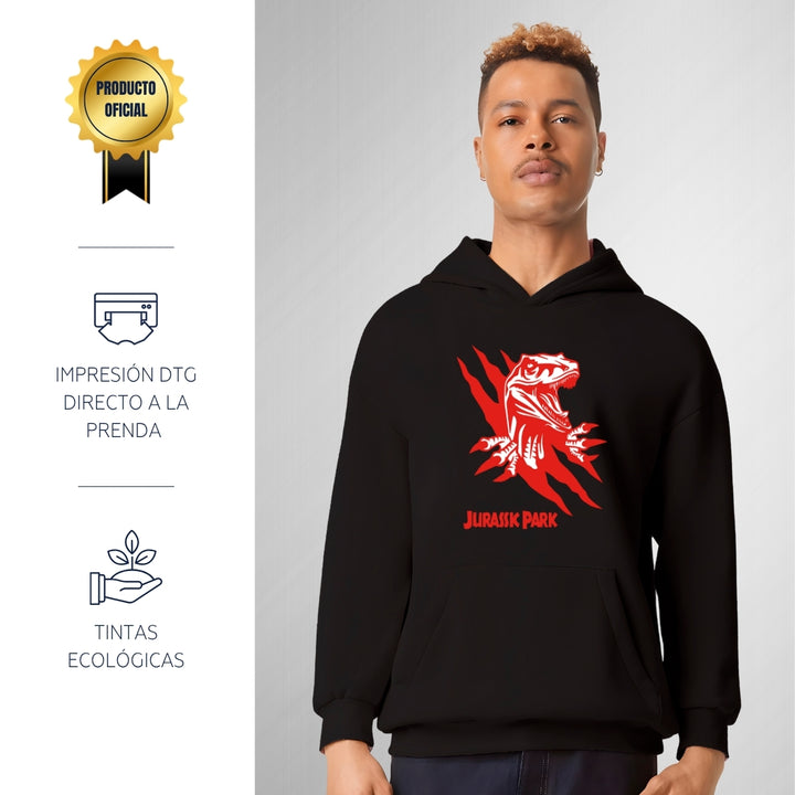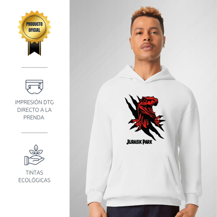 Sudadera hoodie transpirable pro dry de adulto con gorro o capucha y bolsillo frontal canguro, para hombre nueva, diseño Jurassic Park Película impreso con tecnología DTG (directo a la prenda) tacto cero, uso casual o deportiva, 100% poliéster, ajuste clásico. Colores de sudadera: Negro, Blanco.