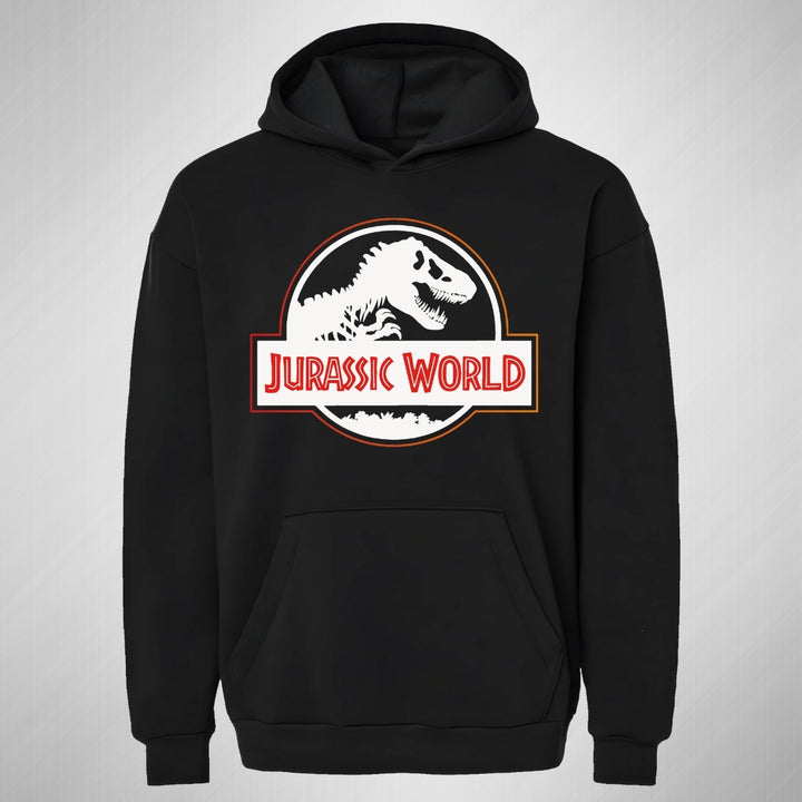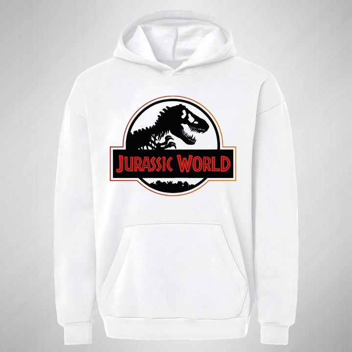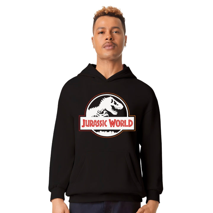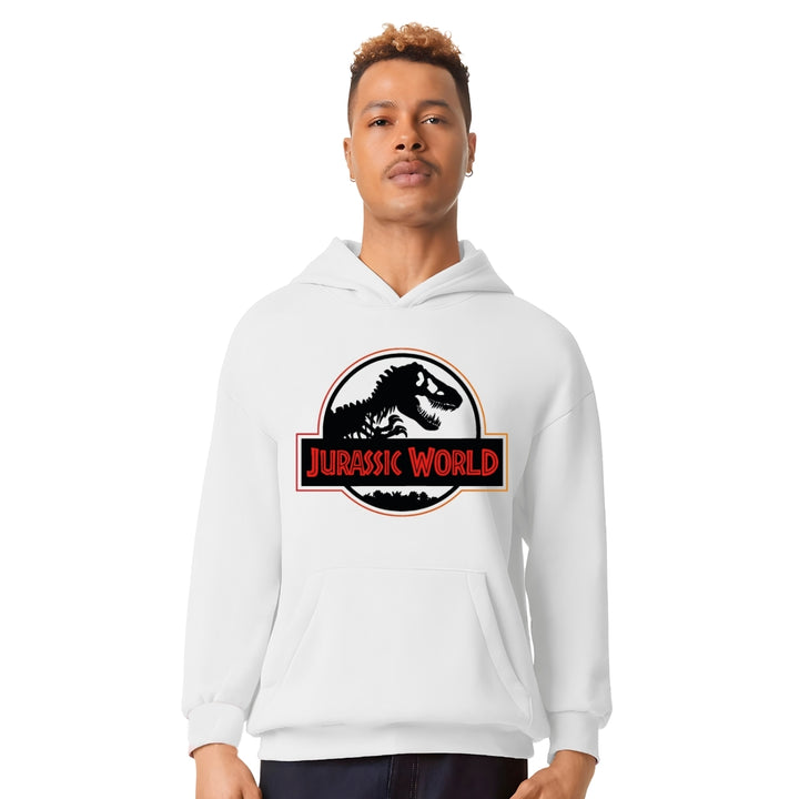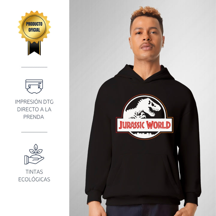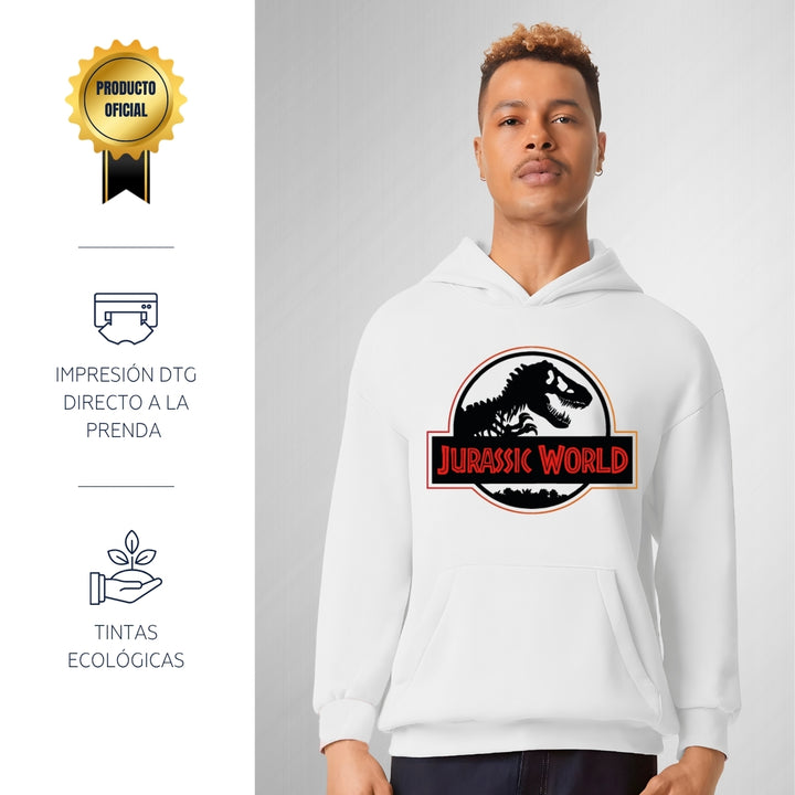 Sudadera hoodie transpirable pro dry de adulto con gorro o capucha y bolsillo frontal canguro, para hombre nueva, diseño Jurassic World impreso con tecnología DTG (directo a la prenda) tacto cero, uso casual o deportiva, 100% poliéster, ajuste clásico. Colores de sudadera: Negro, Blanco.