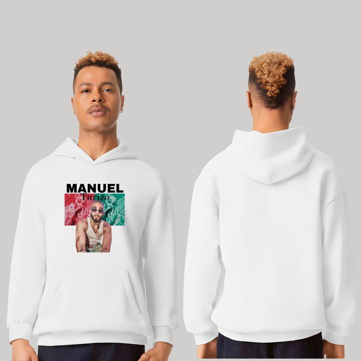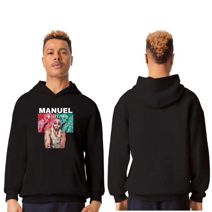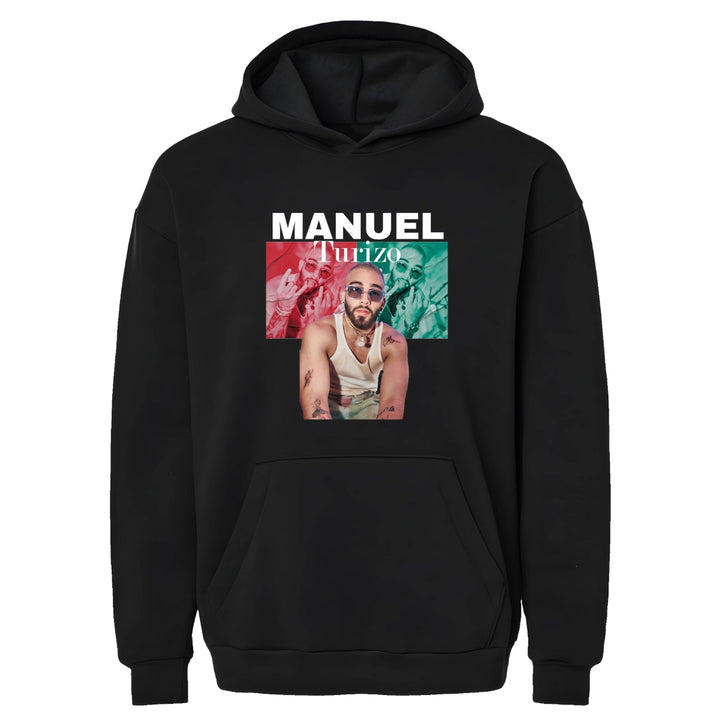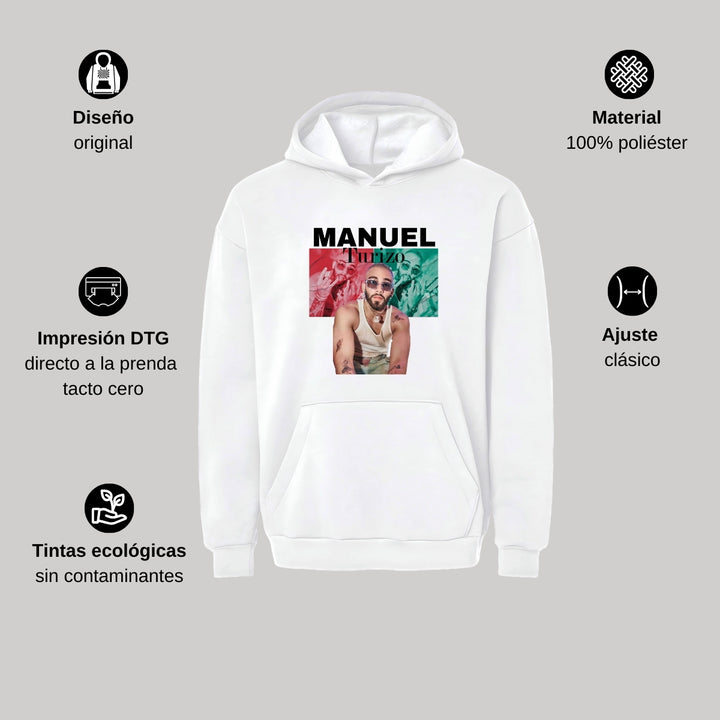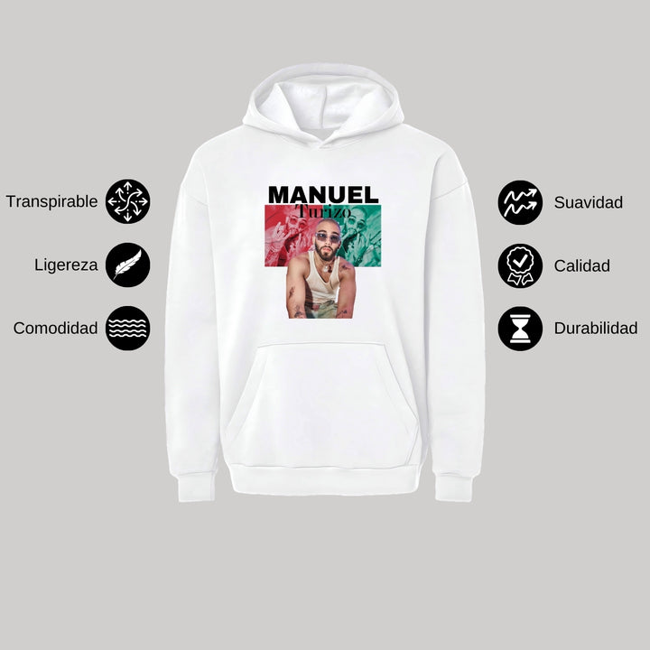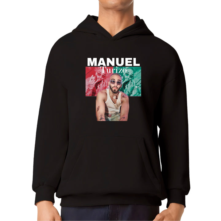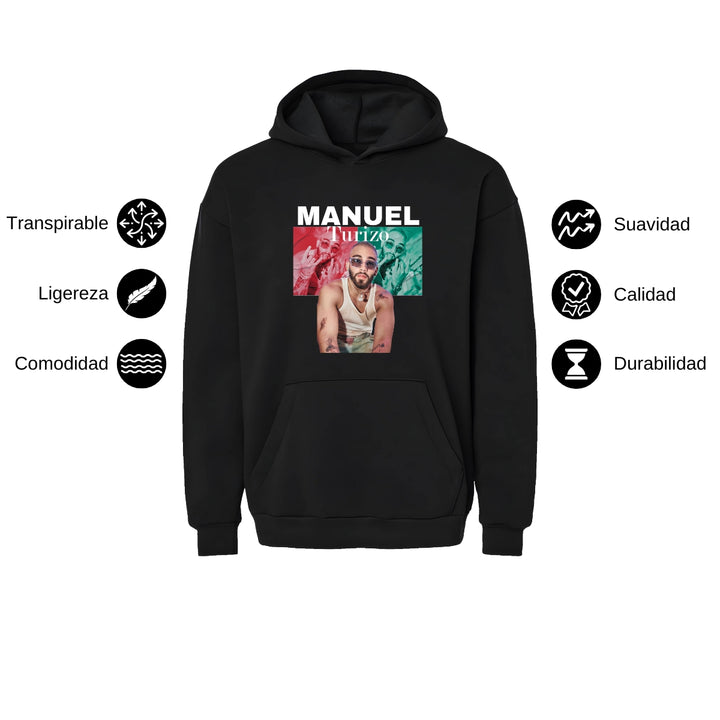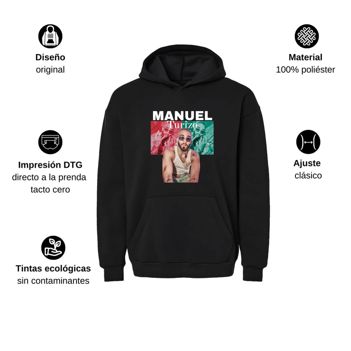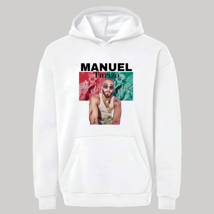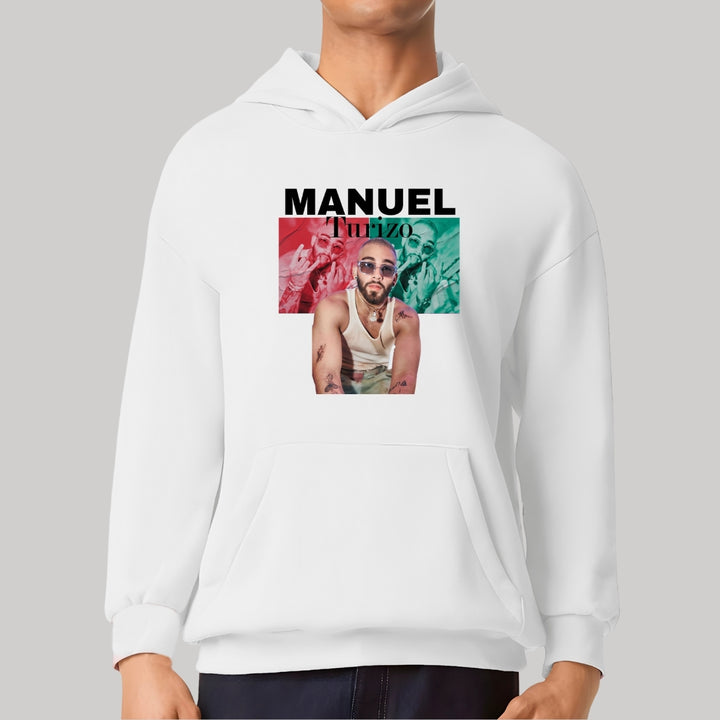 Sudadera hoodie transpirable pro dry de adulto con gorro o capucha y bolsillo frontal canguro, para caballero nueva, diseño Manuel Turizo impreso con tecnología DTG (directo a la prenda) tacto cero, uso casual o deportiva, 100% poliéster, ajuste clásico. Colores de sudadera: Negro, Blanco.