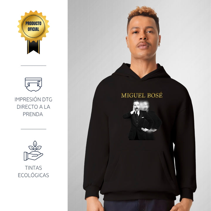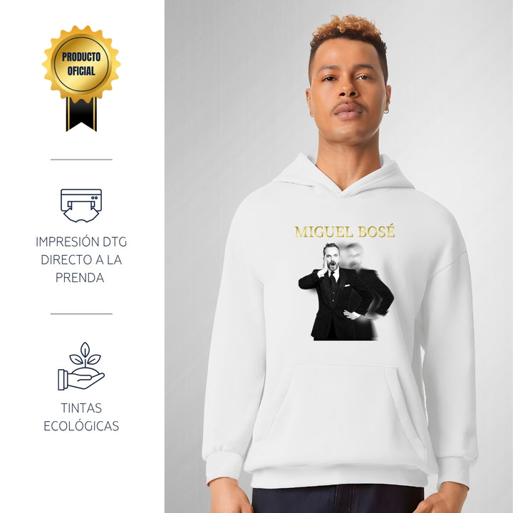 Sudadera hoodie transpirable pro dry de adulto con gorro o capucha y bolsillo frontal canguro, para hombre nueva, diseño Miguel Bosé Concierto impreso con tecnología DTG (directo a la prenda) tacto cero, uso casual o deportiva, 100% poliéster, ajuste clásico. Colores de sudadera: Negro, Blanco.