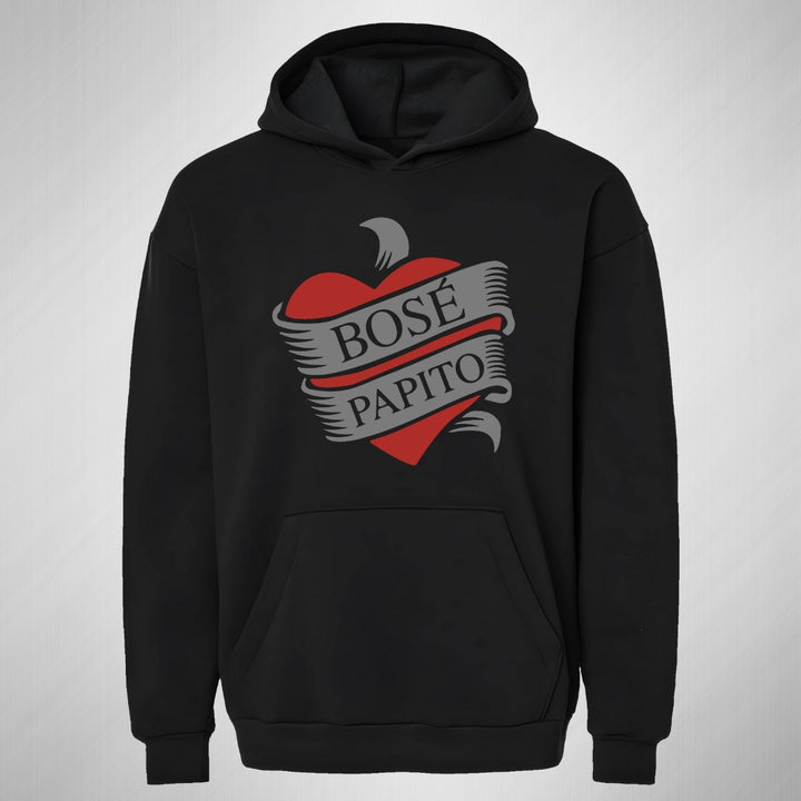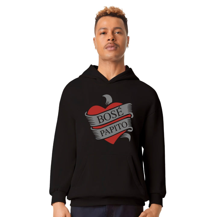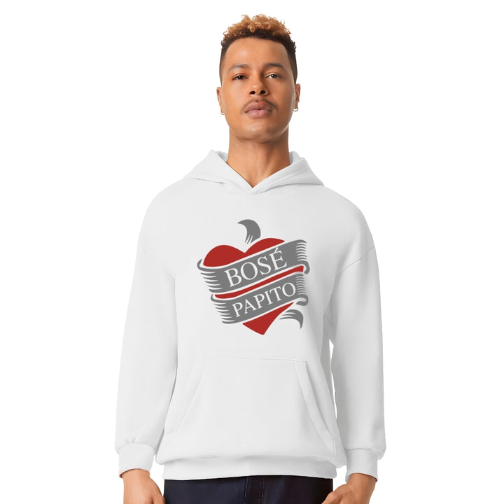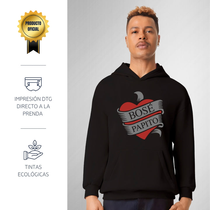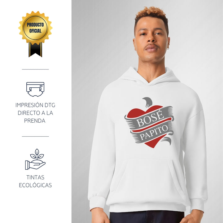 Sudadera hoodie transpirable pro dry de adulto con gorro o capucha y bolsillo frontal canguro, para hombre nueva, diseño Miguel Bosé Papito impreso con tecnología DTG (directo a la prenda) tacto cero, uso casual o deportiva, 100% poliéster, ajuste clásico. Colores de sudadera: Negro, Blanco.