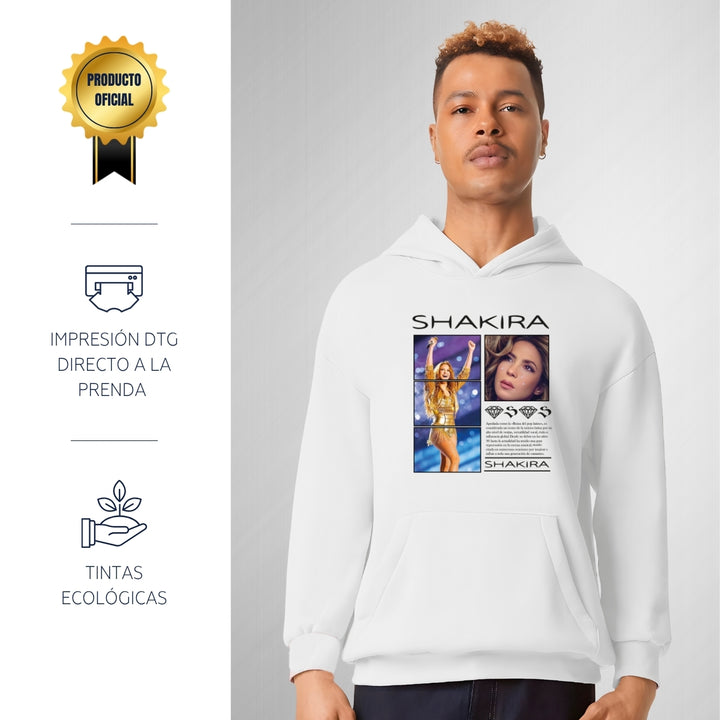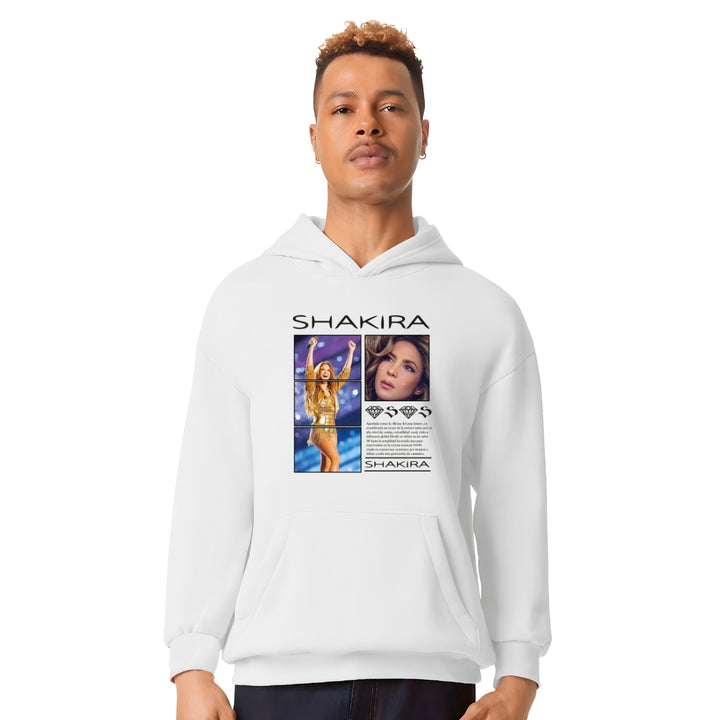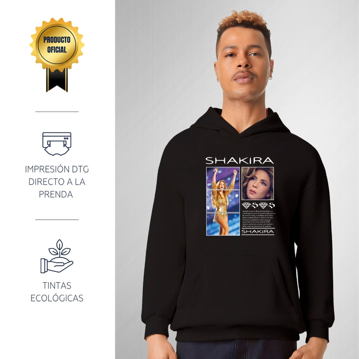 Sudadera hoodie transpirable pro dry de adulto con gorro o capucha y bolsillo frontal canguro, para hombre nueva, diseño Shakira Reyna del Pop Latino impreso con tecnología DTG (directo a la prenda) tacto cero, uso casual o deportiva, 100% poliéster, ajuste clásico. Colores de sudadera: Negro, Blanco.