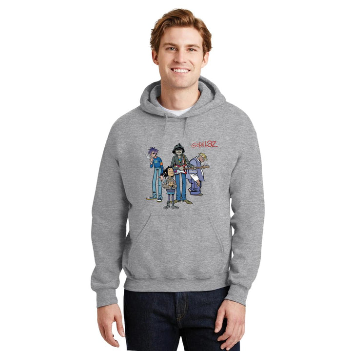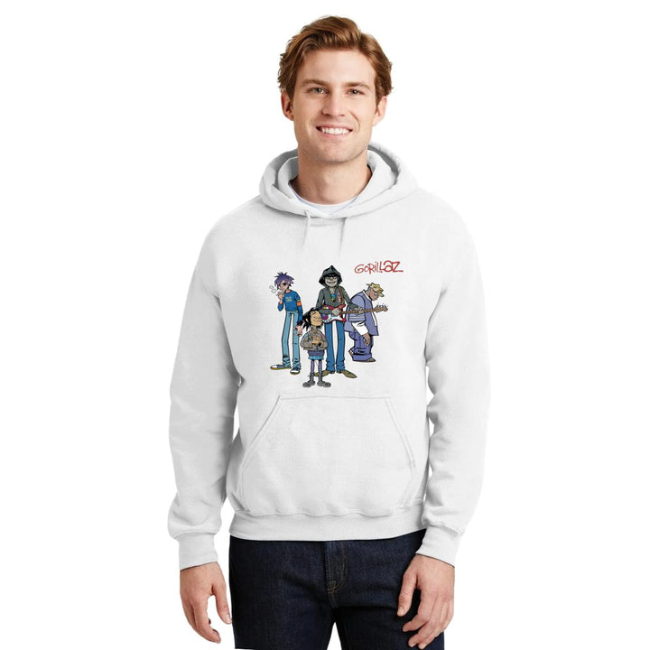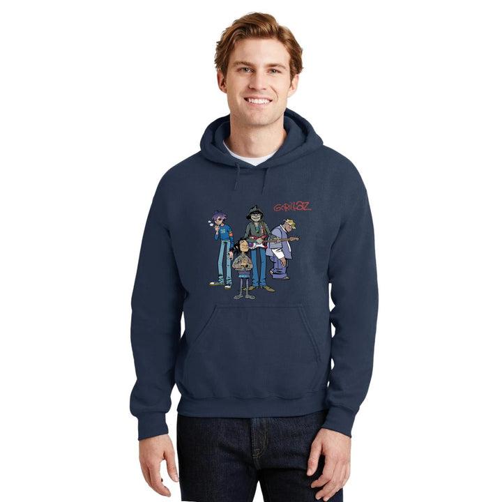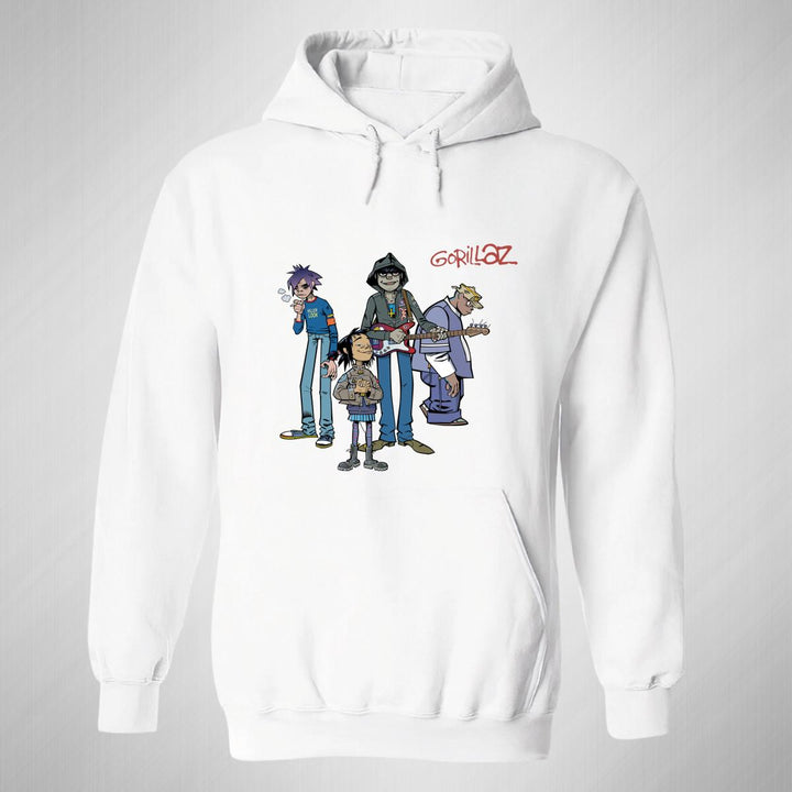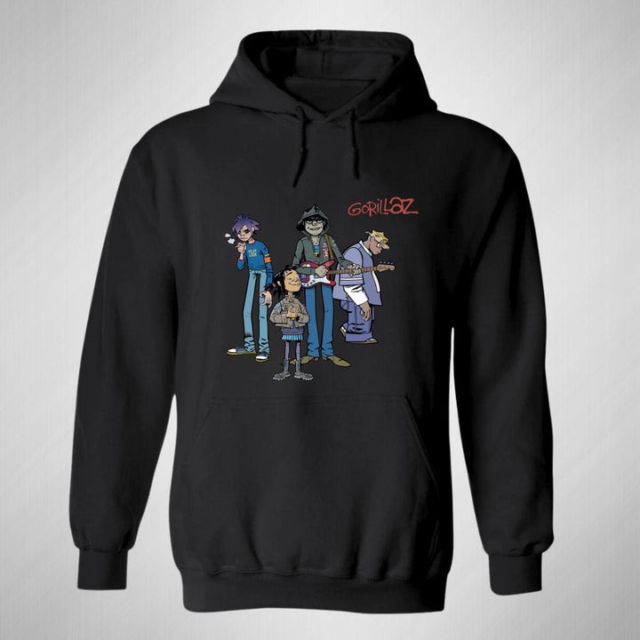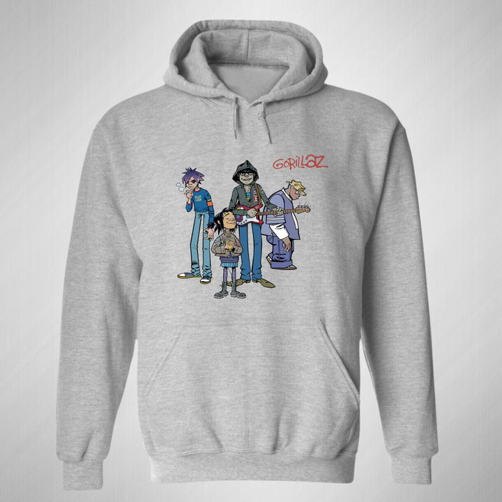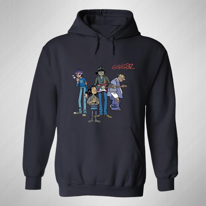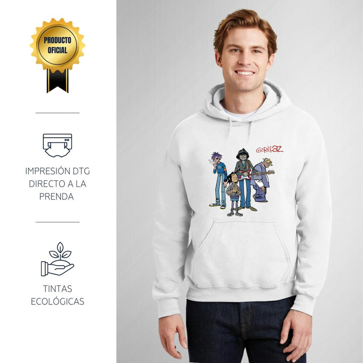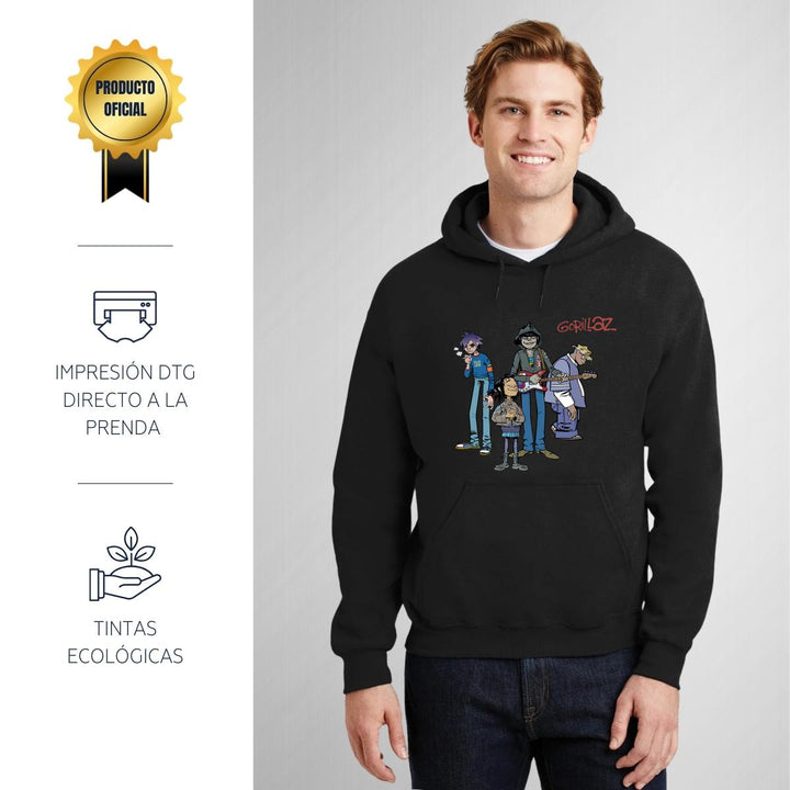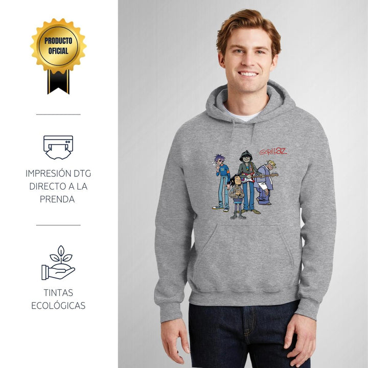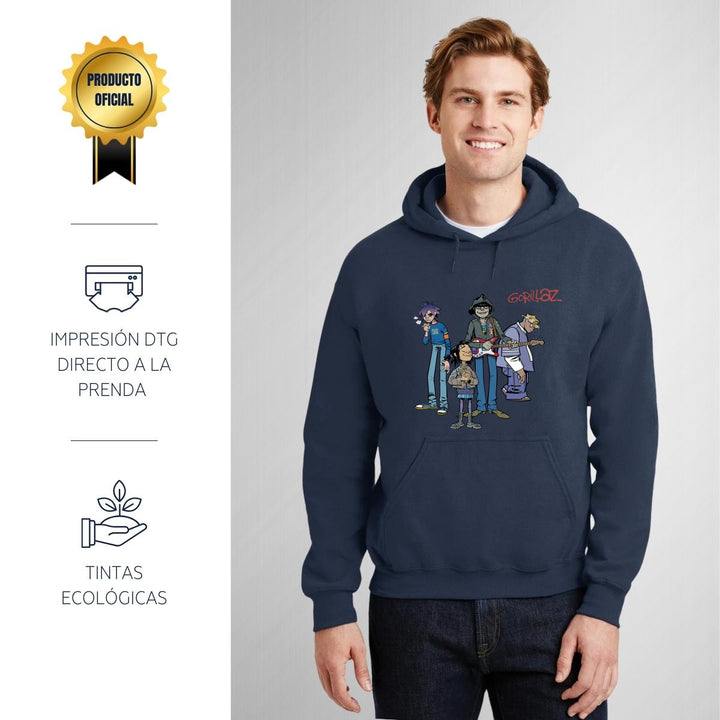 Sudadera hoodie de adulto con gorro o capucha y bolsillo frontal canguro, para hombre nueva, diseño Rock Gorillaz Póster original impreso con tecnología DTG (directo a la prenda) tacto cero, uso casual o deportiva, 50% algodón y 50% poliéster fleece pre encogido, estructura tubular con ajuste clásico. Colores de sudadera: Negro, Blanco, Azul Marino, Gris.