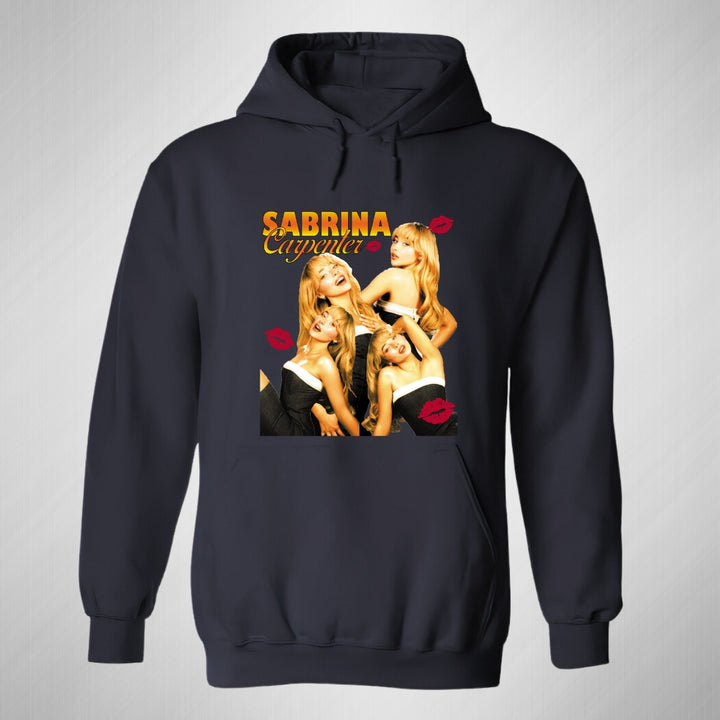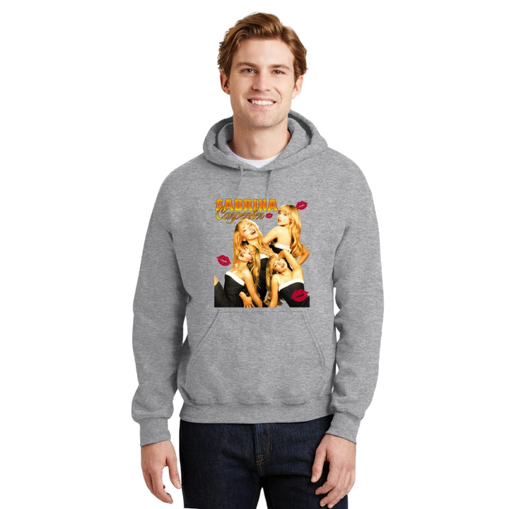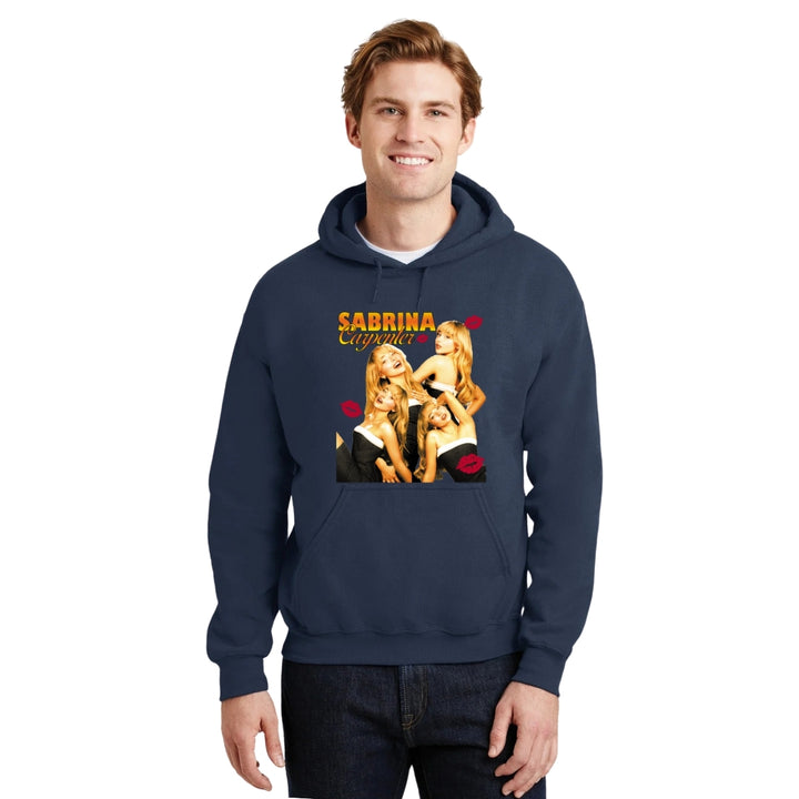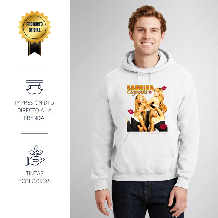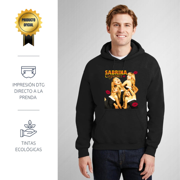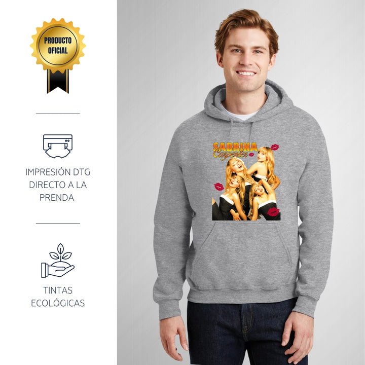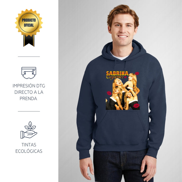 Sudadera hoodie de adulto con gorro o capucha y bolsillo frontal canguro, para hombre nueva, diseño Sabrina CaSHenter original impreso con tecnología DTG (directo a la prenda) tacto cero, uso casual o deportiva, 50% algodón y 50% poliéster fleece pre encogido, estructura tubular con ajuste clásico. Colores de sudadera: Negro, Blanco, Azul Marino, Gris.