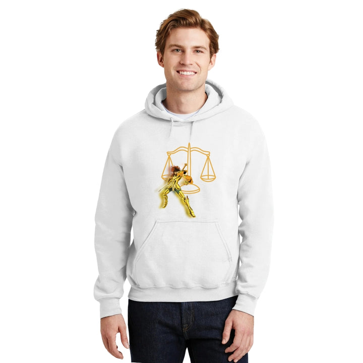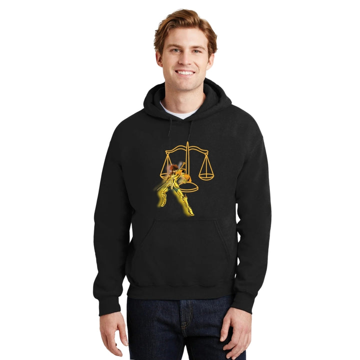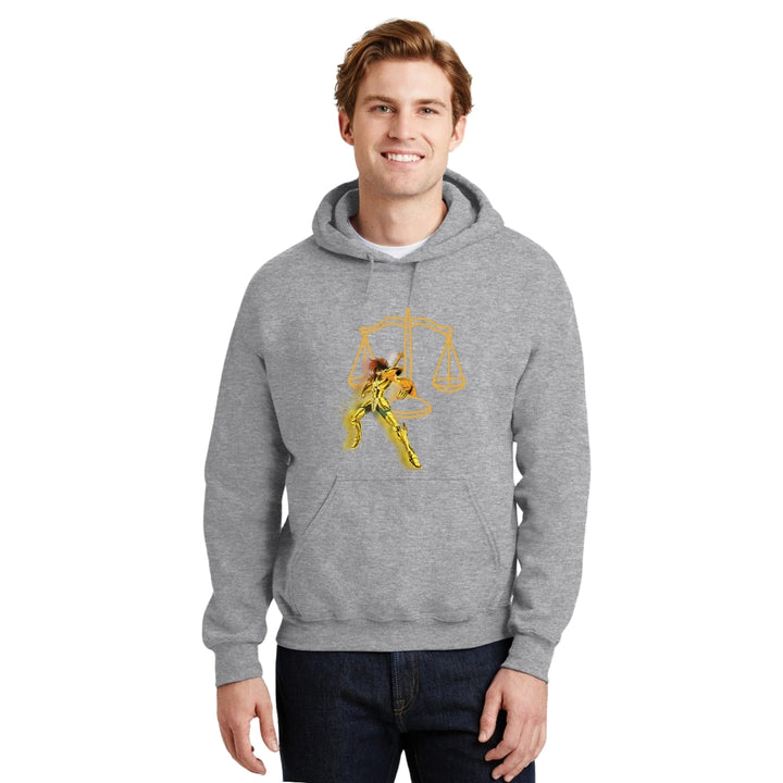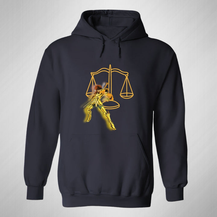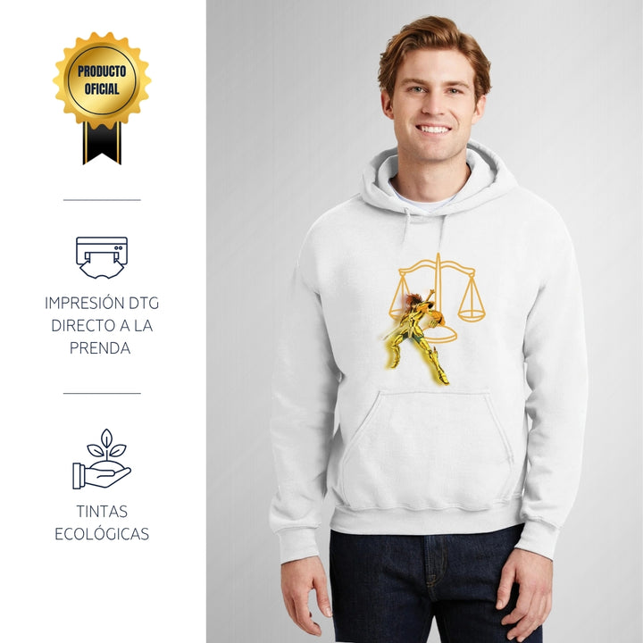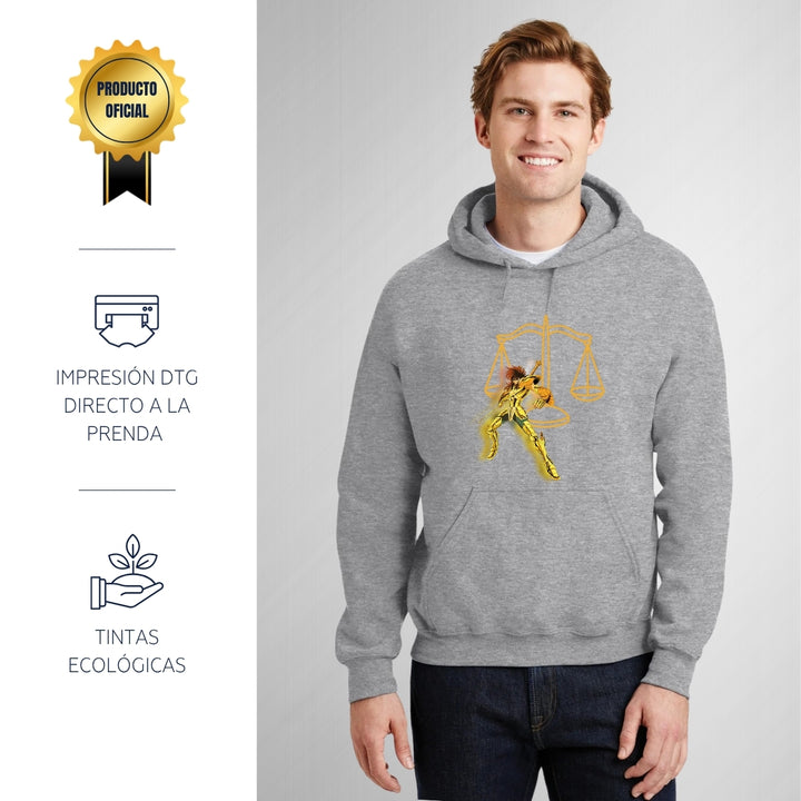Sudadera hoodie de adulto con gorro o capucha y bolsillo frontal canguro, para hombre nueva, diseño Saint Seiya Dohko de Libra original impreso con tecnología DTG (directo a la prenda) tacto cero, uso casual o deportiva, 50% algodón y 50% poliéster fleece pre encogido, estructura tubular con ajuste clásico. Colores de sudadera: Negro, Blanco, Azul Marino, Gris.