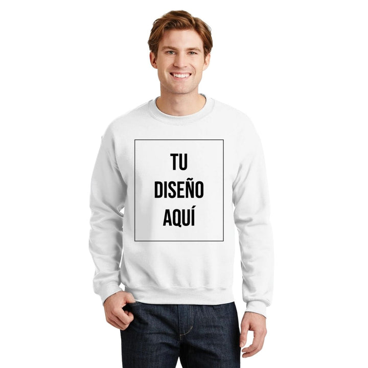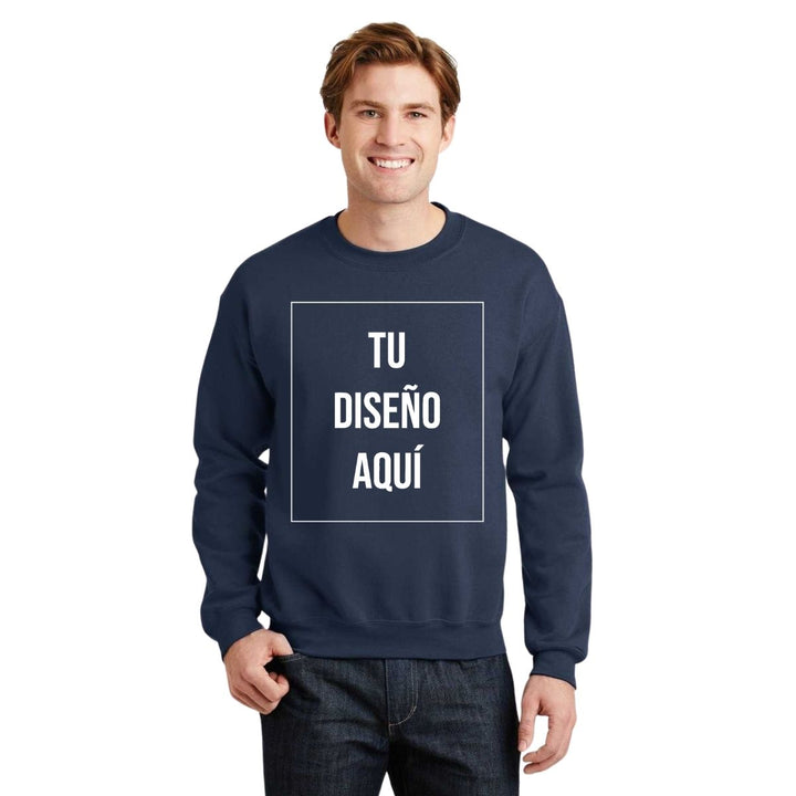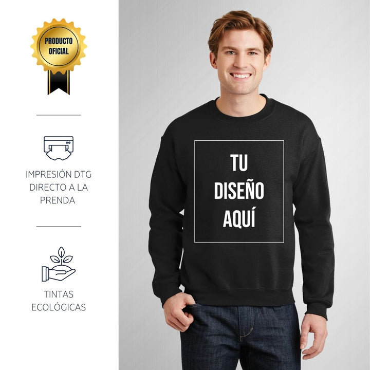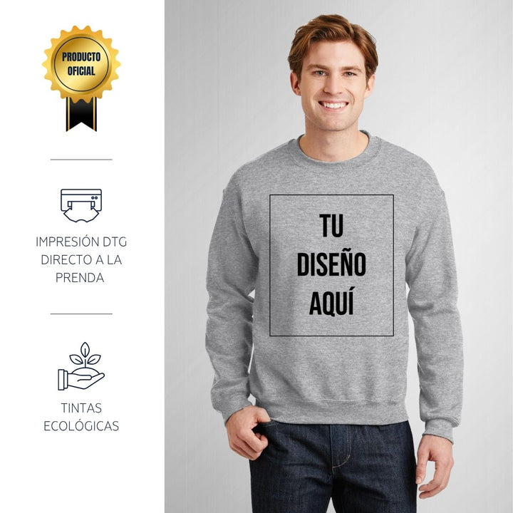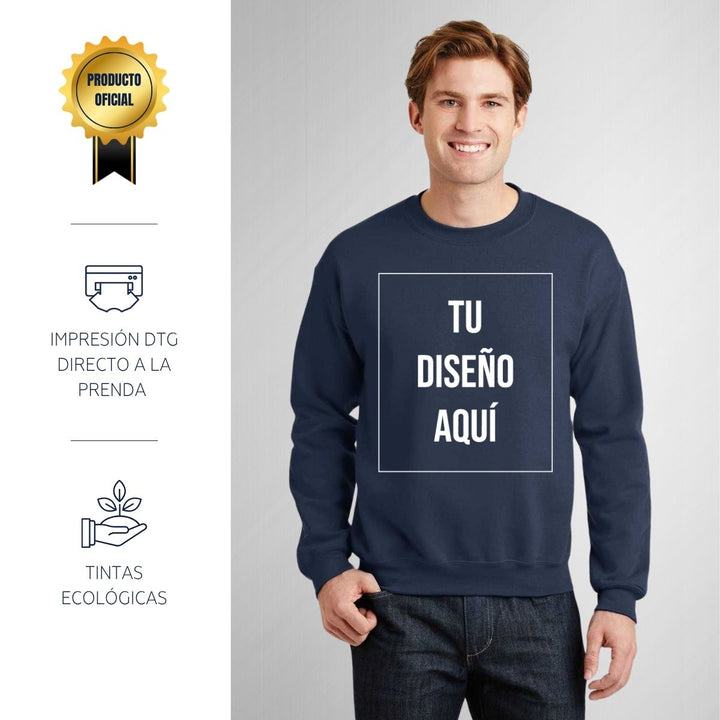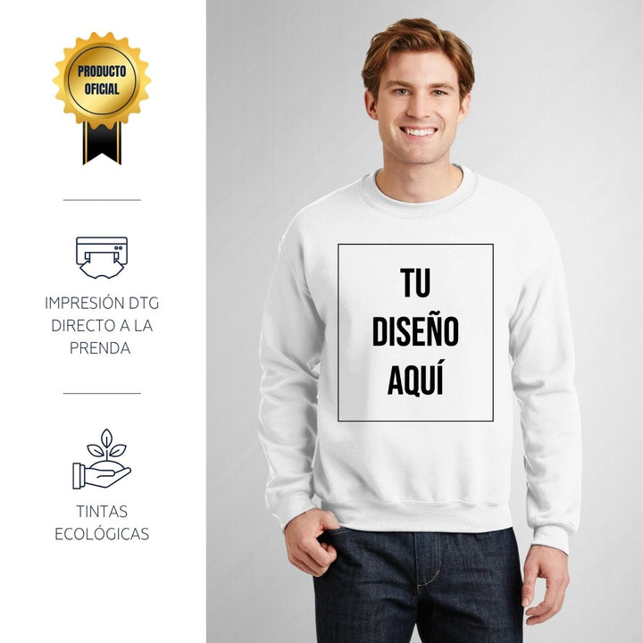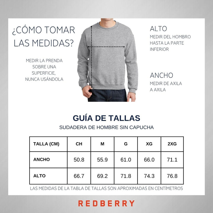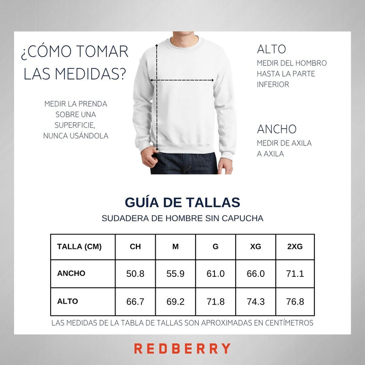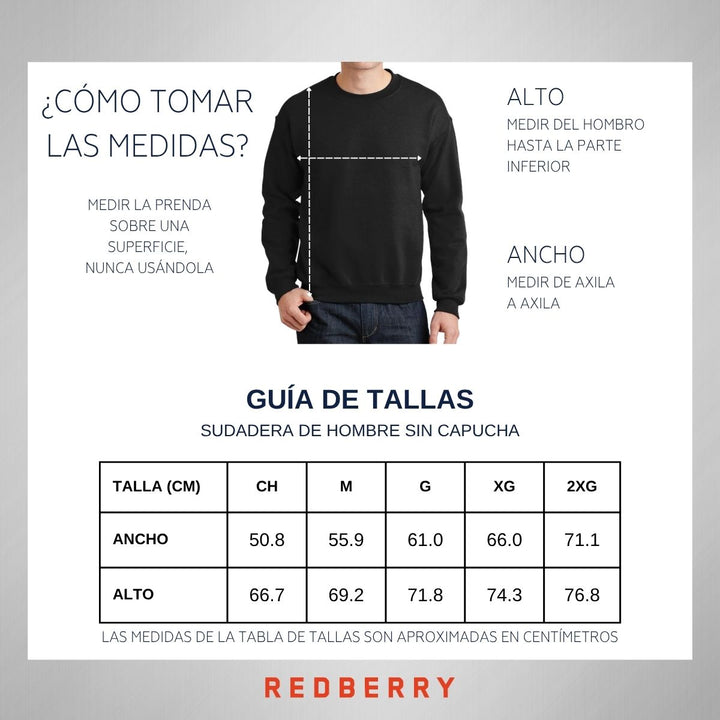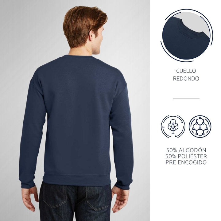 Sudadera de adulto cuello redondo sin gorro o capucha, para hombre nueva, diseño personalizado impreso con tecnología DTG (directo a la prenda) tacto cero, uso casual o deportiva, 50% algodón y 50% poliéster, estructura sin costura en los costados con ajuste clásico. Colores de sudadera: Negro, Blanco, Azul Marino, Gris.