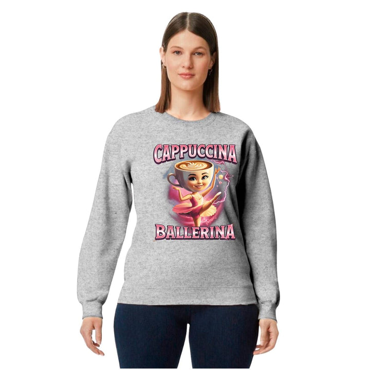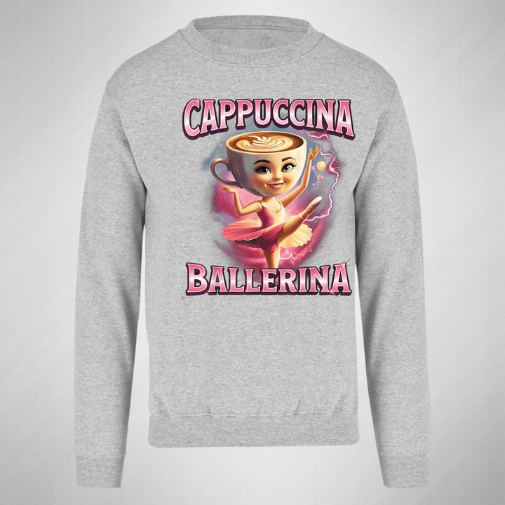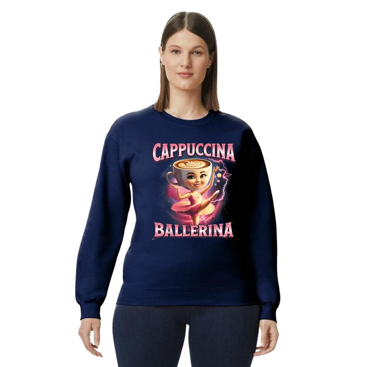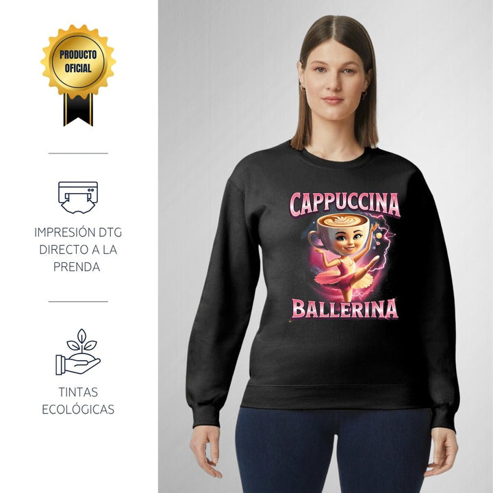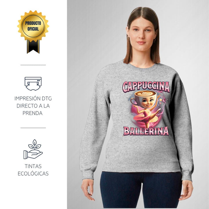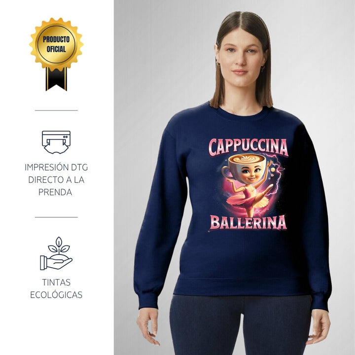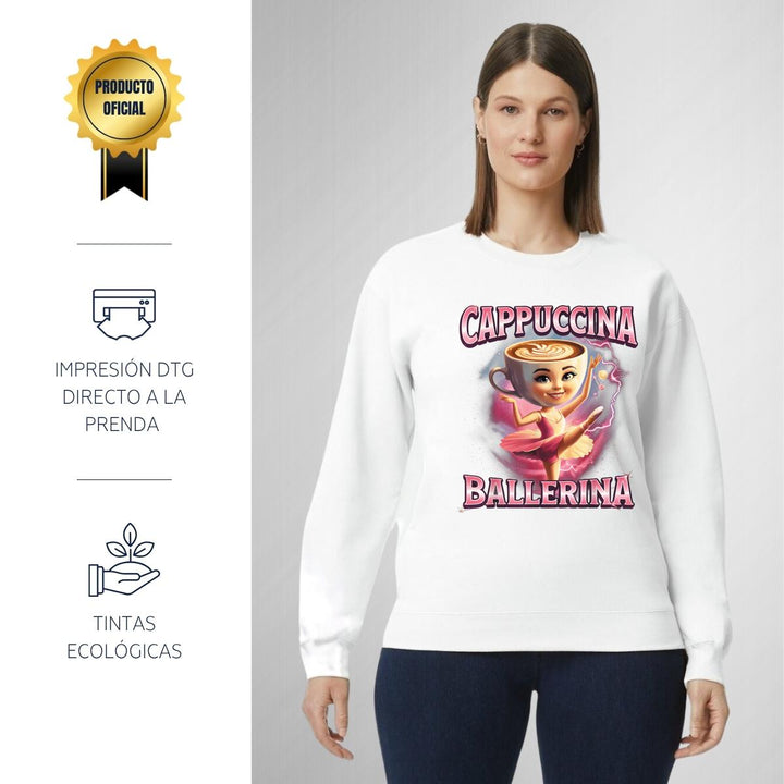 Sudadera de adulto cuello redondo sin gorro o capucha, para mujer nueva, diseño Brainrot Ballerina Capuchina original impreso con tecnología DTG (directo a la prenda) tacto cero, uso casual o deportiva, 50% algodón y 50% poliéster, estructura sin costura en los costados con ajuste clásico. Colores de sudadera: Negro, Blanco, Azul Marino, Gris.