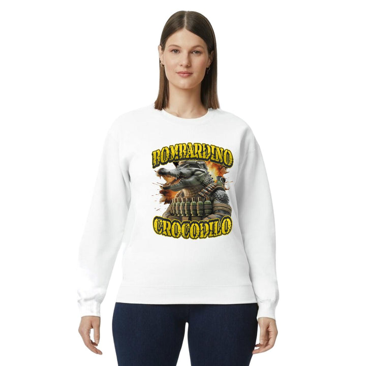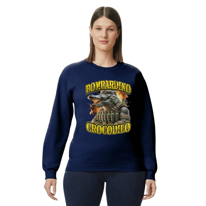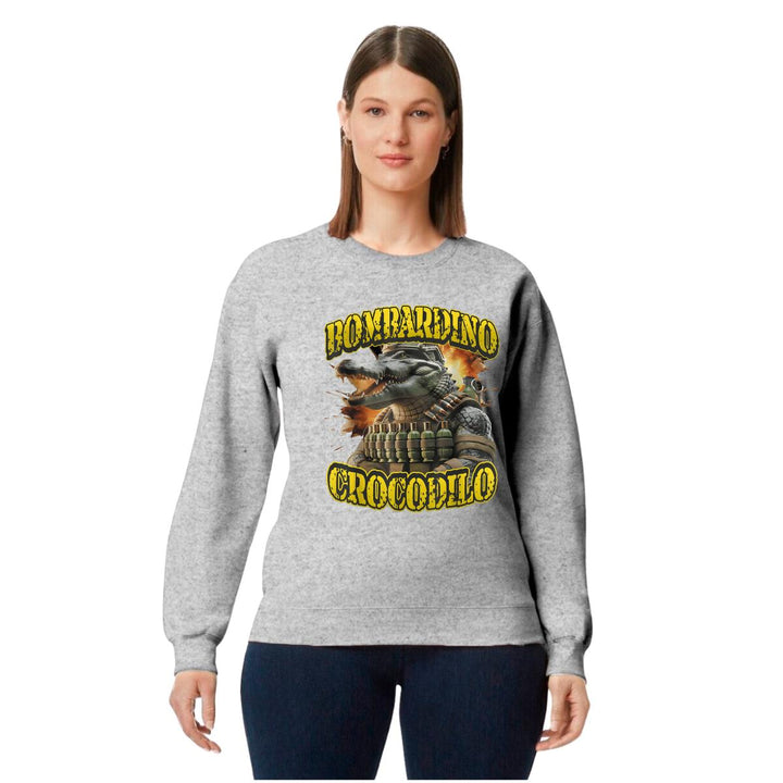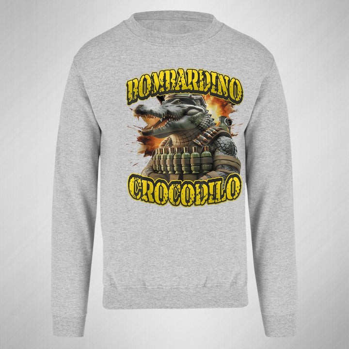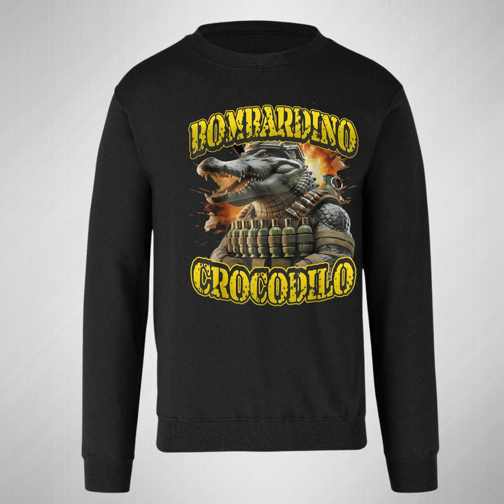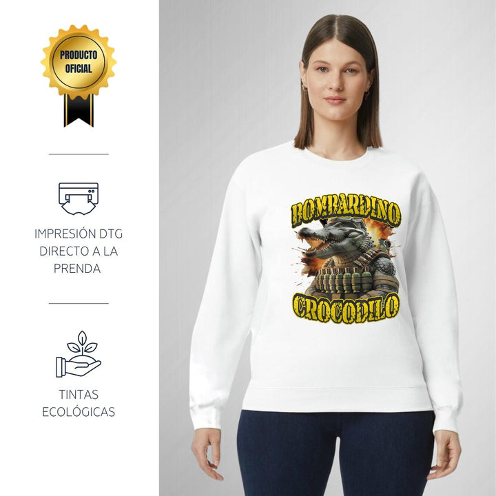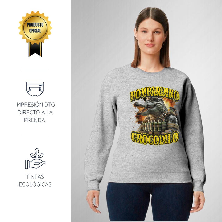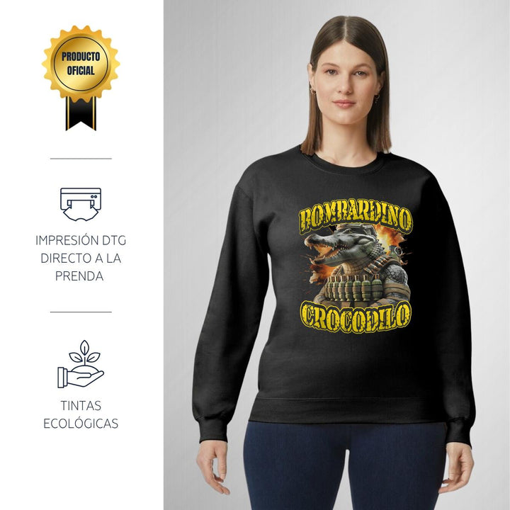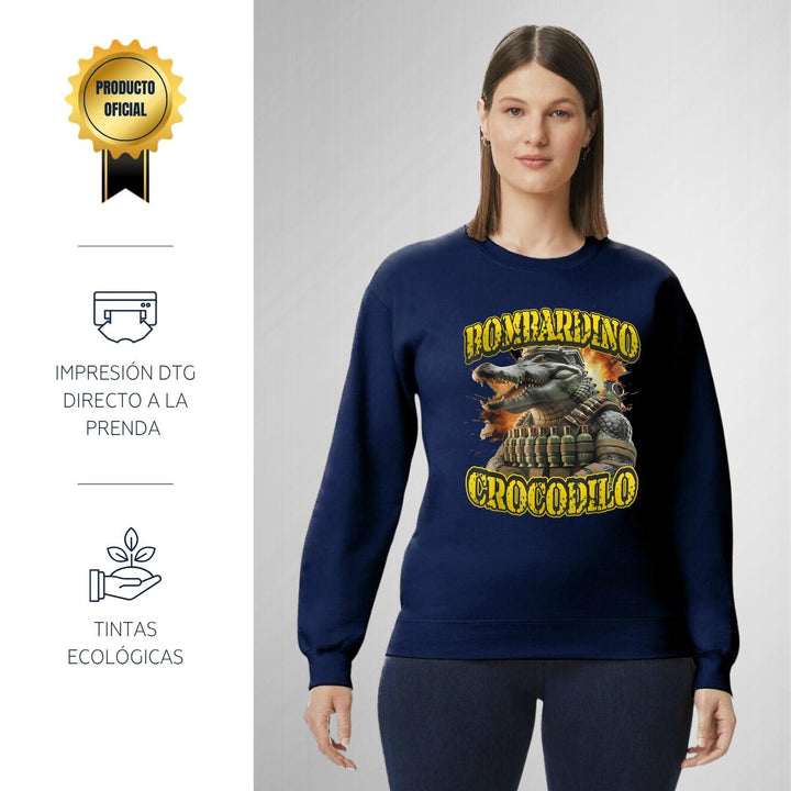 Sudadera de adulto cuello redondo sin gorro o capucha, para mujer nueva, diseño Brainrot Bombardino Cocodrilo original impreso con tecnología DTG (directo a la prenda) tacto cero, uso casual o deportiva, 50% algodón y 50% poliéster, estructura sin costura en los costados con ajuste clásico. Colores de sudadera: Negro, Blanco, Azul Marino, Gris.