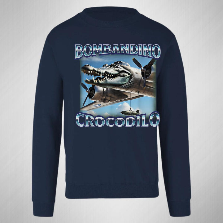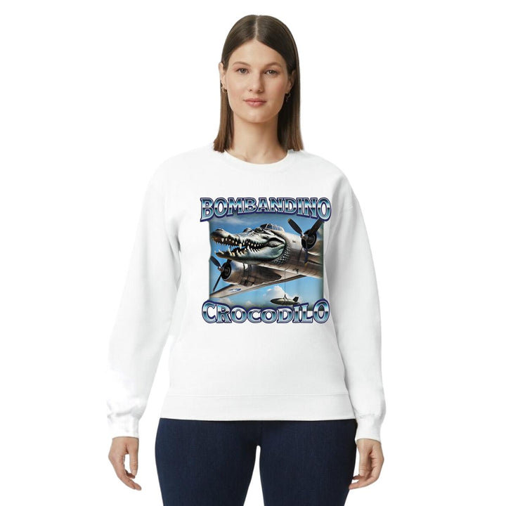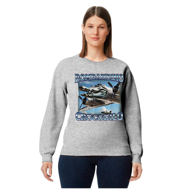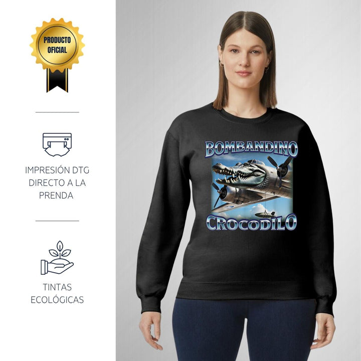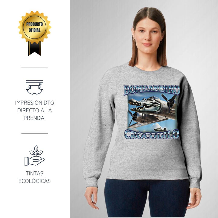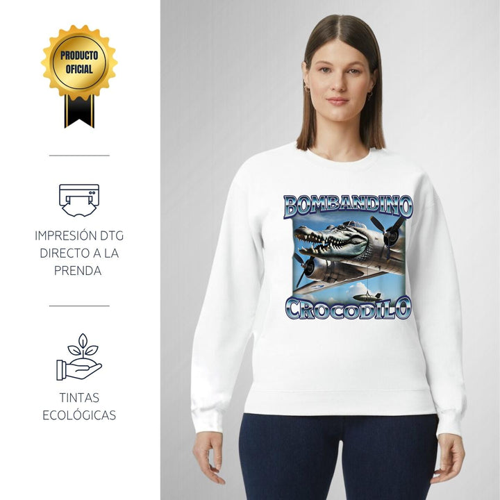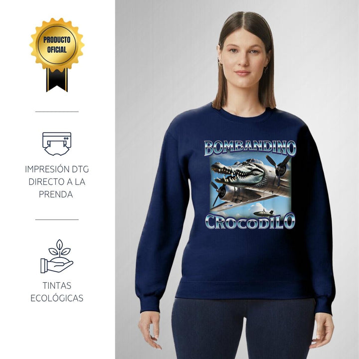 Sudadera de adulto cuello redondo sin gorro o capucha, para mujer nueva, diseño Brainrot Bombardino Cocodrilo original impreso con tecnología DTG (directo a la prenda) tacto cero, uso casual o deportiva, 50% algodón y 50% poliéster, estructura sin costura en los costados con ajuste clásico. Colores de sudadera: Negro, Blanco, Azul Marino, Gris.
