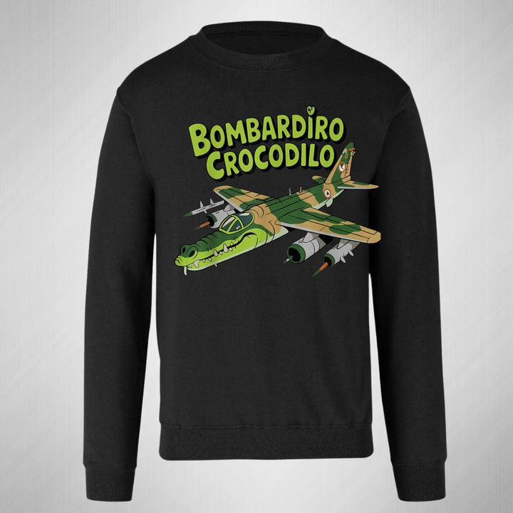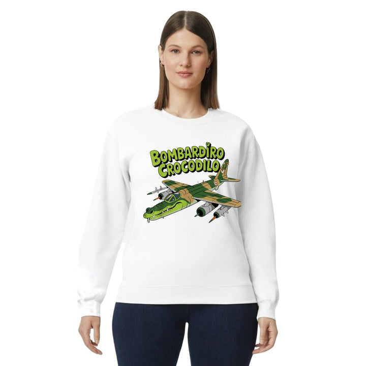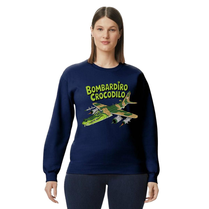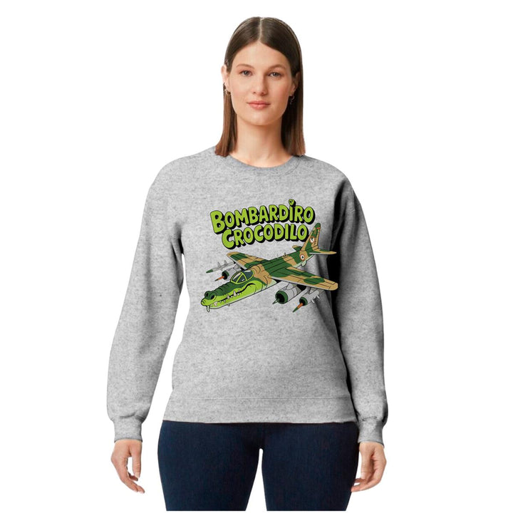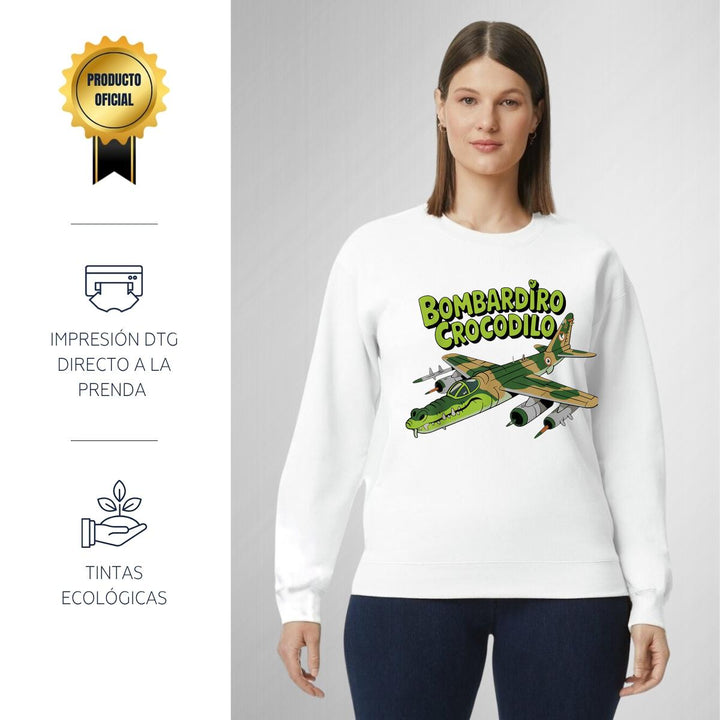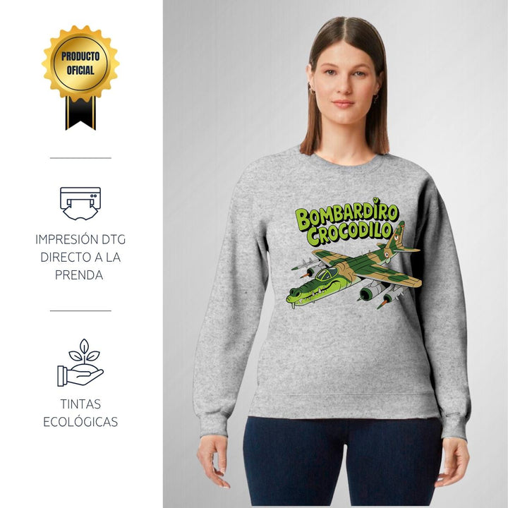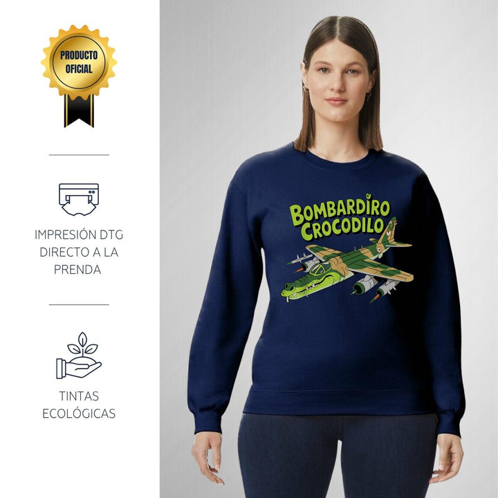 Sudadera de adulto cuello redondo sin gorro o capucha, para mujer nueva, diseño Brainrot Bombardiro Crocodilo original impreso con tecnología DTG (directo a la prenda) tacto cero, uso casual o deportiva, 50% algodón y 50% poliéster, estructura sin costura en los costados con ajuste clásico. Colores de sudadera: Negro, Blanco, Azul Marino, Gris.
