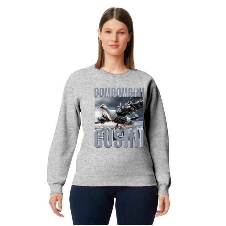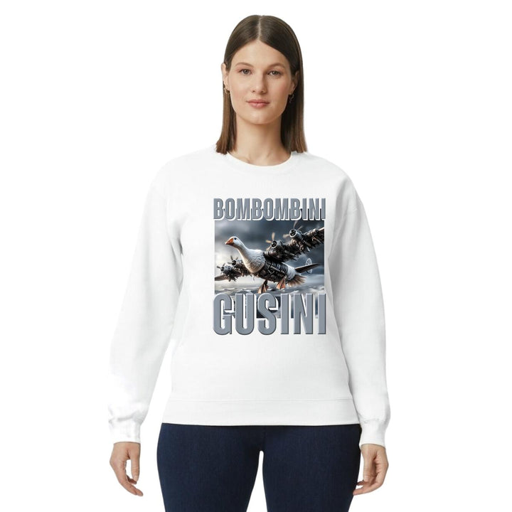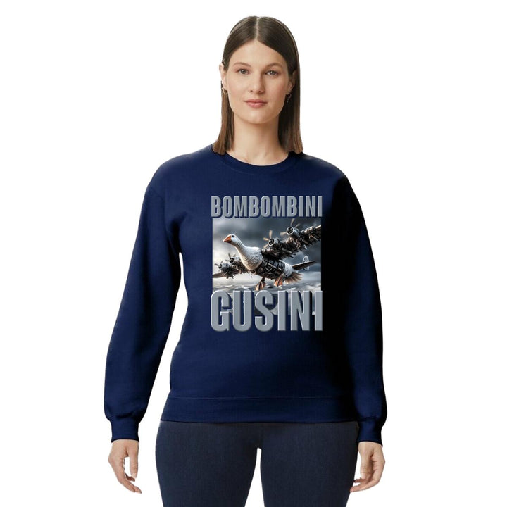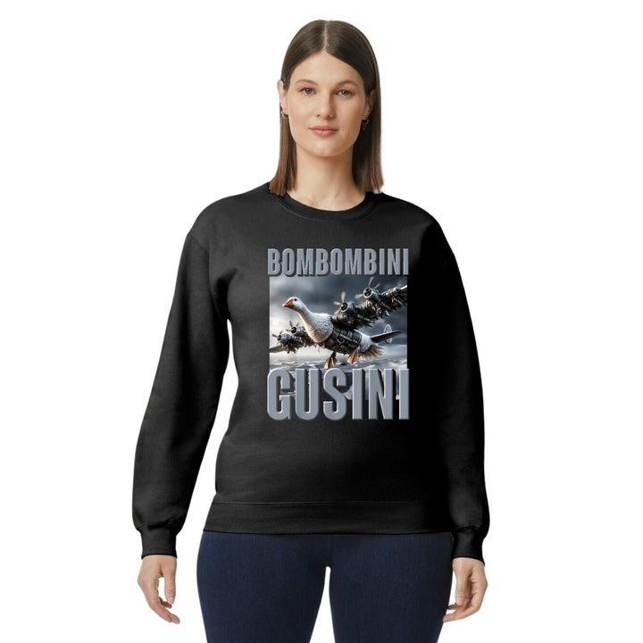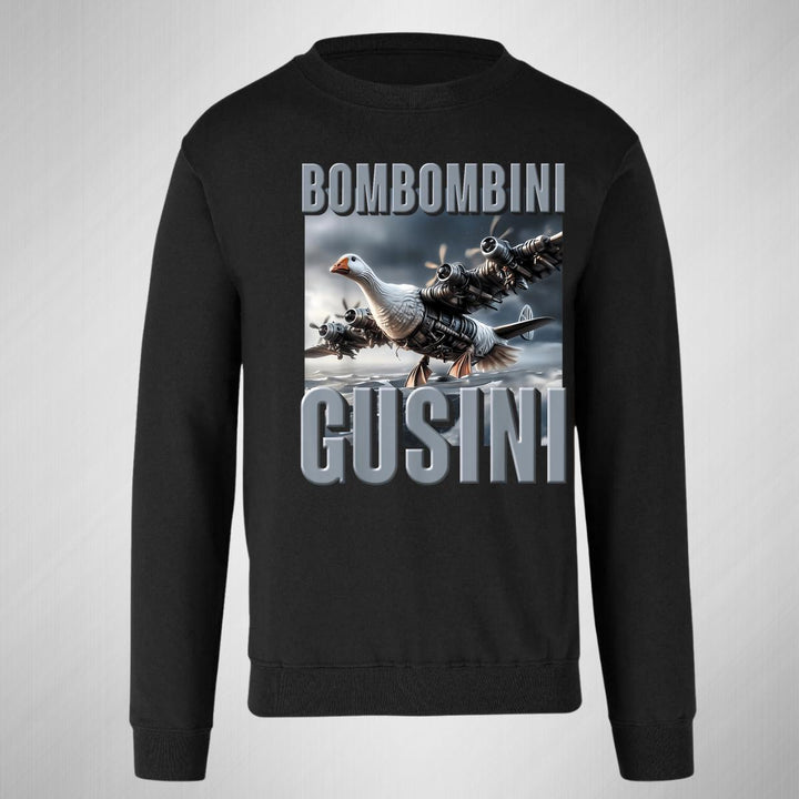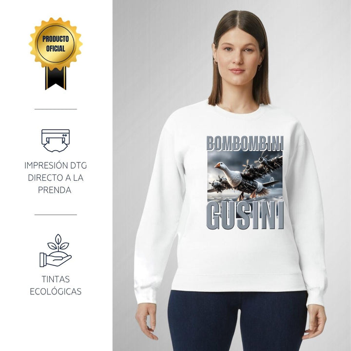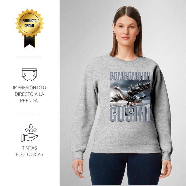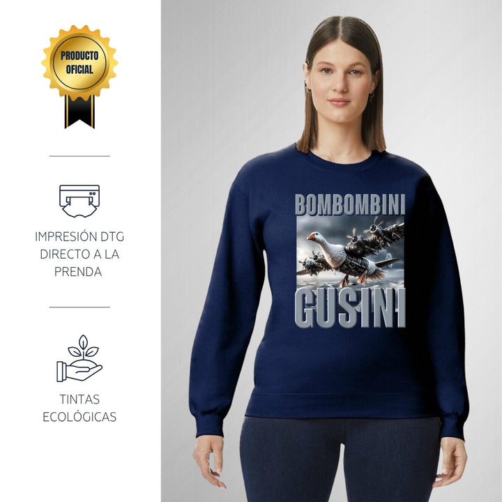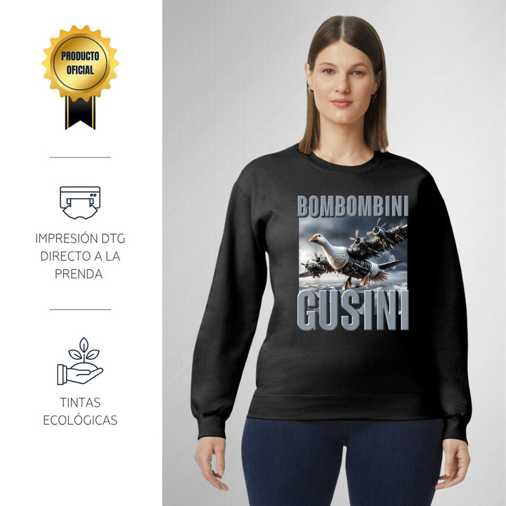Sudadera de adulto cuello redondo sin gorro o capucha, para mujer nueva, diseño Brainrot Bombombini Gusini original impreso con tecnología DTG (directo a la prenda) tacto cero, uso casual o deportiva, 50% algodón y 50% poliéster, estructura sin costura en los costados con ajuste clásico. Colores de sudadera: Negro, Blanco, Azul Marino, Gris.