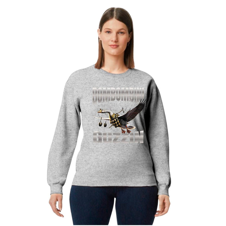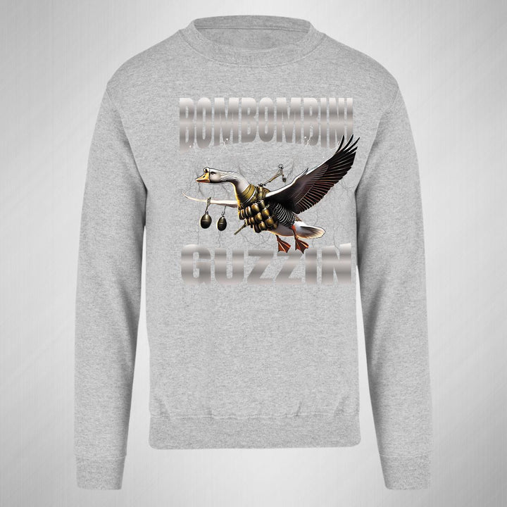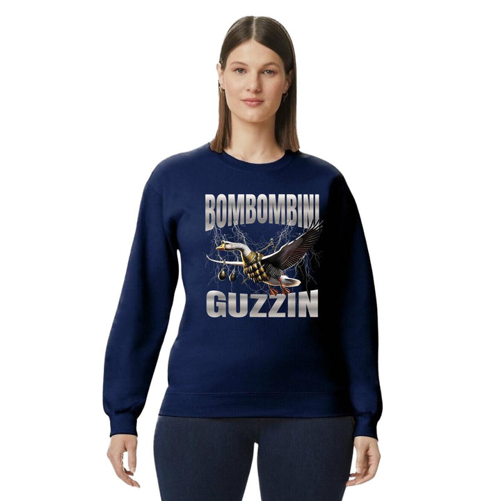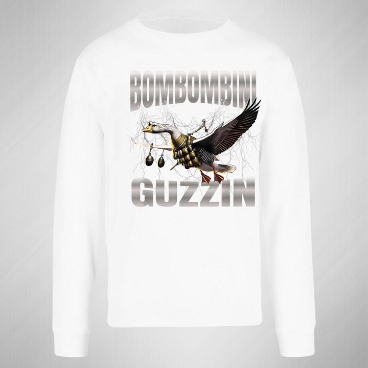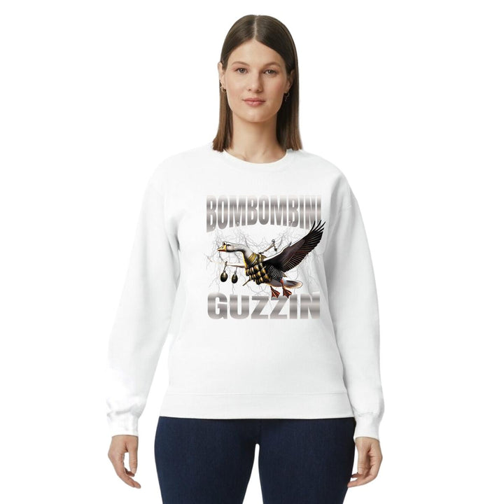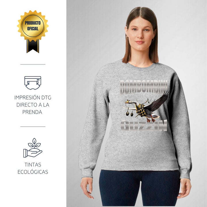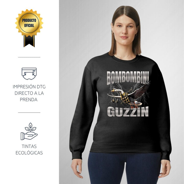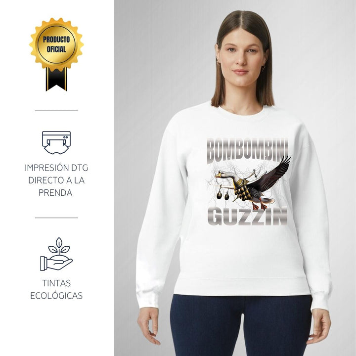 Sudadera de adulto cuello redondo sin gorro o capucha, para mujer nueva, diseño Brainrot Bombombini Gusini original impreso con tecnología DTG (directo a la prenda) tacto cero, uso casual o deportiva, 50% algodón y 50% poliéster, estructura sin costura en los costados con ajuste clásico. Colores de sudadera: Negro, Blanco, Azul Marino, Gris.