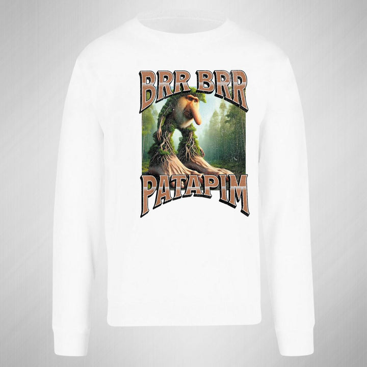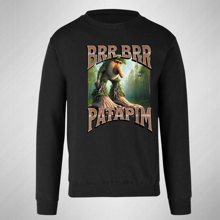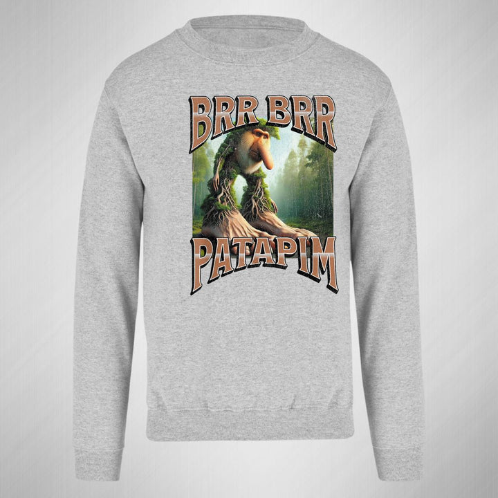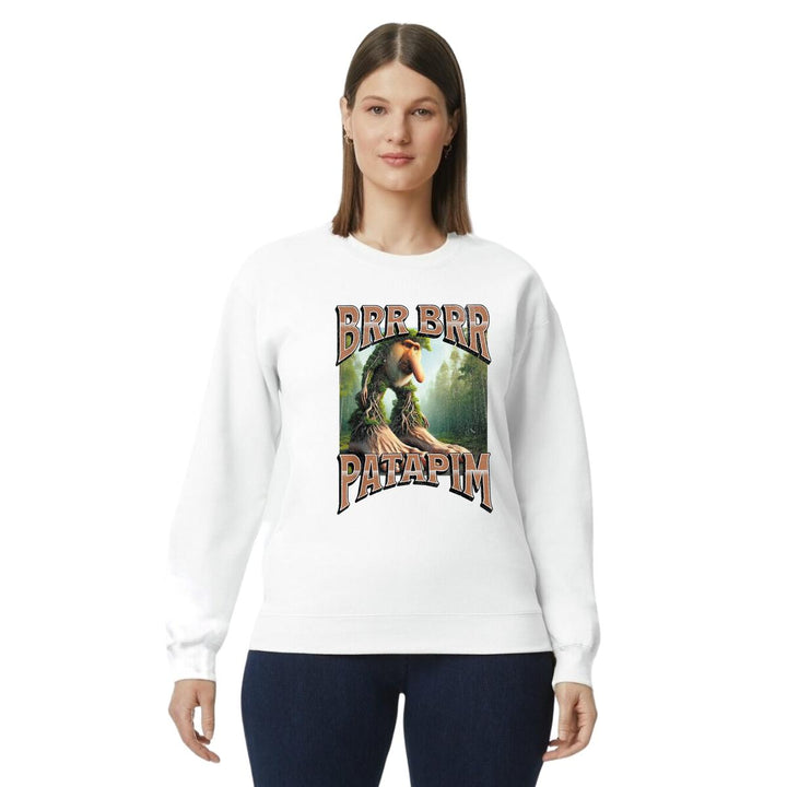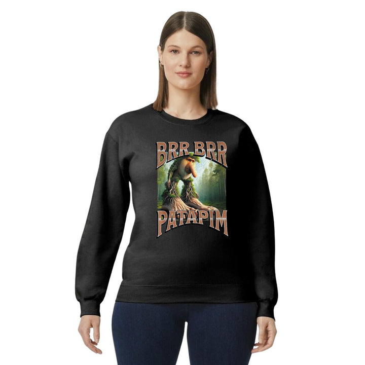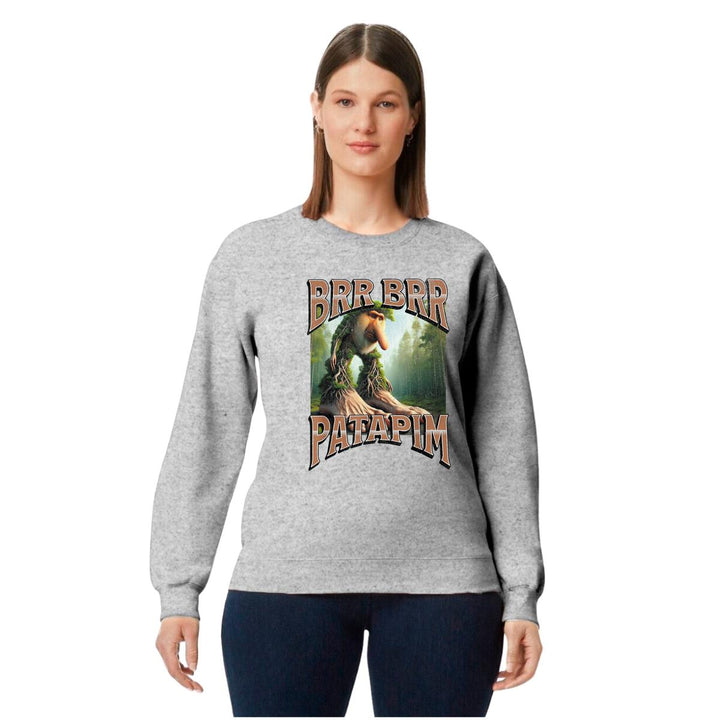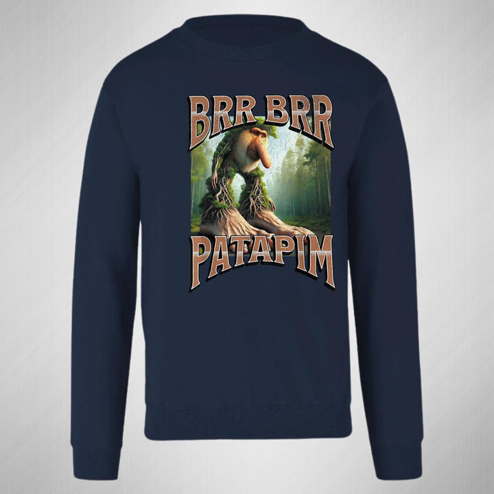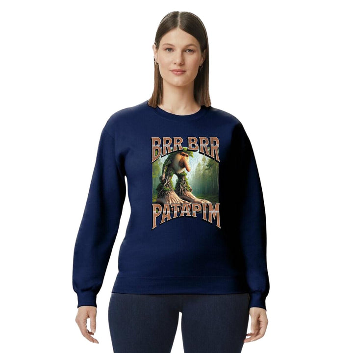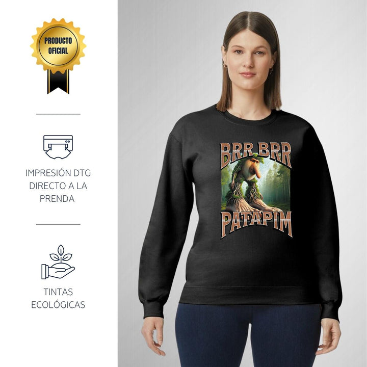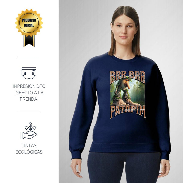 Sudadera de adulto cuello redondo sin gorro o capucha, para mujer nueva, diseño Brainrot Brr Brr Patapim original impreso con tecnología DTG (directo a la prenda) tacto cero, uso casual o deportiva, 50% algodón y 50% poliéster, estructura sin costura en los costados con ajuste clásico. Colores de sudadera: Negro, Blanco, Azul Marino, Gris.