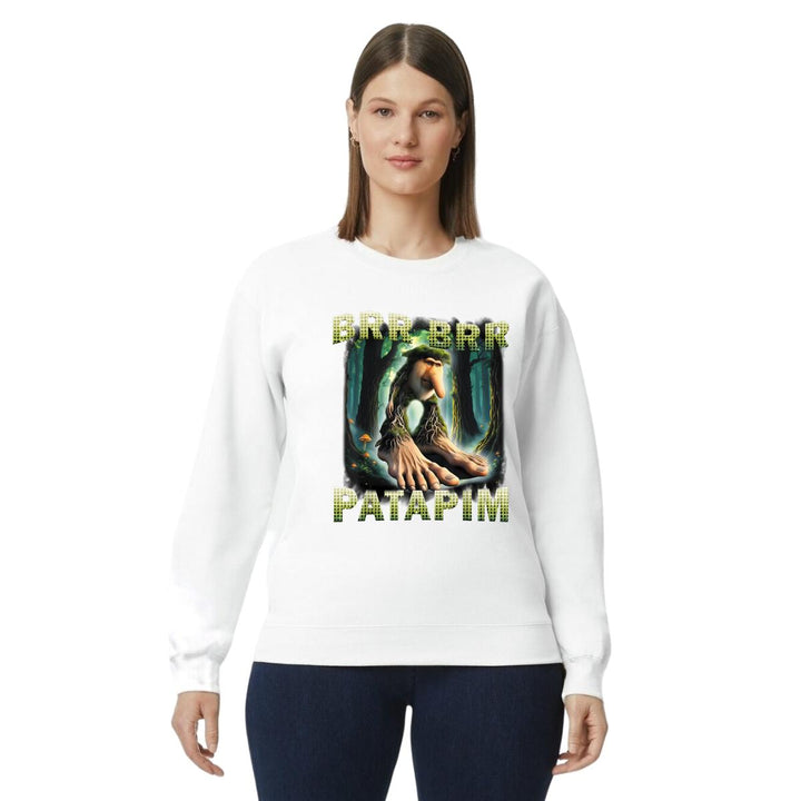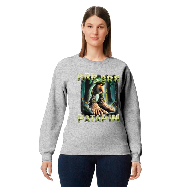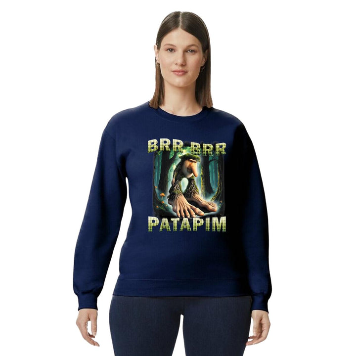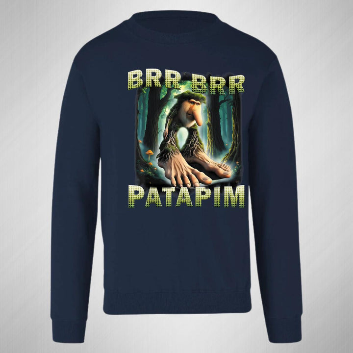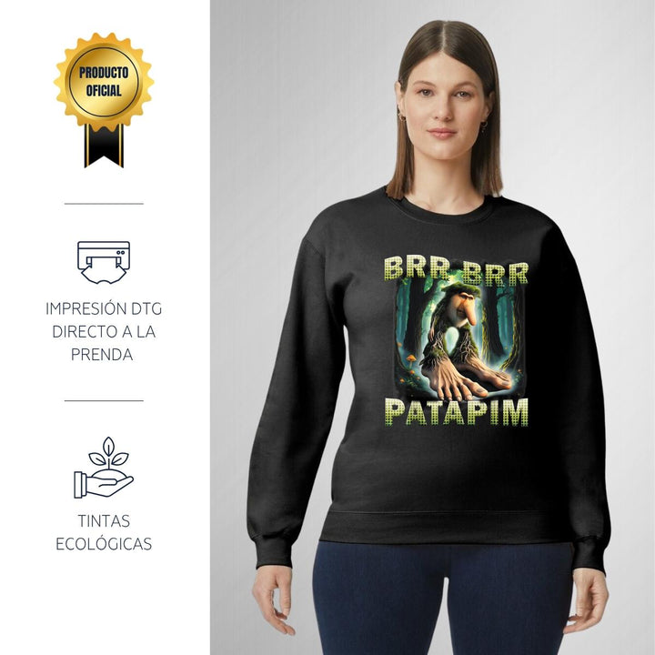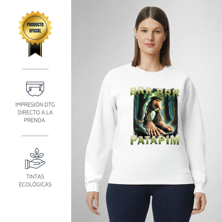 Sudadera de adulto cuello redondo sin gorro o capucha, para mujer nueva, diseño Brainrot Brr Brr Patapim original impreso con tecnología DTG (directo a la prenda) tacto cero, uso casual o deportiva, 50% algodón y 50% poliéster, estructura sin costura en los costados con ajuste clásico. Colores de sudadera: Negro, Blanco, Azul Marino, Gris.