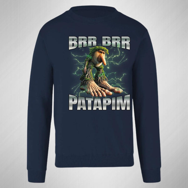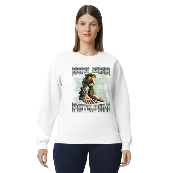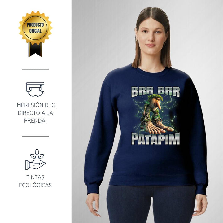 Sudadera de adulto cuello redondo sin gorro o capucha, para mujer nueva, diseño Brainrot Brr Brr Patapim original impreso con tecnología DTG (directo a la prenda) tacto cero, uso casual o deportiva, 50% algodón y 50% poliéster, estructura sin costura en los costados con ajuste clásico. Colores de sudadera: Negro, Blanco, Azul Marino, Gris.