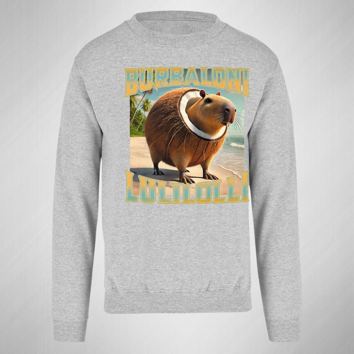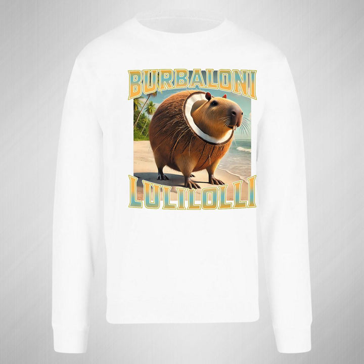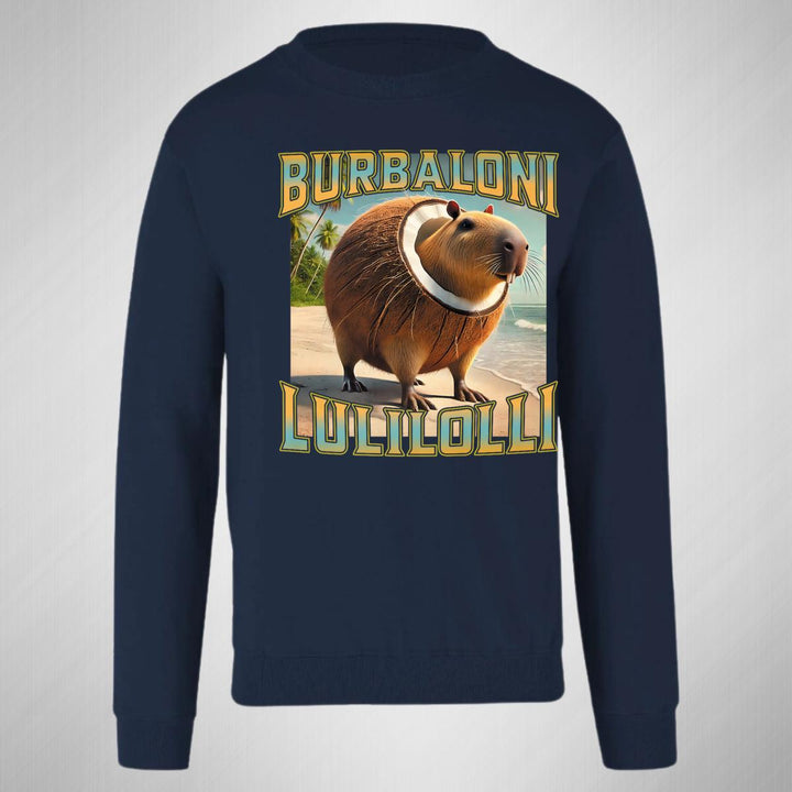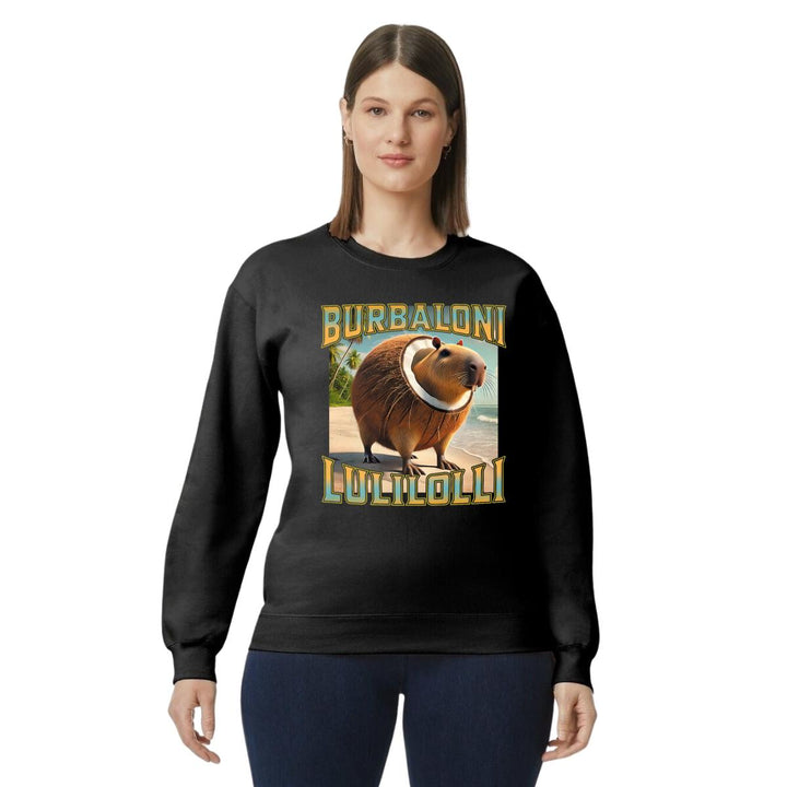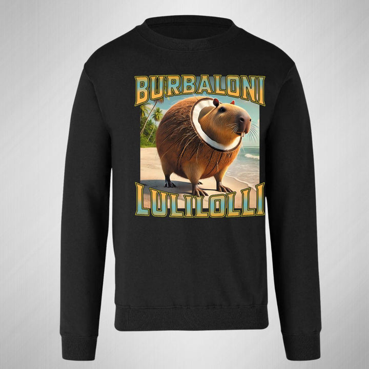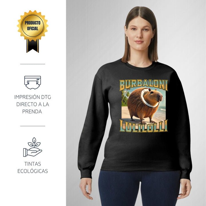 Sudadera de adulto cuello redondo sin gorro o capucha, para mujer nueva, diseño Brainrot Burbaloni Luliloli original impreso con tecnología DTG (directo a la prenda) tacto cero, uso casual o deportiva, 50% algodón y 50% poliéster, estructura sin costura en los costados con ajuste clásico. Colores de sudadera: Negro, Azul Marino.