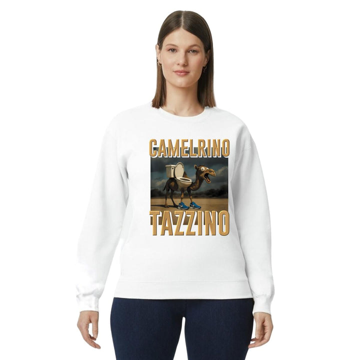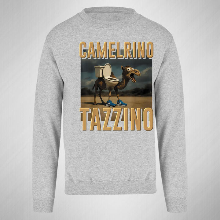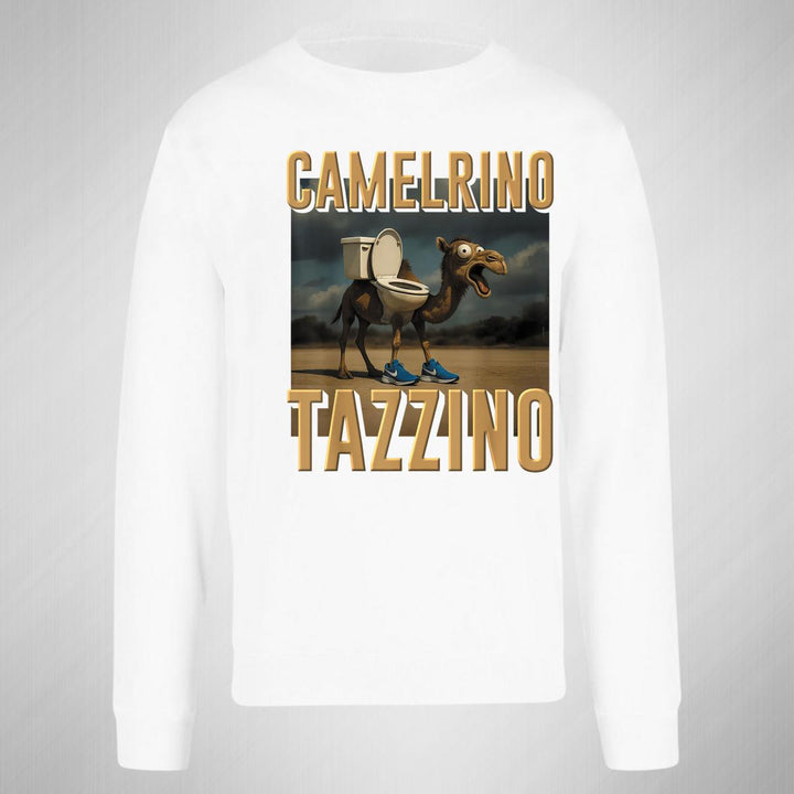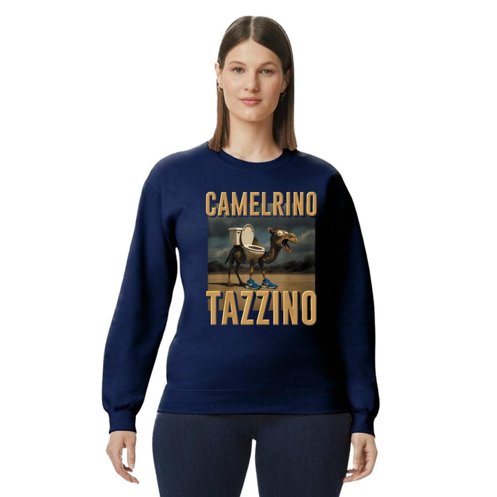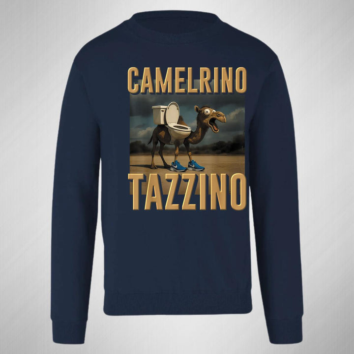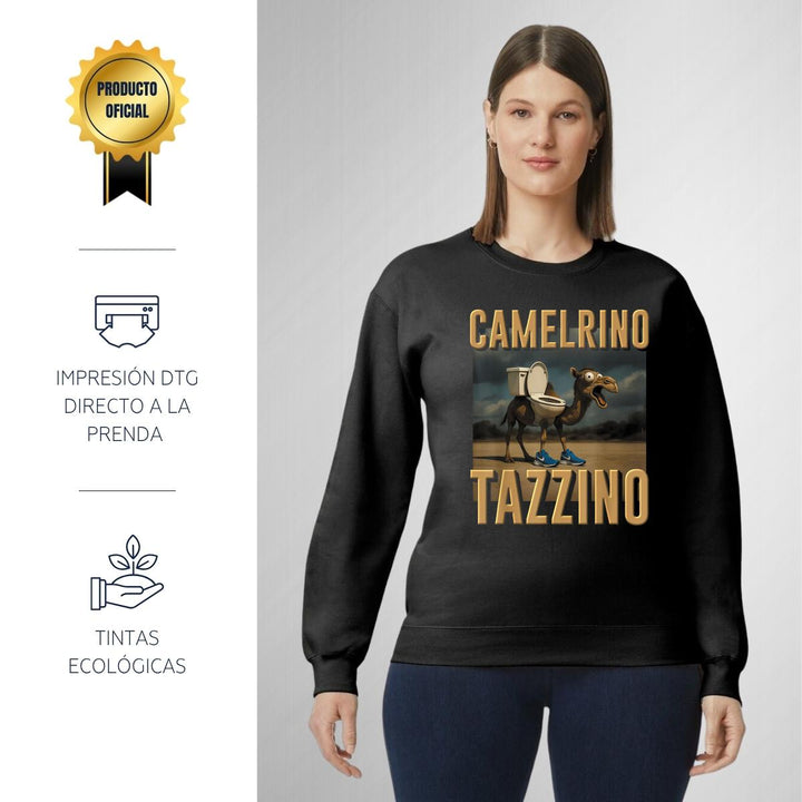 Sudadera de adulto cuello redondo sin gorro o capucha, para mujer nueva, diseño Brainrot Camelrino Tazzino original impreso con tecnología DTG (directo a la prenda) tacto cero, uso casual o deportiva, 50% algodón y 50% poliéster, estructura sin costura en los costados con ajuste clásico. Colores de sudadera: Negro, Blanco, Azul Marino, Gris.