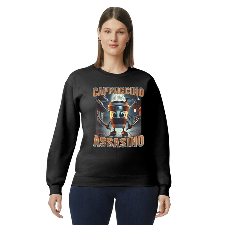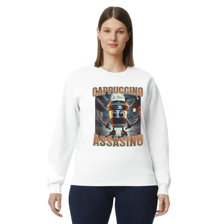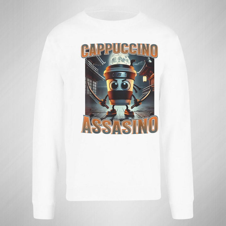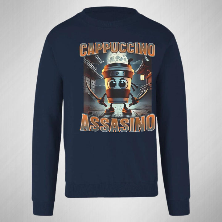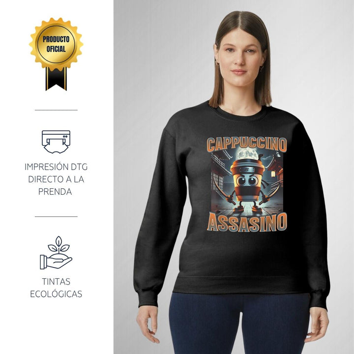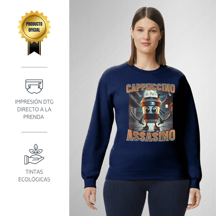 Sudadera de adulto cuello redondo sin gorro o capucha, para mujer nueva, diseño Brainrot Cappuccino Assassino original impreso con tecnología DTG (directo a la prenda) tacto cero, uso casual o deportiva, 50% algodón y 50% poliéster, estructura sin costura en los costados con ajuste clásico. Colores de sudadera: Negro, Blanco, Azul Marino, Gris.