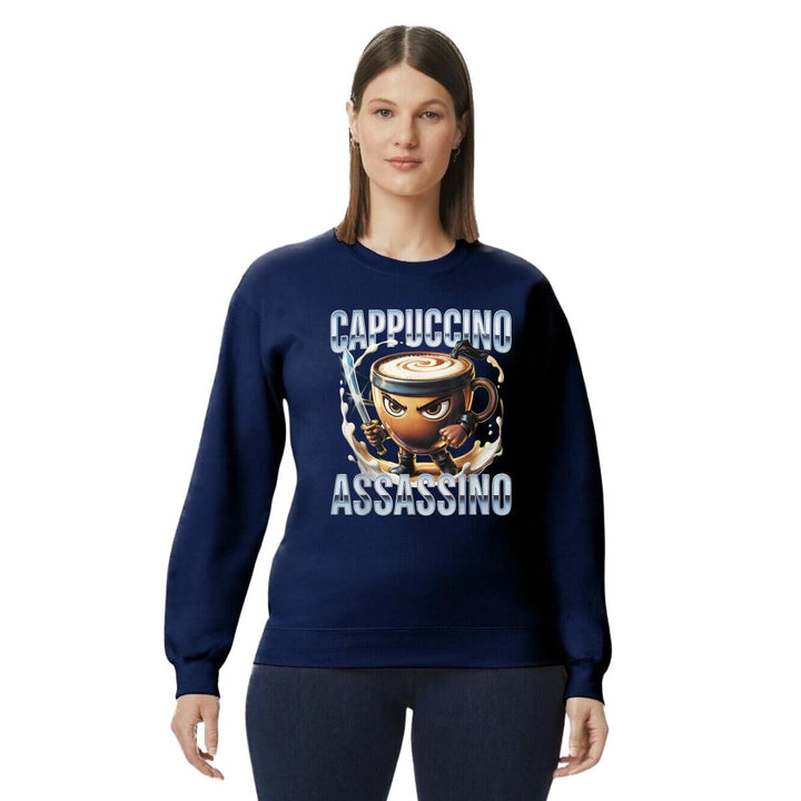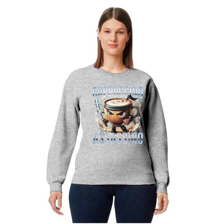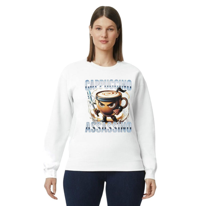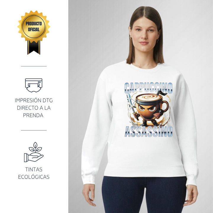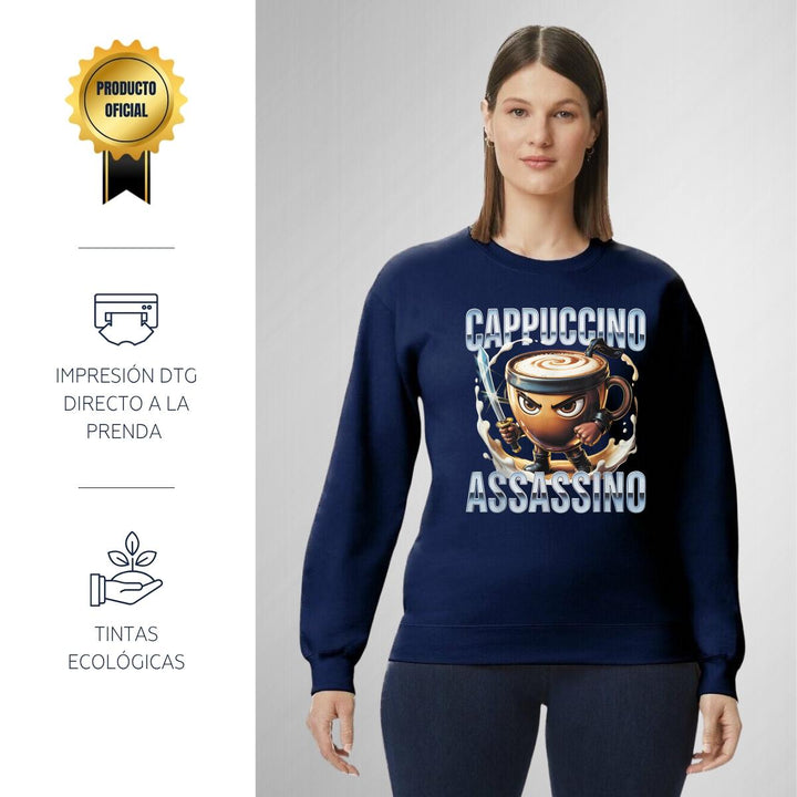 Sudadera de adulto cuello redondo sin gorro o capucha, para mujer nueva, diseño Brainrot Cappuccino Assassino original impreso con tecnología DTG (directo a la prenda) tacto cero, uso casual o deportiva, 50% algodón y 50% poliéster, estructura sin costura en los costados con ajuste clásico. Colores de sudadera: Negro, Blanco, Azul Marino, Gris.