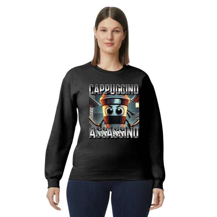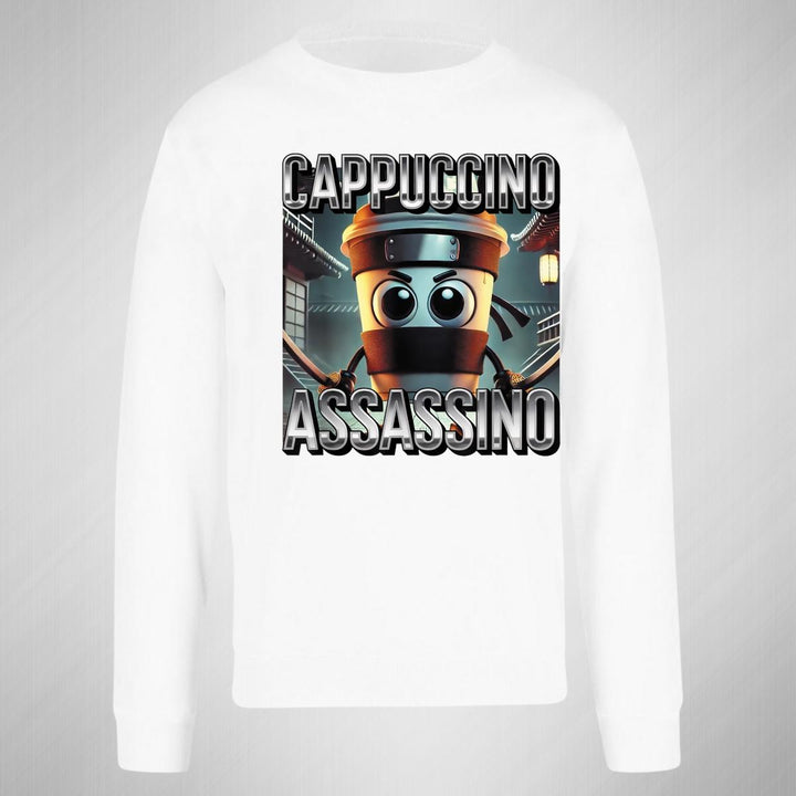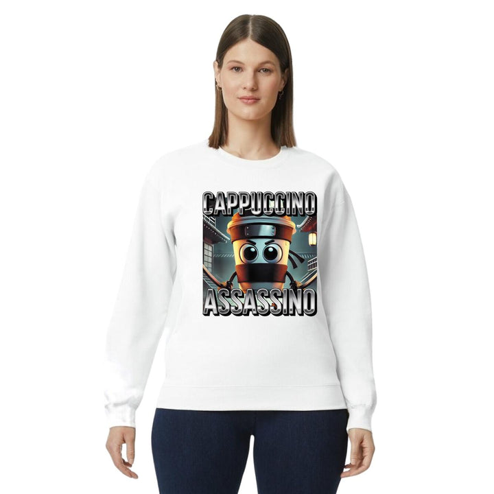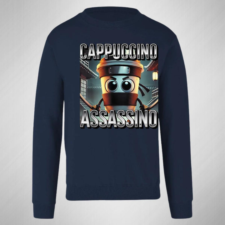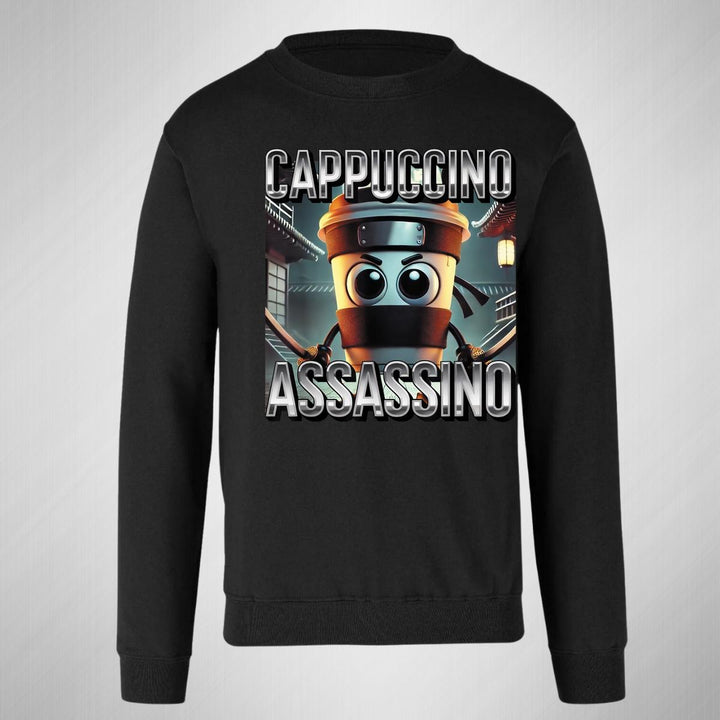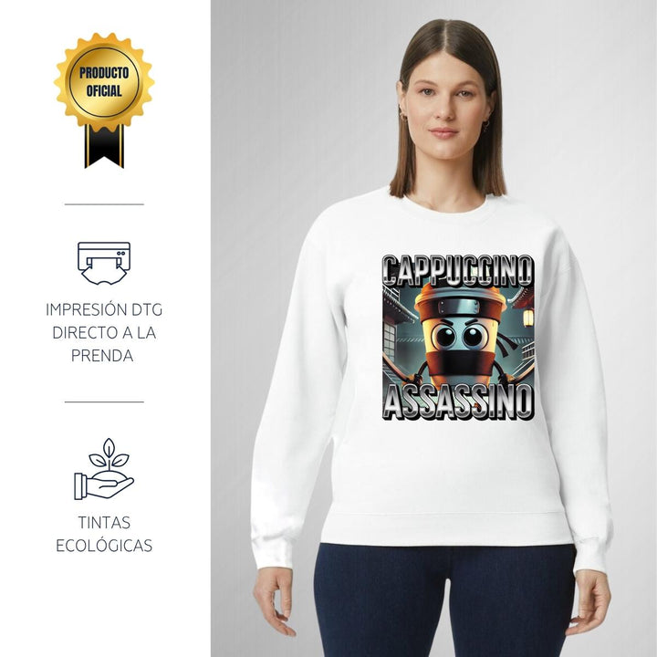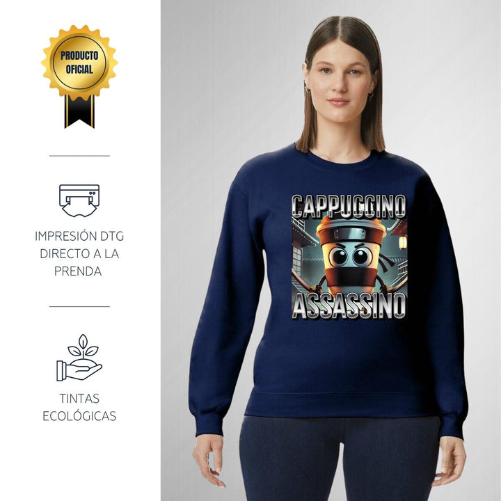 Sudadera de adulto cuello redondo sin gorro o capucha, para mujer nueva, diseño Brainrot Cappuccino Assassino original impreso con tecnología DTG (directo a la prenda) tacto cero, uso casual o deportiva, 50% algodón y 50% poliéster, estructura sin costura en los costados con ajuste clásico. Colores de sudadera: Negro, Blanco, Azul Marino, Gris.